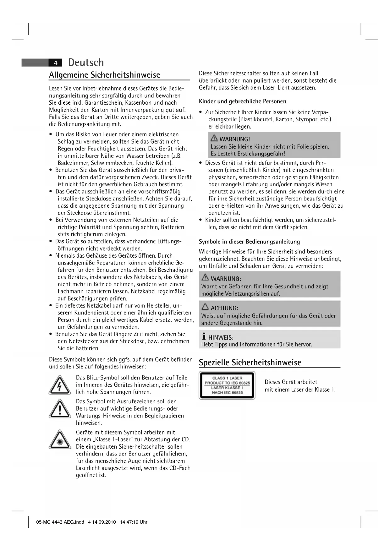 BEDIENUNGSANLEITUNG MC 4443 CD AEG