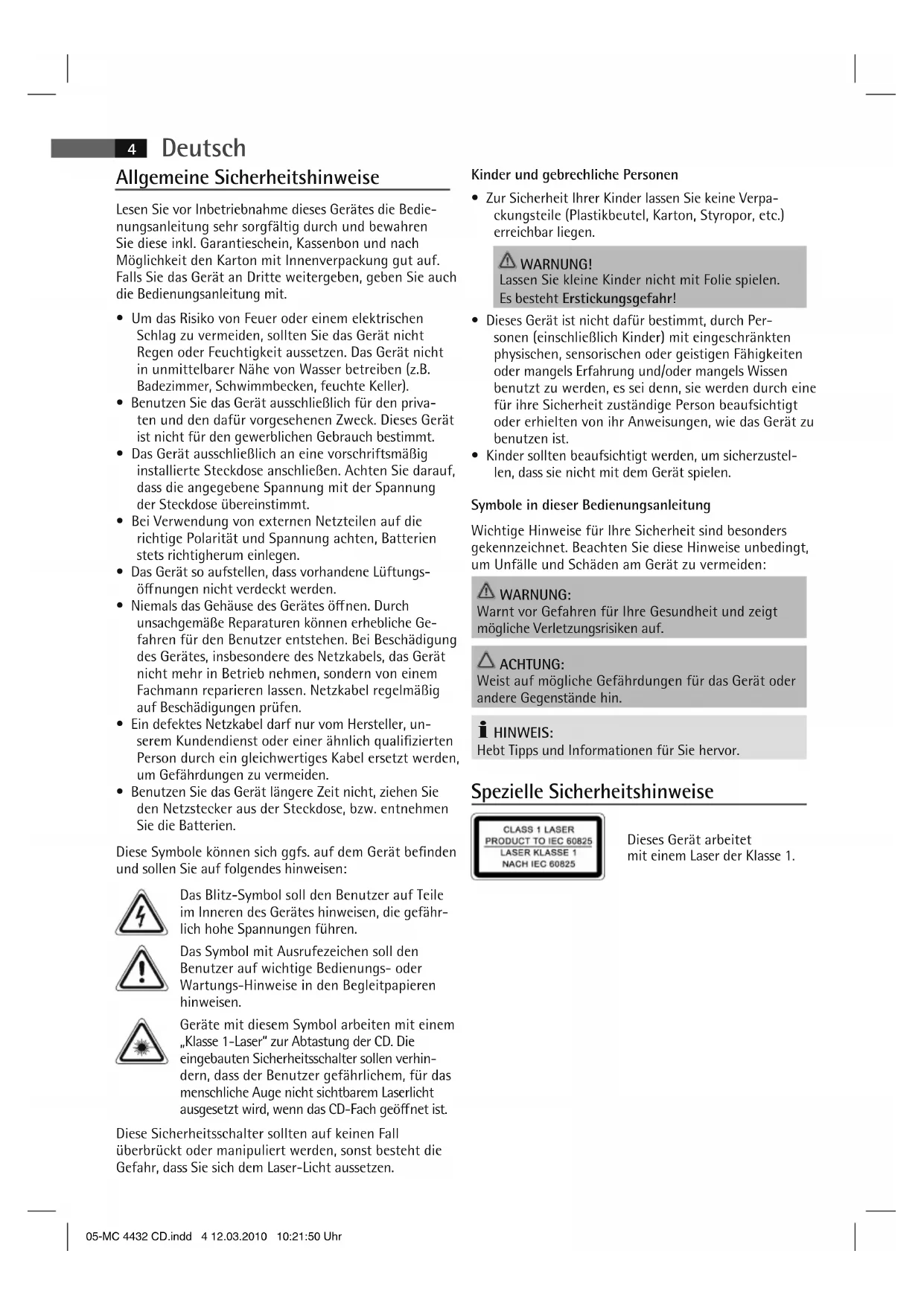- Kinder sollten beaufsichtigt werden, um sicherzustel- len, dass sie nicht mit dem Gerät spielen. Symbole in dieser Bedienungsanleitung Wichtige Hinweise für Ihre Sicherheit sind besonders gekennzeichnet. Beachten Sie diese Hinweise unbedingt, um Unfälle und Schäden am Gerät zu vermeiden: WARNUNG: Warnt vor Gefahren für Ihre Gesundheit und zeigt mögliche Verletzungsrisiken auf. ACHTUNG: Weist auf mögliche Gefährdungen für das Gerät oder andere Gegenstände hin. HINWEIS: Hebt Tipps und Informationen für Sie hervor. Spezielle Sicherheitshinweise Dieses Gerät arbeitet mit einem Laser der Klasse 1. 05-MC 4432 CD.indd 4 12.03.2010 10:21:50 UhrDeutsch