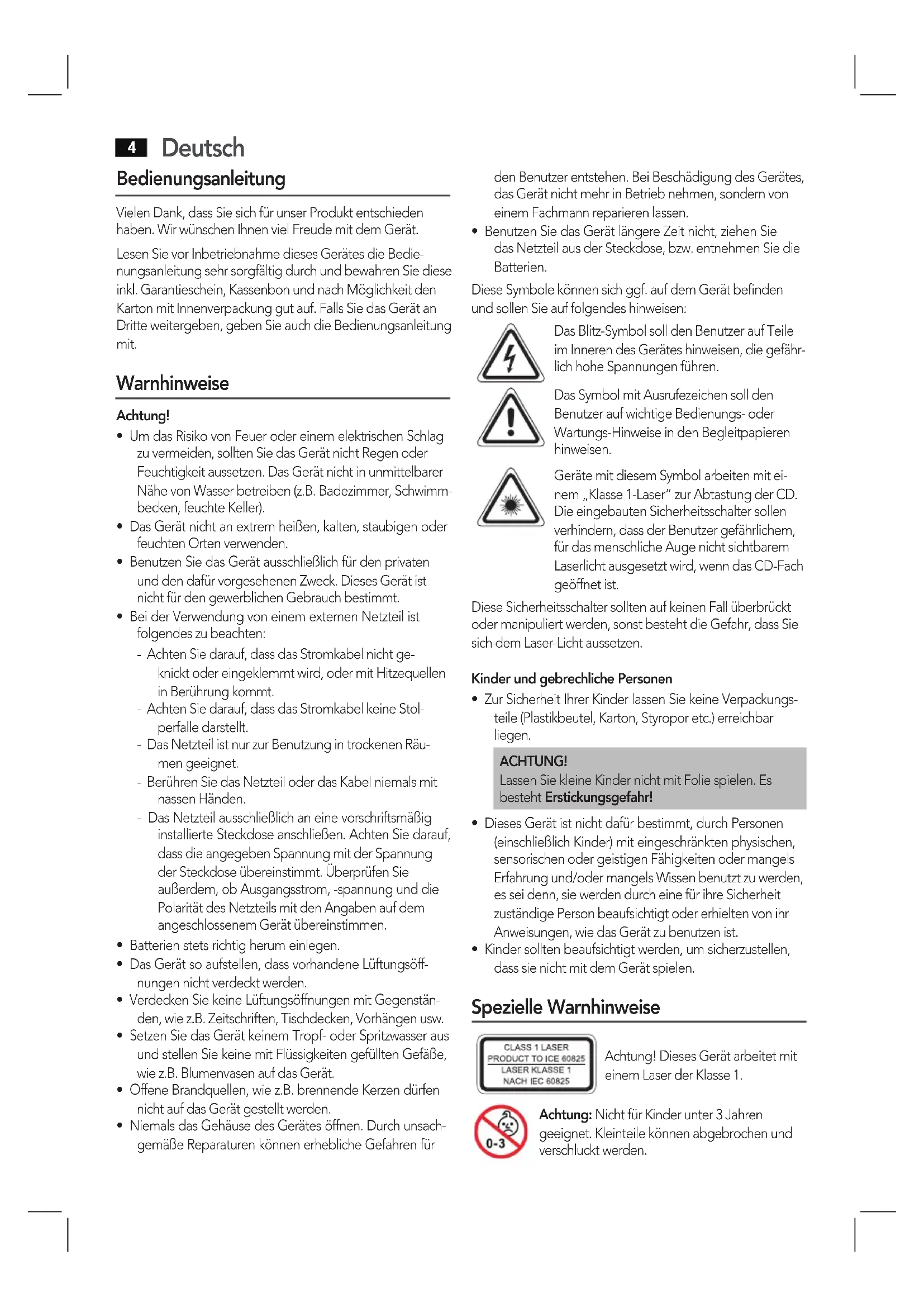 - Benutzen Sie das Gerät längere Zeit nicht, ziehen Sie das Netzteil aus der Steckdose, bzw. entnehmen Sie die Batterien. Diese Symbole können sich ggf. auf dem Gerät befinden und sollen Sie auf folgendes hinweisen: Das Blitz-Symbol soll den Benutzer auf Teile im Inneren des Gerätes hinweisen, die gefähr- lich hohe Spannungen führen. Das Symbol mit Ausrufezeichen soll den Benutzer auf wichtige Bedienungs- oder Wartungs-Hinweise in den Begleitpapieren hinweisen. Geräte mit diesem Symbol arbeiten mit ei- nem „Klasse 1-Laser“ zur Abtastung der CD. Die eingebauten Sicherheitsschalter sollen verhindern, dass der Benutzer gefährlichem, für das menschliche Auge nicht sichtbarem Laserlicht ausgesetzt wird, wenn das CD-Fach geöffnet ist. Diese Sicherheitsschalter sollten auf keinen Fall überbrückt oder manipuliert werden, sonst besteht die Gefahr, dass Sie sich dem Laser-Licht aussetzen. Kinder und gebrechliche Personen