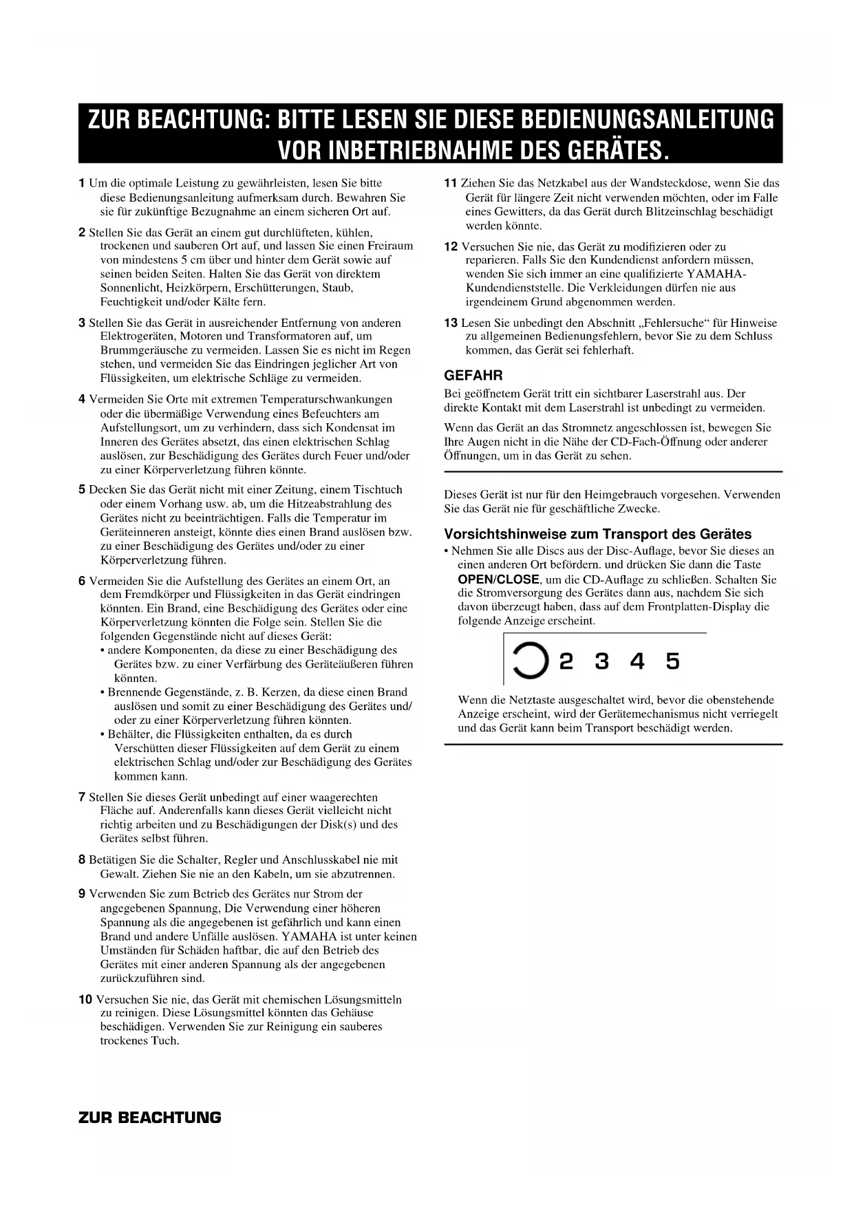 - Behälter, die Flüssigkeiten enthalten, da es durch Verschütten dieser Flüssigkeiten auf dem Gerät zu einem elektrischen Schlag und/oder zur Beschädigung des Gerätes kommen kann. 7 Stellen Sie dieses Gerät unbedingt auf einer waagerechten Fläche auf. Anderenfalls kann dieses Gerät vielleicht nicht richtig arbeiten und zu Beschädigungen der Disk(s) und des Gerätes selbst führen. 8 Betätigen Sie die Schalter, Regler und Anschlusskabel nie mit Gewalt. Ziehen Sie nie an den Kabeln, um sie abzutrennen. 9 Verwenden Sie zum Betrieb des Gerätes nur Strom der angegebenen Spannung, Die Verwendung einer höheren Spannung als die angegebenen ist gefährlich und kann einen Brand und andere Unfälle auslösen. YAMAHA ist unter keinen Umständen für Schäden haftbar, die auf den Betrieb des Gerätes mit einer anderen Spannung als der angegebenen zurückzuführen sind. 10 Versuchen Sie nie, das Gerät mit chemischen Lösungsmitteln zu reinigen. Diese Lösungsmittel könnten das Gehäuse beschädigen. Verwenden Sie zur Reinigung ein sauberes trockenes Tuch. 11 Ziehen Sie das Netzkabel aus der Wandsteckdose, wenn Sie das Gerät für längere Zeit nicht verwenden möchten, oder im Falle eines Gewitters, da das Gerät durch Blitzeinschlag beschädigt werden könnte. 12 Versuchen Sie nie, das Gerät zu modifizieren oder zu reparieren. Falls Sie den Kundendienst anfordern müssen, wenden Sie sich immer an eine qualifizierte YAMAHA- Kundendienststelle. Die Verkleidungen dürfen nie aus irgendeinem Grund abgenommen werden. 13 Lesen Sie unbedingt den Abschnitt „Fehlersuche“ für Hinweise zu allgemeinen Bedienungsfehlern, bevor Sie zu dem Schluss kommen, das Gerät sei fehlerhaft. GEFAHR Bei geöffnetem Gerät tritt ein sichtbarer Laserstrahl aus. Der direkte Kontakt mit dem Laserstrahl ist unbedingt zu vermeiden. Wenn das Gerät an das Stromnetz angeschlossen ist, bewegen Sie Ihre Augen nicht in die Nähe der CD-Fach-Öffnung oder anderer Öffnungen, um in das Gerät zu sehen. Dieses Gerät ist nur für den Heimgebrauch vorgesehen. Verwenden Sie das Gerät nie für geschäftliche Zwecke. Vorsichtshinweise zum Transport des Gerätes