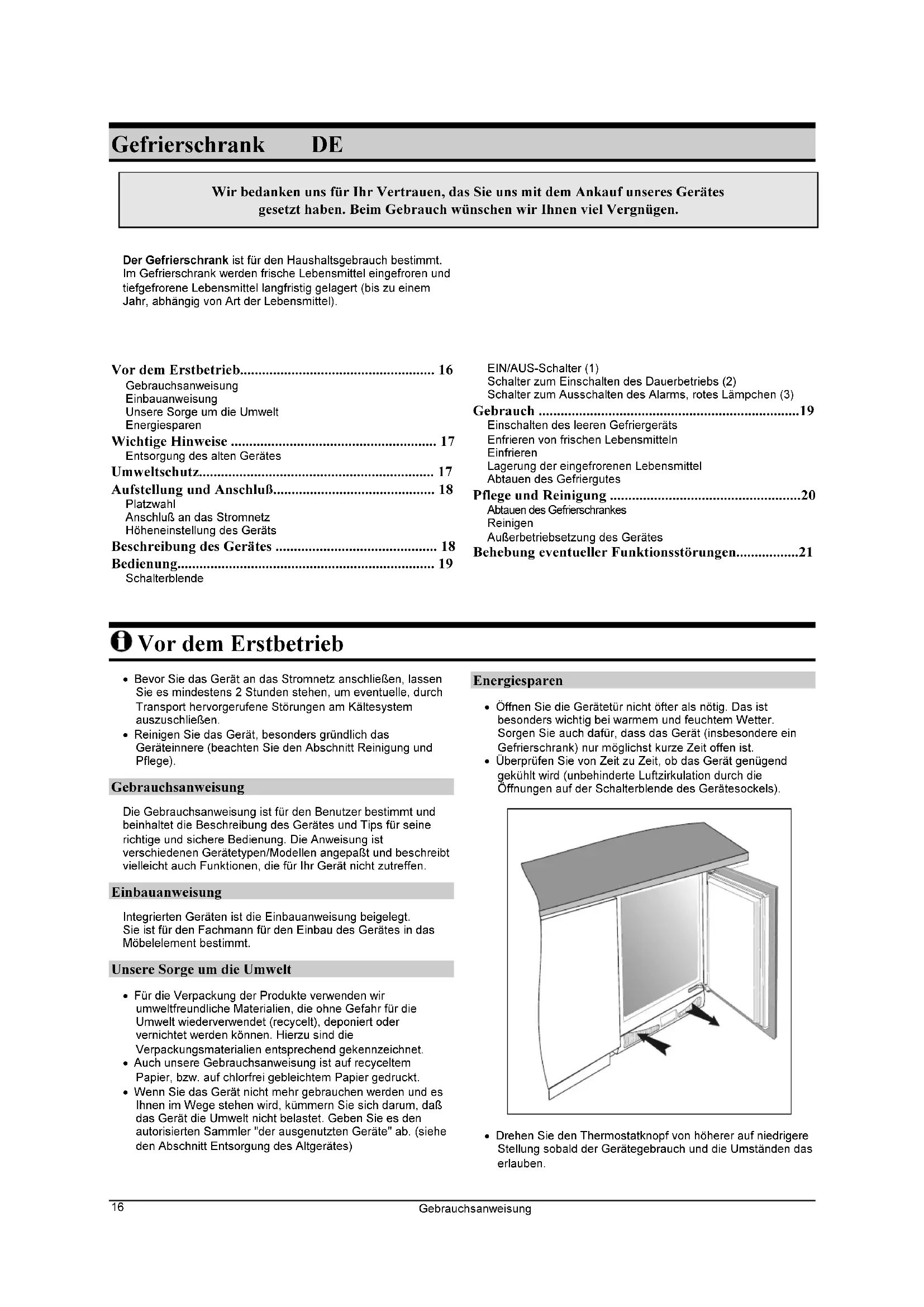 - Gefrierschrank DE Wir bedanken uns für Ihr Vertrauen, das Sie uns mit dem Ankauf unseres Gerätes gesetzt haben. Beim Gebrauch wünschen wir Ihnen viel Vergnügen. Der Gefrierschrank ist für den Haushaltsgebrauch bestimmt. Im Gefrierschrank werden frische Lebensmittel eingefroren und tiefgefrorene Lebensmittel langfristig gelagert (bis zu einem Jahr, abhängig von Art der Lebensmittel). Vor dem Erstbetrieb p. 16