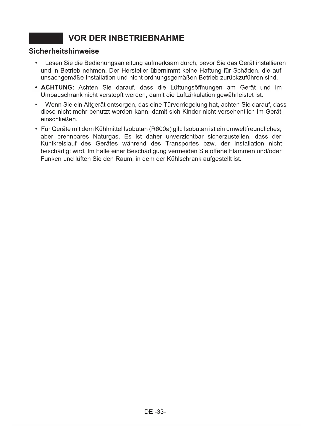 - Für Geräte mit dem Kühlmittel Isobutan (R600a) gilt: Isobutan ist ein umweltfreundliches, aber brennbares Naturgas. Es ist daher unverzichtbar sicherzustellen, dass der Kühlkreislauf des Gerätes während des Transportes bzw. der Installation nicht beschädigt wird. Im Falle einer Beschädigung vermeiden Sie offene Flammen und/oder Funken und lüften Sie den Raum, in dem der Kühlschrank aufgestellt ist.DE -34- Empfehlungen ! Warnung: Benutzen sie keine mechanischen hilfsmittel oder andere mittel zur beschleunigung des abtauvorgangs. Setzen sie keinerlei elektrogeräte im inneren des gerätes ein. Halten sie die belüftungsöffnungen des gerätes frei. Beschädigen sie nicht den kühlkreislauf des gerätes.