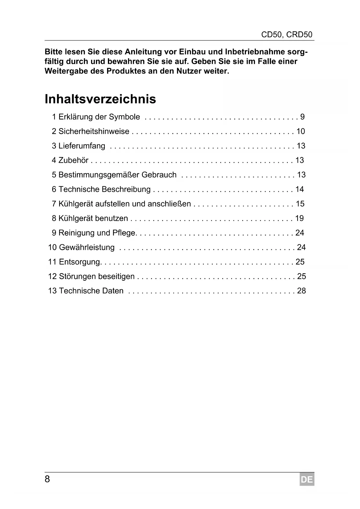 ACHTUNG! Benutzen Sie keine elektrischen Geräte innerhalb des Kühl- gerätes, außer wenn diese Geräte vom Hersteller dafür emp- fohlen werden. Stellen Sie das Gerät nicht in der Nähe von offenen Flammen oder anderen Wärmequellen (Heizung, starke Sonnen- einstrahlung, Gasöfen usw.) ab. Überhitzungsgefahr! Achten Sie stets darauf, dass beim Betrieb entstehende Wärme ausreichend abgeführt werden kann. Sorgen Sie dafür, dass das Gerät in ausreichendem Abstand zu Wänden oder Gegen- ständen steht, sodass die Luft zirkulieren kann. Achten Sie darauf, dass die Lüftungsöffnungen nicht abgedeckt werden. Füllen Sie keine Flüssigkeiten oder Eis in den Innenbehälter. Tauchen Sie das Gerät nie in Wasser. Schützen Sie das Gerät und die Kabel vor Hitze und Nässe. Achten Sie darauf, dass die Speisen keine Wand des Kühl- raums berühren.DE CD50, CRD50 Lieferumfang
