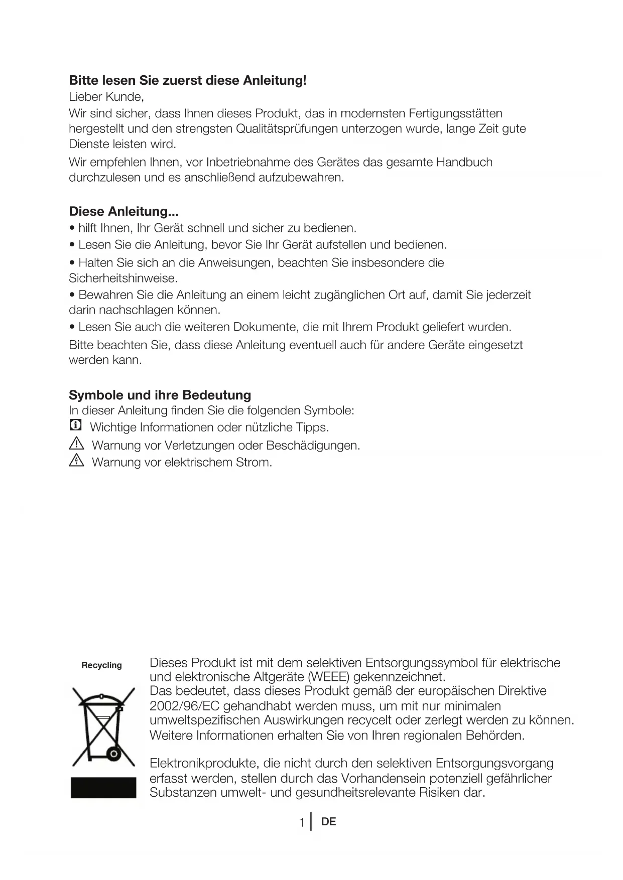 - Lesen Sie auch die weiteren Dokumente, die mit Ihrem Produkt geliefert wurden. Bitte beachten Sie, dass diese Anleitung eventuell auch für andere Geräte eingesetzt werden kann. Symbole und ihre Bedeutung In dieser Anleitung finden Sie die folgenden Symbole: C Wichtige Informationen oder nützliche Tipps. A Warnung vor Verletzungen oder Beschädigungen. B Warnung vor elektrischem Strom. Dieses Produkt ist mit dem selektiven Entsorgungssymbol für elektrische und elektronische Altgeräte (WEEE) gekennzeichnet. Das bedeutet, dass dieses Produkt gemäß der europäischen Direktive 2002/96/EC gehandhabt werden muss, um mit nur minimalen umweltspezifischen Auswirkungen recycelt oder zerlegt werden zu können. Weitere Informationen erhalten Sie von Ihren regionalen Behörden. Elektronikprodukte, die nicht durch den selektiven Entsorgungsvorgang erfasst werden, stellen durch das Vorhandensein potenziell gefährlicher Substanzen umwelt- und gesundheitsrelevante Risiken dar. Recycling2