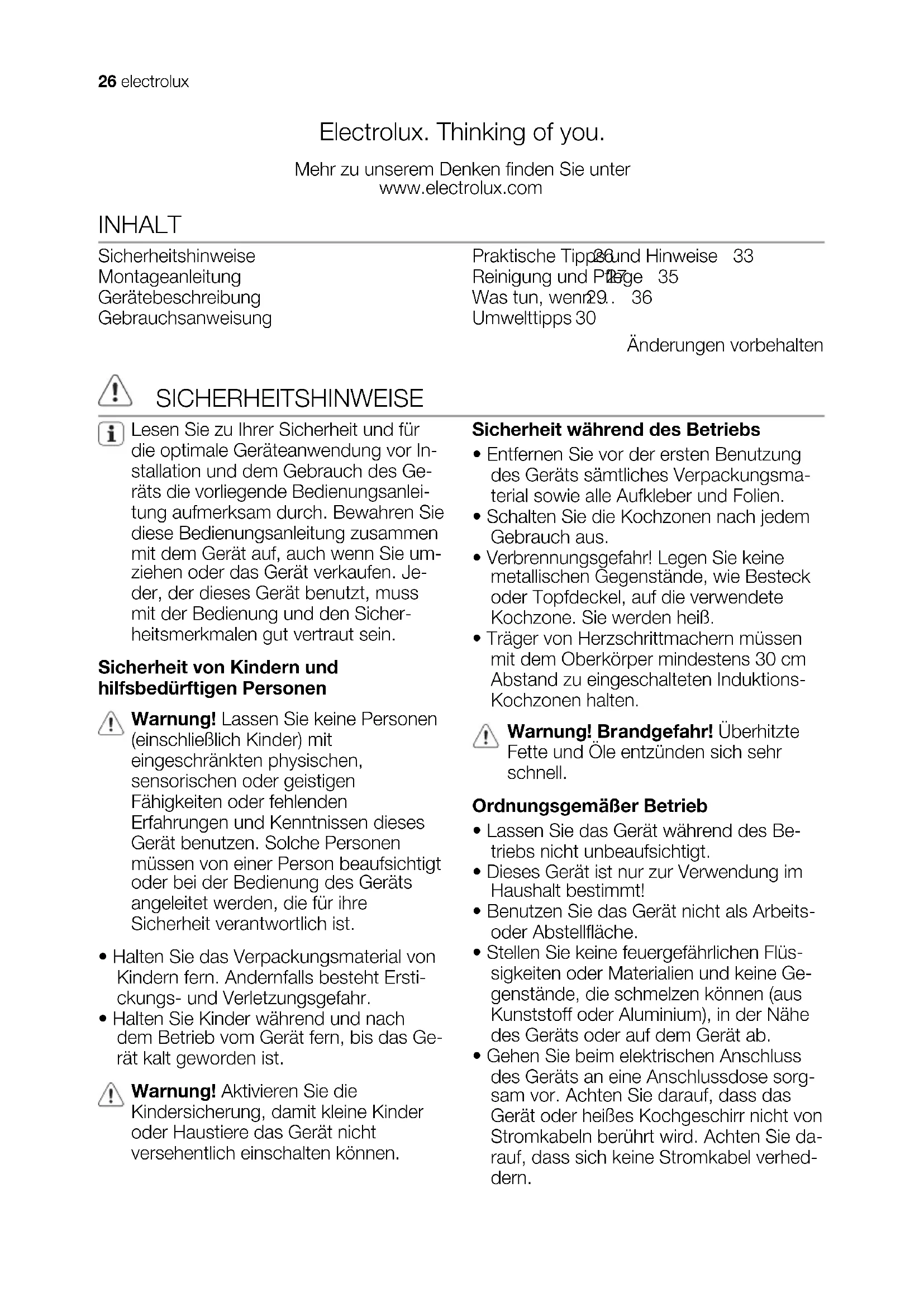 - Das Kochgeschirr bedeckt das Kreuz nicht. Das Kreuz muss vollständig bedeckt sein. und eine Zahl leuchten auf. Im Gerät ist ein Fehler aufgetreten. Trennen Sie das Gerät eine Zeit lang vom Netz. Schalten Sie die Sicherung im Sicherungskasten der Hausinstallation aus. Schal- ten Sie die Sicherung wieder ein. Wenn erneut aufleuchtet, benachrichtigen Sie den Kundendienst. 36 electroluxProblem Mögliche Ursache und Abhilfe leuchtet auf. Im Gerät ist ein Fehler aufgetreten, da ein Kochgeschirr leer ge- kocht ist. Der Überhitzungsschutz der eingeschalteten Kochzone hat ausgelöst. Die Abschaltautomatik hat ausgelöst. Schalten Sie das Gerät aus. Entfernen Sie das heiße Kochge- schirr. Schalten Sie nach ca. 30 Sekunden die Kochzone wieder ein. sollte erlöschen, die Restwärmeanzeige kann jedoch noch leuchten. Lassen Sie das Kochgeschirr abkühlen und über- prüfen Sie es anhand der Angaben im Abschnitt „Kochgeschirr für Induktionskochzonen“. Wenn Sie das Problem mit der oben ange- gebenen Abhilfemaßnahme nicht beheben können, wenden Sie sich bitte an Ihren Fachhändler oder den Kundendienst. Ge- ben Sie dabei die Daten auf dem Typen- schild, den Code aus drei Buchstaben für die Glaskeramik (befindet sich in der Ecke der Glasfläche) und die angezeigte Fehler- meldung an. Vergewissern Sie sich, dass Sie das Gerät korrekt bedient haben. Wenn Sie das Gerät falsch bedient haben, fällt auch während der Garantiezeit für den Besuch eines Kun- dendiensttechnikers oder Händlers eine Gebühr an. Die Anweisungen zum Kunden- dienst und die Garantiebedingungen finden Sie im Garantieheft. UMWELTTIPPS Das Symbol auf dem Produkt oder seiner Verpackung weist darauf hin, dass dieses Produkt nicht als normaler Haushaltsabfall zu behandeln ist, sondern an einem Sammelpunkt für das Recycling von elektrischen und elektronischen Geräten abgegeben werden muss. Durch Ihren Beitrag zum korrekten Entsorgen dieses Produkts schützen Sie die Umwelt und die Gesundheit Ihrer Mitmenschen. Umwelt und Gesundheit werden durch falsches Entsorgen gefährdet. Weitere Informationen über das Recycling dieses Produkts erhalten Sie von Ihrem Rathaus, Ihrer Müllabfuhr oder dem Geschäft, in dem Sie das Produkt gekauft haben. Verpackungsmaterial Die Verpackungsmaterialien sind um- weltverträglich und wieder verwertbar. Kunststoffteile sind mit internationalen Abkürzungen wie z. B. >PE<, >PS< usw. gekennzeichnet. Entsorgen Sie das Verpackungsmaterial bei den kom- munalen Entsorgungsstellen in den da- für vorgesehenen Behältern. electrolux 3738 electroluxelectrolux 39892934632-A-442010 www.electrolux.com/shop