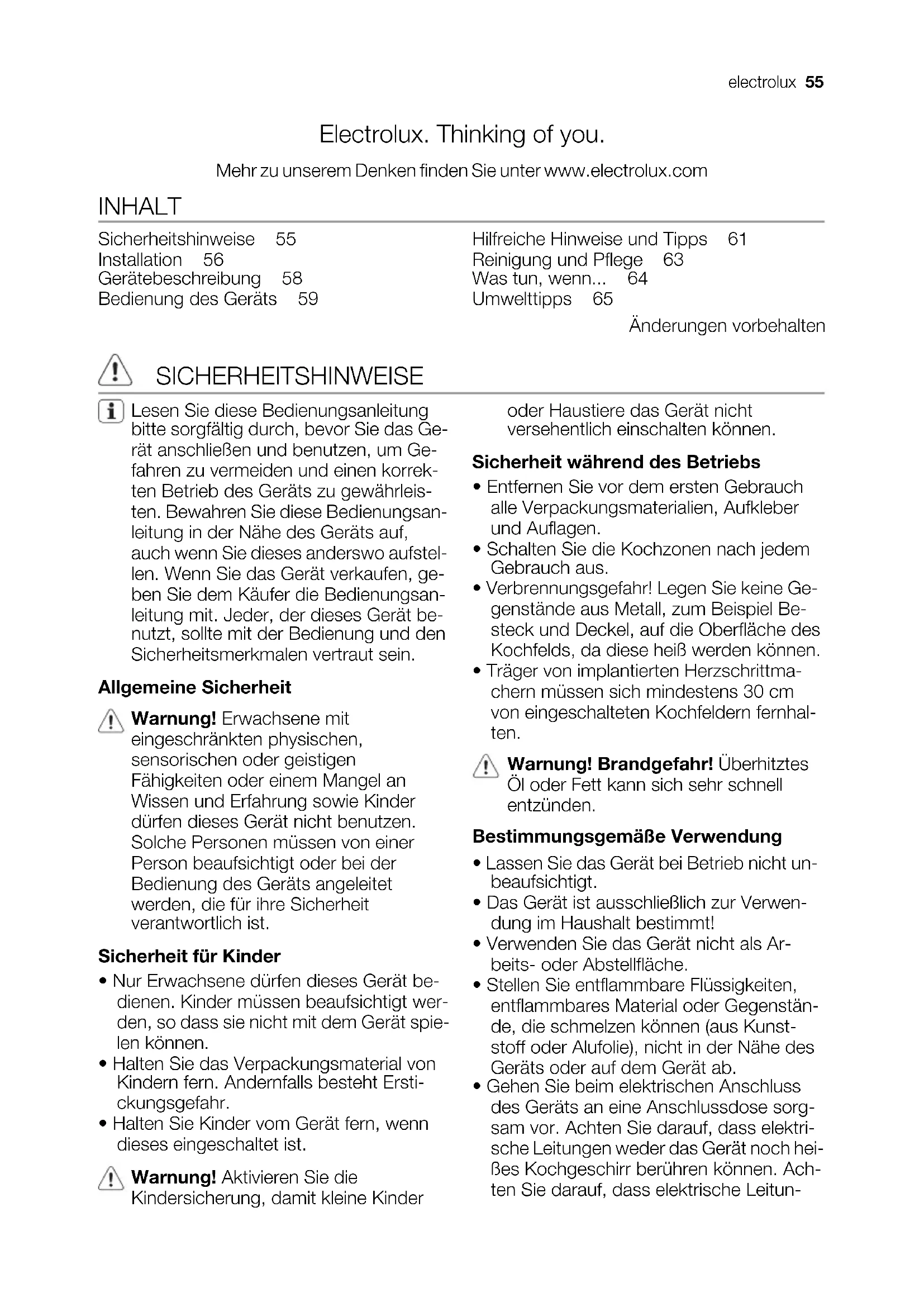 - Der Durchmesser des Kochgefäßbodens ist für die Kochzone zu klein. Benutzen Sie geeignetes Kochgeschirr. und eine Zahl leuchten auf. Es ist ein Fehler aufgetreten. Trennen Sie das Gerät eine Weile vom Stromnetz. Schalten Sie dazu die Sicherung im Sicherungskasten aus. Schalten Sie die Si- cherung dann wieder ein. Wenn erneut aufleuchtet, wenden Sie sich bitte an den Kundendienst. 64 electroluxStörung Mögliche Ursachen und Abhilfe und leuchten auf. Zu starke Lichteinstrahlung auf dem Bedienfeld, zum Beispiel durch helles Sonnenlicht. Decken Sie das Bedienfeld für kurze Zeit zum Beispiel mit der Hand ab. Es wird ein akustisches Sig- nal ausgegeben und das Gerät wird ausgeschaltet. Schalten Sie das Gerät wieder ein. leuchten auf Es ist ein Fehler aufgetreten, da Flüssigkeit im Kochgeschirr voll- ständig verkocht ist, oder Sie benutzen kein geeignetes Kochge- schirr. Der Überhitzungsschutz der Kochzone arbeitet. Die Ab- schaltautomatik ist ausgelöst. Schalten Sie das Gerät aus. Entfernen Sie das heiße Kochge- schirr. Schalten Sie die Kochzone nach ca. 30 Sekunden wieder ein. Das Symbol sollte erlöschen, während die Restwärme- anzeige weiterhin leuchten kann. Lassen Sie das Kochgeschirr ab- kühlen und prüfen Sie anhand des Abschnitts "Kochgeschirr für Induktionskochzonen", ob es sich um geeignetes Kochgeschirr handelt. Wenn Sie das Problem mit der oben ange- gebenen Abhilfemaßnahme nicht beheben können, wenden Sie sich bitte an Ihren Fach- händler oder den Kundendienst. Geben Sie dabei die Daten auf dem Typenschild, den dreistelligen Code für die Glaskeramik (befin- det sich in der Ecke des Kochfelds) und die angezeigte Fehlermeldung an. Wenn Sie das Gerät falsch bedient haben, fällt auch während der Garantiezeit für den Besuch eines Kundendiensttechnikers oder Händlers eine Gebühr an. Die Anweisungen zum Kundendienst und die Garantiebedin- gungen finden Sie im Garantieheft. UMWELTTIPPS Das Symbol auf dem Produkt oder seiner Verpackung weist darauf hin, dass dieses Produkt nicht als normaler Haushaltsabfall zu behandeln ist, sondern an einem Sammelpunkt für das Recycling von elektrischen und elektronischen Geräten abgegeben werden muss. Durch Ihren Beitrag zum korrekten Entsorgen dieses Produkts schützen Sie die Umwelt und die Gesundheit Ihrer Mitmenschen. Umwelt und Gesundheit werden durch falsches Entsorgen gefährdet. Weitere Informationen über das Recycling dieses Produkts erhalten Sie von Ihrem Rathaus, Ihrer Müllabfuhr oder dem Geschäft, in dem Sie das Produkt gekauft haben. Verpackungsmaterial Die Verpackungsmaterialien sind um- weltverträglich und wiederverwertbar. Kunststoffteile sind mit internationalen Abkürzungen wie z. B. >PE<,>PS< usw. gekennzeichnet. Entsorgen Sie das Verpackungsmaterial bei den kom- munalen Entsorgungsstellen in den da- für vorgesehenen Behältern. electrolux 65Electrolux. Thinking of you. Saiba mais sobre a nossa filosofia em www.electrolux.com ÍNDICE Informações de segurança 66 Instalação 67 Descrição do aparelho 69 Operação do aparelho 70 Sugestões e dicas úteis 72 Manutenção e limpeza 74 O que fazer se... 74 Preocupações ambientais 75 Sujeito a alterações sem aviso prévio