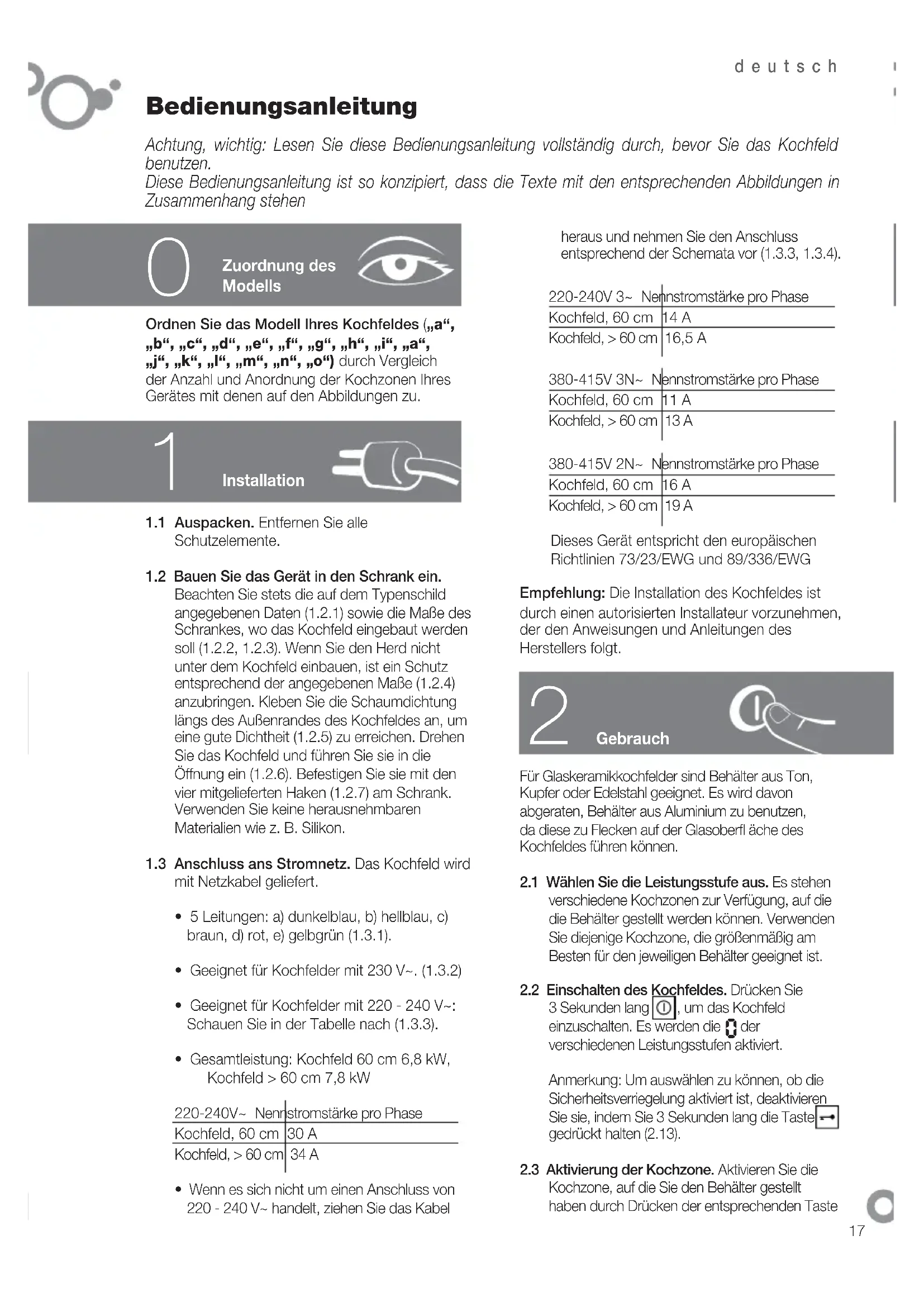 heraus und nehmen Sie den Anschluss entsprechend der Schemata vor (1.3.3, 1.3.4).220-240V 3~ Nennstromstärke pro PhaseKochfeld, 60 cm 14 AKochfeld, > 60 cm 16,5 A380-415V 3N~ Nennstromstärke pro PhaseKochfeld, 60 cm 11 AKochfeld, > 60 cm 13 A380-415V 2N~ Nennstromstärke pro PhaseKochfeld, 60 cm 16 AKochfeld, > 60 cm 19 ADieses Gerät entspricht den europäischen Richtlinien 73/23/EWG und 89/336/EWGEmpfehlung: Die Installation des Kochfeldes ist durch einen autorisierten Installateur vorzunehmen, der den Anweisungen und Anleitungen des Herstellers folgt.
