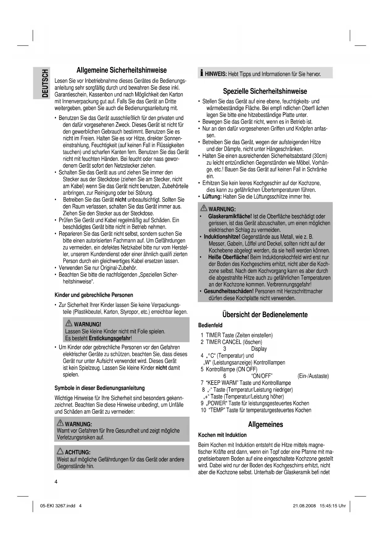 - Gesundheitsschäden! Personen mit Herzschrittmacher dürfen diese Kochplatte nicht verwenden. Übersicht der Bedienelemente Bedienfeld 1 TIMER Taste (Zeiten einstellen) 2 TIMER CANCEL (löschen) 3 Display 4 „°C“ (Temperatur) und „W“ (Leistungsanzeige) Kontrolllampen 5 Kontrolllampe (ON OFF) 6 “ON/OFF” (Ein-/Austaste) 7 “KEEP WARM” Taste und Kontrolllampe 8 „-“ Taste (Temperatur/Leistung niedriger) „+“ Taste (Temperatur/Leistung höher) 9 „POWER“ Taste für leistungsgesteuertes Kochen 10 “TEMP” Taste für temperaturgesteuertes Kochen Allgemeines Kochen mit Induktion Beim Kochen mit Induktion entsteht die Hitze mittels magne- tischer Kräfte erst dann, wenn ein Topf oder eine Pfanne mit ma- gnetisierbarem Boden auf eine eingeschaltete Kochzone gestellt wird. Dabei wird nur der Boden des Kochgeschirrs erhitzt, nicht aber die Kochzone selbst. Unterhalb der Glaskeramik befi ndet 05-EKI 3267.indd 405-EKI 3267.indd 4 21.08.2008 15:45:15 Uhr21.08.2008 15:45:15 Uhr5 DEUTSCH DEUTSCH sich die Induktionsspule. Wird sie mit Strom versorgt, entsteht ein Magnetfeld, das im Topfboden Wirbel erzeugt. Hierdurch wird eine Erhitzung des Bodens bewirkt. Das spart Energie, da die Wärme ausschließlich dort entsteht, wo sie gebraucht wird. Welches Kochgeschirr kann ich verwenden? Für Induktionskochplatten werden Töpfe bzw. Topfböden aus magnetisierbarem Material benötigt. Kochgeschirr wird heutzu- tage mit dem Hinweis Induktionsherd geeignet versehen. Grundsätzlich können Sie alle eisenhaltigen Kochgeschirre verwenden, ob diese auch magnetisierbar sind, zeigt Ihnen ein kurzer Versuch: Stellen Sie den fraglichen Topf auf. Ertönt ein Signal nachdem die Kochfunktion gewählt und das Gerät eingeschaltet wurde, ist der Topf untauglich. HINWEIS: Aus Sicherheitsgründen schaltet das Gerät nach wenigen Sekunden in den Bereitschaftszustand. Diese Materialien können Sie als Kochgeschirr nicht verwenden: Ton, Glas oder Aluminium. Diese Töpfe können Sie nicht verwenden: Töpfe mit rundem Boden. Töpfe deren Durch- messer am Boden kleiner als 12cm ist. Töpfe die auf Füßen stehen. Elektrischer Anschluss Anschlusswert Ingesamt kann die Kochplatte eine Leistung von 2000 W aufnehmen. Bei diesem Anschlusswert empfi ehlt sich eine getrennte Zuleitung mit einer Absicherung über einen 16A Haushaltsschutzschalter. WARNUNG VOR ÜBERLASTUNG! Benutzen Sie keine Verlängerungsleitungen oder Mehrfach- steckdosen, da dieses Gerät zu leistungsstark ist. Anschluss