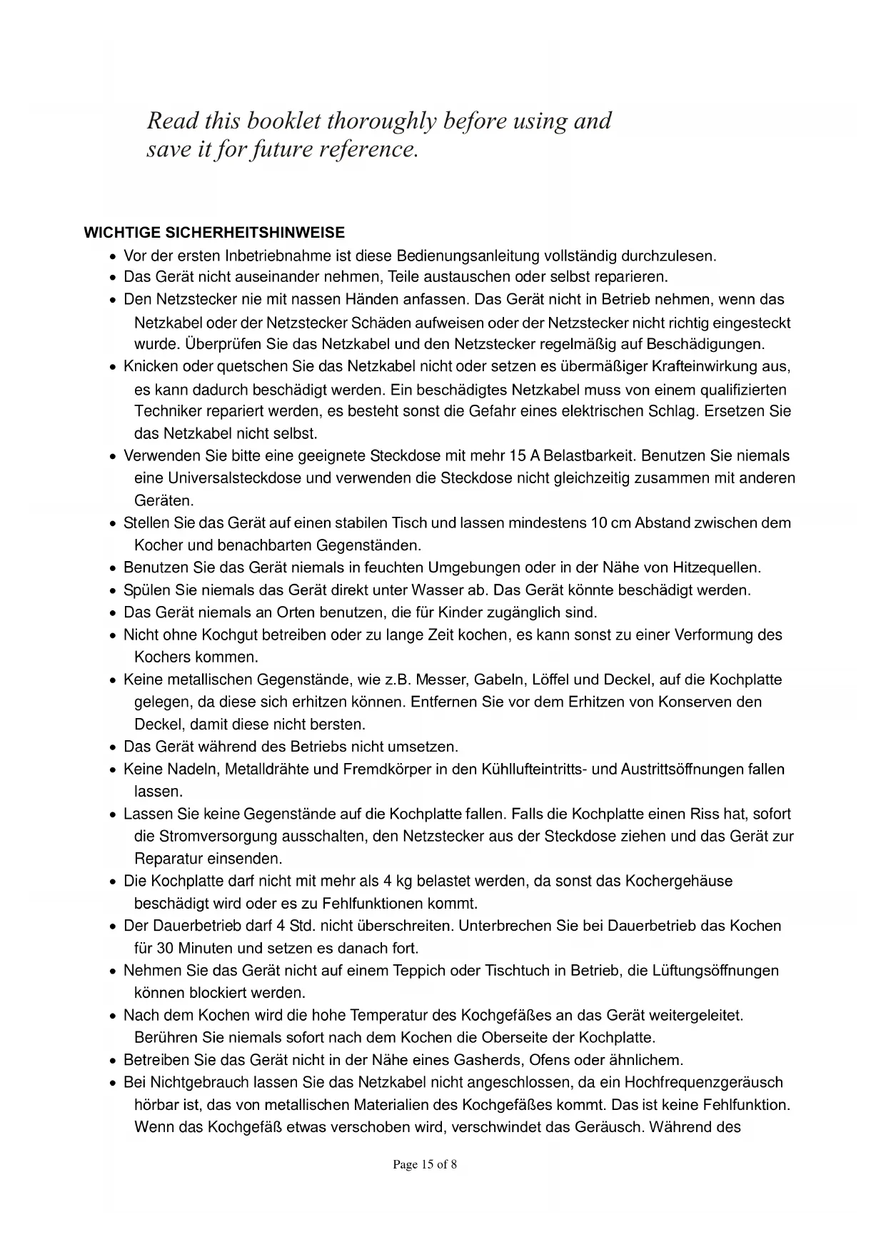WICHTIGE SICHERHEITSHINWEISE Vor der ersten Inbetriebnahme ist diese Bedienungsanleitung vollständig durchzulesen. Das Gerät nicht auseinander nehmen, Teile austauschen oder selbst reparieren. Den Netzstecker nie mit nassen Händen anfassen. Das Gerät nicht in Betrieb nehmen, wenn das Netzkabel oder der Netzstecker Schäden aufweisen oder der Netzstecker nicht richtig eingesteckt wurde. Überprüfen Sie das Netzkabel und den Netzstecker regelmäßig auf Beschädigungen. Knicken oder quetschen Sie das Netzkabel nicht oder setzen es übermäßiger Krafteinwirkung aus, es kann dadurch beschädigt werden. Ein beschädigtes Netzkabel muss von einem qualifizierten Techniker repariert werden, es besteht sonst die Gefahr eines elektrischen Schlag. Ersetzen Sie das Netzkabel nicht selbst. Verwenden Sie bitte eine geeignete Steckdose mit mehr 15 A Belastbarkeit. Benutzen Sie niemals eine Universalsteckdose und verwenden die Steckdose nicht gleichzeitig zusammen mit anderen Geräten. Stellen Sie das Gerät auf einen stabilen Tisch und lassen mindestens 10 cm Abstand zwischen dem Kocher und benachbarten Gegenständen. Benutzen Sie das Gerät niemals in feuchten Umgebungen oder in der Nähe von Hitzequellen. Spülen Sie niemals das Gerät direkt unter Wasser ab. Das Gerät könnte beschädigt werden. Das Gerät niemals an Orten benutzen, die für Kinder zugänglich sind. Nicht ohne Kochgut betreiben oder zu lange Zeit kochen, es kann sonst zu einer Verformung des Kochers kommen. Keine metallischen Gegenstände, wie z.B. Messer, Gabeln, Löffel und Deckel, auf die Kochplatte gelegen, da diese sich erhitzen können. Entfernen Sie vor dem Erhitzen von Konserven den Deckel, damit diese nicht bersten. Das Gerät während des Betriebs nicht umsetzen. Keine Nadeln, Metalldrähte und Fremdkörper in den Kühllufteintritts- und Austrittsöffnungen fallen lassen. Lassen Sie keine Gegenstände auf die Kochplatte fallen. Falls die Kochplatte einen Riss hat, sofort die Stromversorgung ausschalten, den Netzstecker aus der Steckdose ziehen und das Gerät zur Reparatur einsenden. Die Kochplatte darf nicht mit mehr als 4 kg belastet werden, da sonst das Kochergehäuse beschädigt wird oder es zu Fehlfunktionen kommt. Der Dauerbetrieb darf 4 Std. nicht überschreiten. Unterbrechen Sie bei Dauerbetrieb das Kochen für 30 Minuten und setzen es danach fort. Nehmen Sie das Gerät nicht auf einem Teppich oder Tischtuch in Betrieb, die Lüftungsöffnungen können blockiert werden. Nach dem Kochen wird die hohe Temperatur des Kochgefäßes an das Gerät weitergeleitet. Berühren Sie niemals sofort nach dem Kochen die Oberseite der Kochplatte. Betreiben Sie das Gerät nicht in der Nähe eines Gasherds, Ofens oder ähnlichem. Bei Nichtgebrauch lassen Sie das Netzkabel nicht angeschlossen, da ein Hochfrequenzgeräusch hörbar ist, das von metallischen Materialien des Kochgefäßes kommt. Das ist keine Fehlfunktion. Wenn das Kochgefäß etwas verschoben wird, verschwindet das Geräusch. Während desPage 16 of 8 Betriebs ist das Laufgeräusch vom Lüfter hörbar, da dieser manchmal anspringt, um das Gerät innen zu kühlen. Legen Sie kein Papier zwischen das Kochgefäß und die Kochplatte. Das Papier kann sich entzünden. Stellen Sie das Gerät nicht in der Nähe von Gegenständen auf, die durch das Magnetfeld beeinträchtigt werden. Zum Beispiel Radios, Fernseher, Kreditkarten und Tonbänder. Heben Sie diese Anweisungen auf.