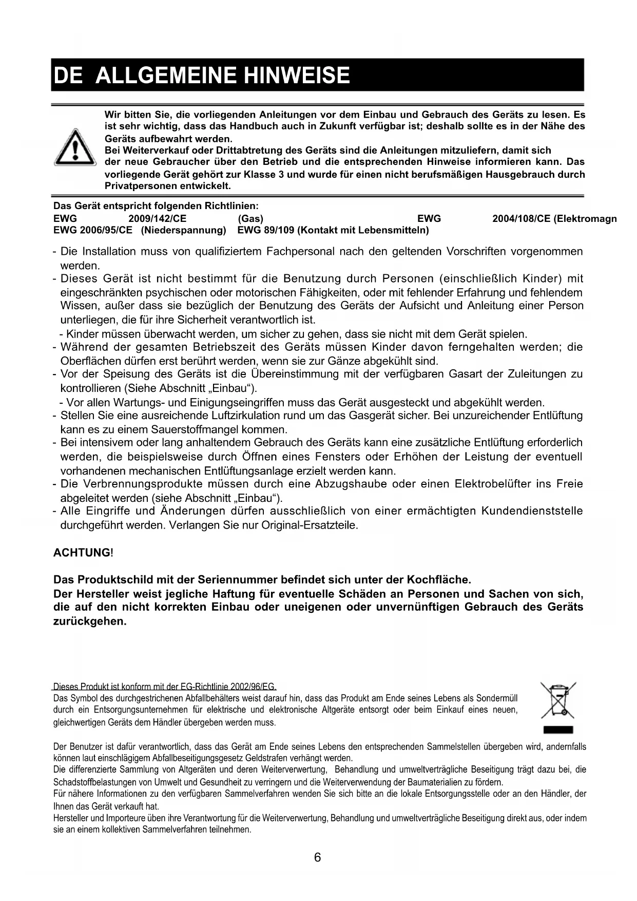 - Die Installation muss von qualifiziertem Fachpersonal nach den geltenden Vorschriften vorgenommen werden. - Dieses Gerät ist nicht bestimmt für die Benutzung durch Personen (einschließlich Kinder) mit eingeschränkten psychischen oder motorischen Fähigkeiten, oder mit fehlender Erfahrung und fehlendem Wissen, außer dass sie bezüglich der Benutzung des Geräts der Aufsicht und Anleitung einer Person unterliegen, die für ihre Sicherheit verantwortlich ist. - Kinder müssen überwacht werden, um sicher zu gehen, dass sie nicht mit dem Gerät spielen. - Während der gesamten Betriebszeit des Geräts müssen Kinder davon ferngehalten werden; die Oberflächen dürfen erst berührt werden, wenn sie zur Gänze abgekühlt sind. - Vor der Speisung des Geräts ist die Übereinstimmung mit der verfügbaren Gasart der Zuleitungen zu kontrollieren (Siehe Abschnitt „Einbau“). - Vor allen Wartungs- und Einigungseingriffen muss das Gerät ausgesteckt und abgekühlt werden. - Stellen Sie eine ausreichende Luftzirkulation rund um das Gasgerät sicher. Bei unzureichender Entlüftung kann es zu einem Sauerstoffmangel kommen. - Bei intensivem oder lang anhaltendem Gebrauch des Geräts kann eine zusätzliche Entlüftung erforderlich werden, die beispielsweise durch Öffnen eines Fensters oder Erhöhen der Leistung der eventuell vorhandenen mechanischen Entlüftungsanlage erzielt werden kann. - Die Verbrennungsprodukte müssen durch eine Abzugshaube oder einen Elektrobelüfter ins Freie abgeleitet werden (siehe Abschnitt „Einbau“). - Alle Eingriffe und Änderungen dürfen ausschließlich von einer ermächtigten Kundendienststelle durchgeführt werden. Verlangen Sie nur Original-Ersatzteile. ACHTUNG! Das Produktschild mit der Seriennummer befindet sich unter der Kochfläche. Der Hersteller weist jegliche Haftung für eventuelle Schäden an Personen und Sachen von sich, die auf den nicht korrekten Einbau oder uneigenen oder unvernünftigen Gebrauch des Geräts zurückgehen. Das Gerät entspricht folgenden Richtlinien: EWG 2009/142/CE (Gas) EWG 2004/108/CE (Elektromagnetische Kompatibilität) EWG 2006/95/CE (Niederspannung) EWG 89/109 (Kontakt mit Lebensmitteln) Dieses Produkt ist konform mit der EG-Richtlinie 2002/96/EG. Das Symbol des durchgestrichenen Abfallbehälters weist darauf hin, dass das Produkt am Ende seines Lebens als Sondermüll durch ein Entsorgungsunternehmen für elektrische und elektronische Altgeräte entsorgt oder beim Einkauf eines neuen, gleichwertigen Geräts dem Händler übergeben werden muss. Der Benutzer ist dafür verantwortlich, dass das Gerät am Ende seines Lebens den entsprechenden Sammelstellen übergeben wird, andernfalls können laut einschlägigem Abfallbeseitigungsgesetz Geldstrafen verhängt werden. Die differenzierte Sammlung von Altgeräten und deren Weiterverwertung, Behandlung und umweltverträgliche Beseitigung trägt dazu bei, die Schadstoffbelastungen von Umwelt und Gesundheit zu verringern und die Weiterverwendung der Baumaterialien zu fördern. Für nähere Informationen zu den verfügbaren Sammelverfahren wenden Sie sich bitte an die lokale Entsorgungsstelle oder an den Händler, der Ihnen das Gerät verkauft hat. Hersteller und Importeure üben ihre Verantwortung für die Weiterverwertung, Behandlung und umweltverträgliche Beseitigung direkt aus, oder indem sie an einem kollektiven Sammelverfahren teilnehmen.7