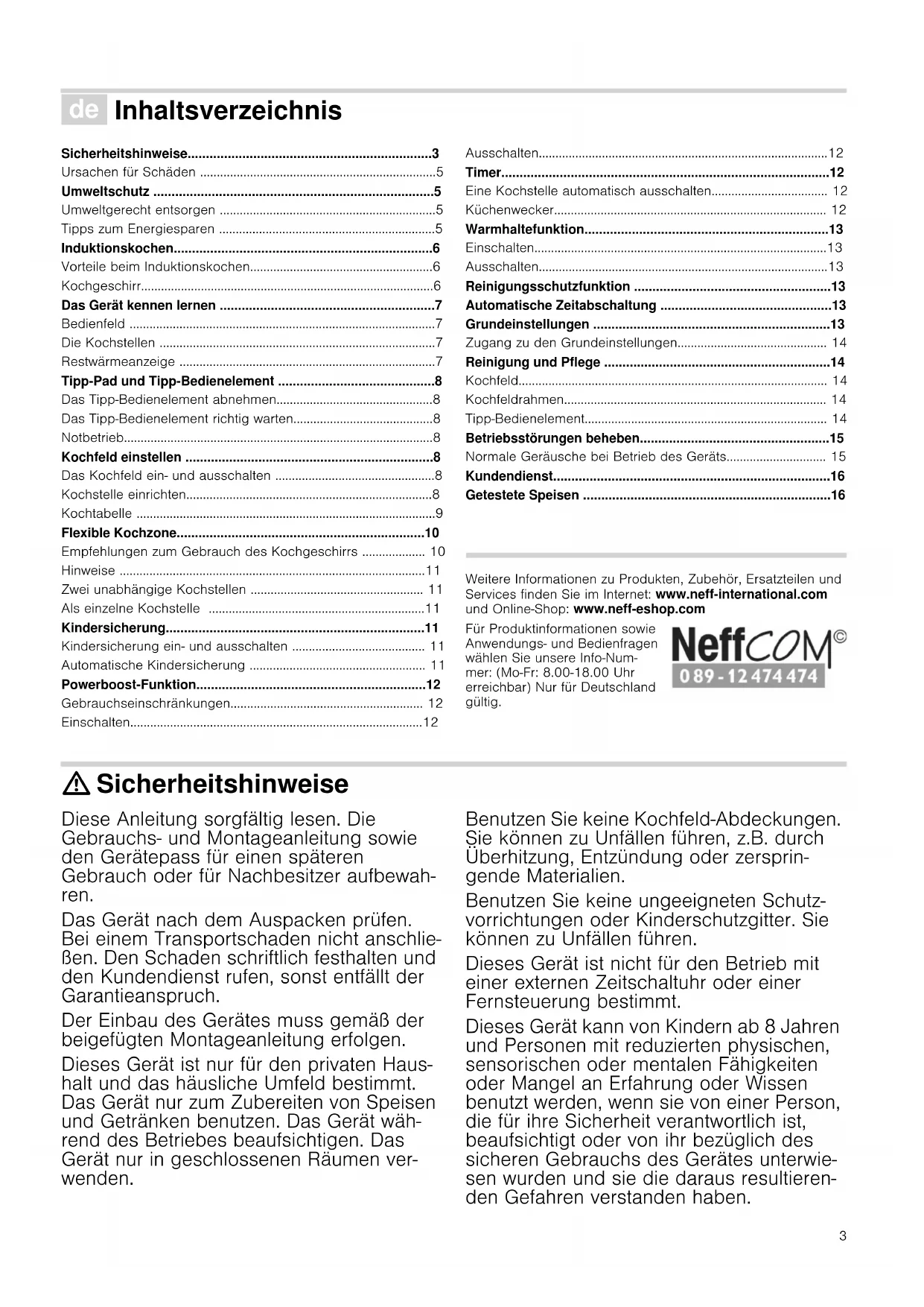 - Getestete Speisen Produktinfo Weitere Informationen zu Produkten, Zubehör, Ersatzteilen und Services finden Sie im Internet: www.neff-international.com und Online-Shop: www.neff-eshop.com Für Produktinformationen sowie Anwendungs- und Bedienfragen wählen Sie unsere Info-Num- mer: (Mo-Fr: 8.00-18.00 Uhr erreichbar) Nur für Deutschland gültig. : Sicherheitshinweise Diese Anleitung sorgfältig lesen. Die Gebrauchs- und Montageanleitung sowie den Gerätepass für einen späteren Gebrauch oder für Nachbesitzer aufbewah- ren. Das Gerät nach dem Auspacken prüfen. Bei einem Transportschaden nicht anschlie- ßen. Den Schaden schriftlich festhalten und den Kundendienst rufen, sonst entfällt der Garantieanspruch. Der Einbau des Gerätes muss gemäß der beigefügten Montageanleitung erfolgen. Dieses Gerät ist nur für den privaten Haus- halt und das häusliche Umfeld bestimmt. Das Gerät nur zum Zubereiten von Speisen und Getränken benutzen. Das Gerät wäh- rend des Betriebes beaufsichtigen. Das Gerät nur in geschlossenen Räumen ver- wenden. Benutzen Sie keine Kochfeld-Abdeckungen. Sie können zu Unfällen führen, z.B. durch Überhitzung, Entzündung oder zersprin- gende Materialien. Benutzen Sie keine ungeeigneten Schutz- vorrichtungen oder Kinderschutzgitter. Sie können zu Unfällen führen. Dieses Gerät ist nicht für den Betrieb mit einer externen Zeitschaltuhr oder einer Fernsteuerung bestimmt. Dieses Gerät kann von Kindern ab 8 Jahren und Personen mit reduzierten physischen, sensorischen oder mentalen Fähigkeiten oder Mangel an Erfahrung oder Wissen benutzt werden, wenn sie von einer Person, die für ihre Sicherheit verantwortlich ist, beaufsichtigt oder von ihr bezüglich des sicheren Gebrauchs des Gerätes unterwie- sen wurden und sie die daraus resultieren- den Gefahren verstanden haben.4 Kinder dürfen nicht mit dem Gerät spielen. Reinigung und Benutzer-Wartung dürfen nicht durch Kinder durchgeführt werden, es sei denn, sie sind 8 Jahre und älter und werden beaufsichtigt. Kinder jünger als 8 Jahre vom Gerät und der Anschlussleitung fernhalten. Falls Sie einen Herzschrittmacher oder eine andere elektronische Körperhilfe tragen, seien Sie vorsichtig wenn Sie sich vor einem eingeschalteten Induktionskochfeld befinden. Informieren Sie sich bei Ihrem Arzt oder dem Hersteller des medizinischen Gerätes hinsichtlich Konformität oder einer möglichen Unverträglichkeit. Brandgefahr! p. 16