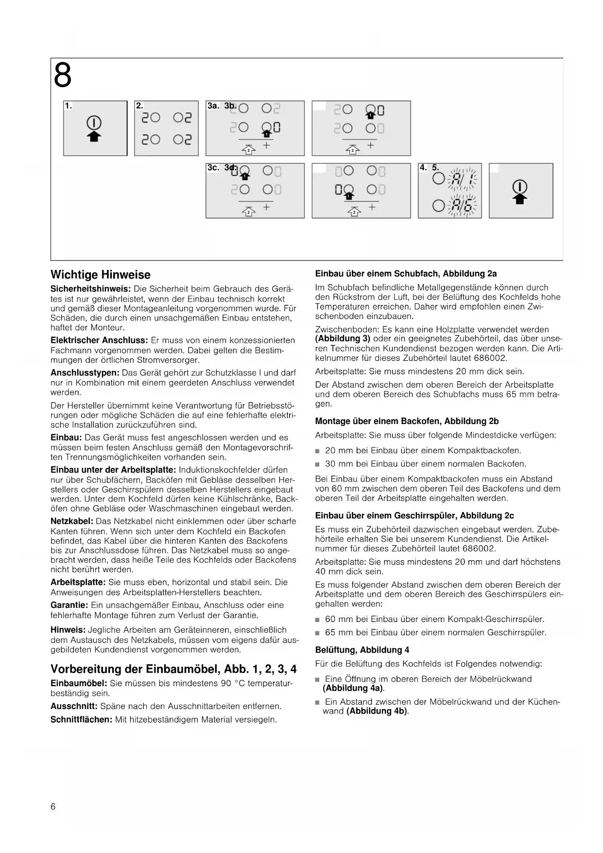 Wichtige Hinweise Sicherheitshinweis: Die Sicherheit beim Gebrauch des Gerä- tes ist nur gewährleistet, wenn der Einbau technisch korrekt und gemäß dieser Montageanleitung vorgenommen wurde. Für Schäden, die durch einen unsachgemäßen Einbau entstehen, haftet der Monteur. Elektrischer Anschluss: Er muss von einem konzessionierten Fachmann vorgenommen werden. Dabei gelten die Bestim- mungen der örtlichen Stromversorger. Anschlusstypen: Das Gerät gehört zur Schutzklasse I und darf nur in Kombination mit einem geerdeten Anschluss verwendet werden. Der Hersteller übernimmt keine Verantwortung für Betriebsstö- rungen oder mögliche Schäden die auf eine fehlerhafte elektri- sche Installation zurückzuführen sind. Einbau: Das Gerät muss fest angeschlossen werden und es müssen beim festen Anschluss gemäß den Montagevorschrif- ten Trennungsmöglichkeiten vorhanden sein. Einbau unter der Arbeitsplatte: Induktionskochfelder dürfen nur über Schubfächern, Backöfen mit Gebläse desselben Her- stellers oder Geschirrspülern desselben Herstellers eingebaut werden. Unter dem Kochfeld dürfen keine Kühlschränke, Back- öfen ohne Gebläse oder Waschmaschinen eingebaut werden. Netzkabel: Das Netzkabel nicht einklemmen oder über scharfe Kanten führen. Wenn sich unter dem Kochfeld ein Backofen befindet, das Kabel über die hinteren Kanten des Backofens bis zur Anschlussdose führen. Das Netzkabel muss so ange- bracht werden, dass heiße Teile des Kochfelds oder Backofens nicht berührt werden. Arbeitsplatte: Sie muss eben, horizontal und stabil sein. Die Anweisungen des Arbeitsplatten-Herstellers beachten. Garantie: Ein unsachgemäßer Einbau, Anschluss oder eine fehlerhafte Montage führen zum Verlust der Garantie. Hinweis: Jegliche Arbeiten am Geräteinneren, einschließlich dem Austausch des Netzkabels, müssen vom eigens dafür aus- gebildeten Kundendienst vorgenommen werden. Vorbereitung der Einbaumöbel, Abb. 1, 2, 3, 4 Einbaumöbel: Sie müssen bis mindestens 90 °C temperatur- beständig sein. Ausschnitt: Späne nach den Ausschnittarbeiten entfernen. Schnittflächen: Mit hitzebeständigem Material versiegeln. Einbau über einem Schubfach, Abbildung 2a Im Schubfach befindliche Metallgegenstände können durch den Rückstrom der Luft, bei der Belüftung des Kochfelds hohe Temperaturen erreichen. Daher wird empfohlen einen Zwi- schenboden einzubauen. Zwischenboden: Es kann eine Holzplatte verwendet werden (Abbildung 3) oder ein geeignetes Zubehörteil, das über unse- ren Technischen Kundendienst bezogen werden kann. Die Arti- kelnummer für dieses Zubehörteil lautet 686002. Arbeitsplatte: Sie muss mindestens 20 mm dick sein. Der Abstand zwischen dem oberen Bereich der Arbeitsplatte und dem oberen Bereich des Schubfachs muss 65 mm betra- gen. Montage über einem Backofen, Abbildung 2b Arbeitsplatte: Sie muss über folgende Mindestdicke verfügen: ■ 20 mm bei Einbau über einem Kompaktbackofen. ■ 30 mm bei Einbau über einem normalen Backofen. Bei Einbau über einem Kompaktbackofen muss ein Abstand von 60 mm zwischen dem oberen Teil des Backofens und dem oberen Teil der Arbeitsplatte eingehalten werden. Einbau über einem Geschirrspüler, Abbildung 2c Es muss ein Zubehörteil dazwischen eingebaut werden. Zube- hörteile erhalten Sie bei unserem Kundendienst. Die Artikel- nummer für dieses Zubehörteil lautet 686002. Arbeitsplatte: Sie muss mindestens 20 mm und darf höchstens 40 mm dick sein. Es muss folgender Abstand zwischen dem oberen Bereich der Arbeitsplatte und dem oberen Bereich des Geschirrspülers ein- gehalten werden: ■ 60 mm bei Einbau über einem Kompakt-Geschirrspüler. ■ 65 mm bei Einbau über einem normalen Geschirrspüler. Belüftung, Abbildung 4 Für die Belüftung des Kochfelds ist Folgendes notwendig: ■ Eine Öffnung im oberen Bereich der Möbelrückwand (Abbildung 4a). ■ Ein Abstand zwischen der Möbelrückwand und der Küchen- wand (Abbildung 4b).