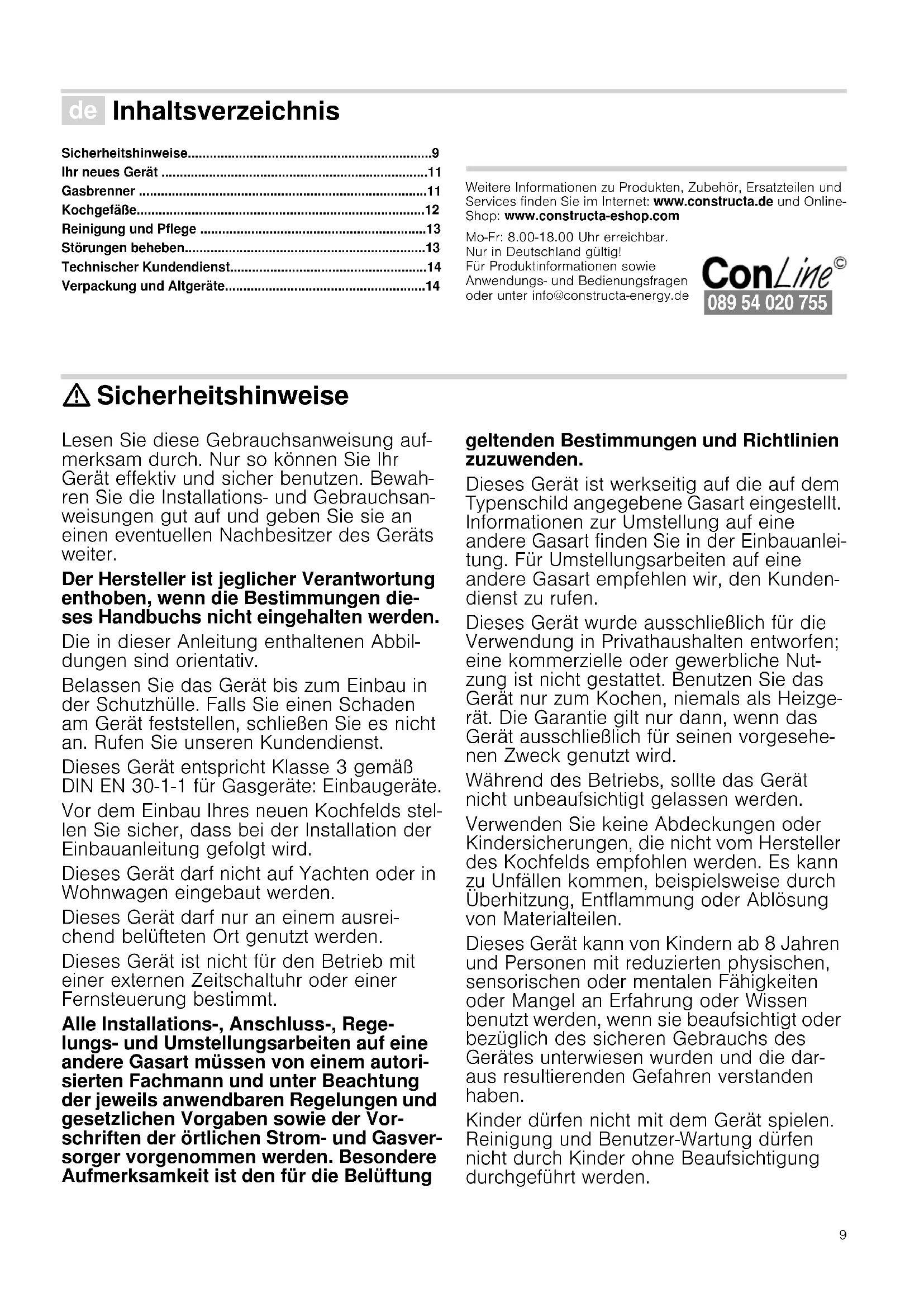 - Συσκευασία και χρησιμοποιημένες συσκευές Produktinfo Περαιτέρω πληροφορίες για τα προϊόντα, τα εξαρτήματα, τα ανταλλακτικά και το σέρβις θα βρείτε στο διαδίκτυο (Internet): www.constructa.de και στο online-shop: www.constructa- eshop.com : Οδηγίες ασφαλείας Διαβάστε προσεκτικά τις οδηγίες. Μόνο τότε θα μπορείτε να χειριστείτε τη συσκευή σας αποτελεσματικά και με ασφάλεια. Κρατήστε της οδηγίες χρήσης και εγκατάστασης, και παραδώστε τις οδηγίες αυτές μαζί με τη συσκευή σε κάποιο μελλοντικό ιδιοκτήτη. Ο κατασκευαστής δεν φέρει καμία ευθύνη αν δεν ακολουθηθούν οι οδηγίες του παρόντος εγχειριδίου. Οι εικόνες που υπάρχουν σ'αυτές τις οδηγίες είναι μόνο ενδεικτικές. Μην βγάζετε τη συσκευή από το προστατευτικό περιτύλιγμα μέχρι τη στιγμή της εντοίχισης. Εάν παρατηρήσετε κάποια βλάβη στη συσκευή, μην τη συνδέετε. Επικοινωνήστε με το τεχνικό μας σέρβις. Αυτή η συσκευή αντιστοιχεί στην κατηγορία 3, σύμφωνα με τον κανονισμό EN 30-1-1 για συσκευές αερίου: συσκευή εντοιχισμένη σε p. 20