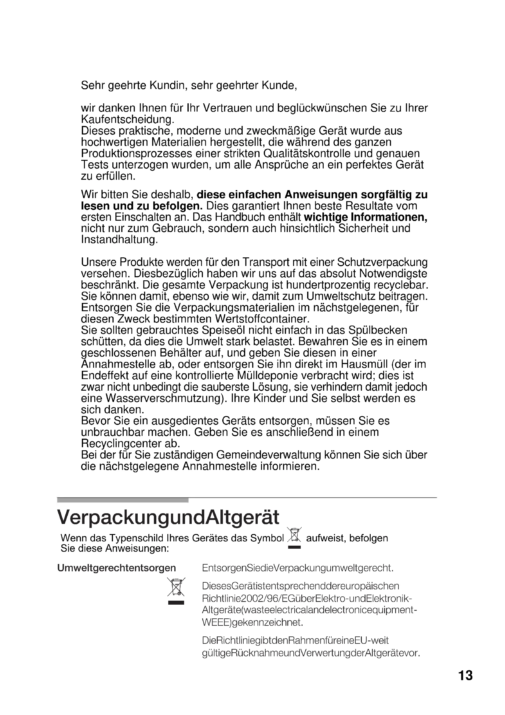 ...if none of the electrical system works? -Faulty fuse. -Check the fuse in the main fuse box and replace it if it is faulty -The automatic circuit breaker or mains differential has been triggered. -Check to see if the circuit breaker or a differential has been triggered in the mains supply box ...if the electric ignition system does not work? -There may be food or cleaning product particles between the spark plugs and the burners. -The burners are wet. -Dry the burner covers and spark plugs carefully. -Check that the covers have been put in the proper position. -The covers on the burners are not in the right position. ...if the flame on the burners is not evenly distributed? -The burner components have not been assembled properly. -The gas outlets on the burners are dirty. -Put the components in their correct positions. -Clean the gas outlets on the burners. ...if the gas flow does not seem normal or there is no gas flow at all? -The gas flow has been cut at an intermediate stopcock. -If the gas is supplied from a gas bottle, it may be empty. - Open any intermediate stopcocks. -Replace the gas bottle with a full one. ...if the kitchen smells of gas? -One of the valves has been left open. -Possible leak on the gas bottle coupling. -Check to see if a valve has been left open. -Check that the coupling on the gas bottle is in order. What´s wrong Possible cause Solution -The gap between the spark plug and the burner needs to be cleaned carefully. ...if the safety devices on the different burners do not work? -The control knob has not been kept pressed in for long enough. -The outlets on the burners are dirty. -Once ignited, keep the control knob pressed in for a few seconds. -Clean the gas outlets on the burners.Should you need to contact our Service Centre, please quote the following information: E - NR FD These indications appear on your appliance's characteristics plate on the bottom of your appliance. Conditions of warranty The conditions of warranty are those set out by our company's representatives in the country where you purchased your appliance. The salesperson that sold you the appliance will be only too pleased to inform you as to the details of these conditions. Proof of purchase must be produced when making any kind of claim against the warranty. The manufacturer reserves the right to modify these conditions. 12Sehr geehrte Kundin, sehr geehrter Kunde, wir danken Ihnen für Ihr Vertrauen und beglückwünschen Sie zu Ihrer Kaufentscheidung. Dieses praktische, moderne und zweckmäßige Gerät wurde aus hochwertigen Materialien hergestellt, die während des ganzen Produktionsprozesses einer strikten Qualitätskontrolle und genauen Tests unterzogen wurden, um alle Ansprüche an ein perfektes Gerät Wir bitten Sie deshalb, diese einfachen Anweisungen sorgfältig zu lesen und zu befolgen. Dies garantiert Ihnen beste Resultate vom ersten Einschalten an. Das Handbuch enthält wichtige Informationen, nicht nur zum Gebrauch, sondern auch hinsichtlich Sicherheit und Instandhaltung. Unsere Produkte werden für den Transport mit einer Schutzverpackung versehen. Diesbezüglich haben wir uns auf das absolut Notwendigste beschränkt. Die gesamte Verpackung ist hundertprozentig recyclebar. Sie können damit, ebenso wie wir, damit zum Umweltschutz beitragen. Entsorgen Sie die Verpackungsmaterialien im nächstgelegenen, für diesen Zweck bestimmten Wertstoffcontainer. Sie sollten gebrauchtes Speiseöl nicht einfach in das Spülbecken schütten, da dies die Umwelt stark belastet. Bewahren Sie es in einem geschlossenen Behälter auf, und geben Sie diesen in einer Annahmestelle ab, oder entsorgen Sie ihn direkt im Hausmüll (der im Endeffekt auf eine kontrollierte Mülldeponie verbracht wird; dies ist zwar nicht unbedingt die sauberste Lösung, sie verhindern damit jedoch eine Wasserverschmutzung). Ihre Kinder und Sie selbst werden es sich danken. Bevor Sie ein ausgedientes Geräts entsorgen, müssen Sie es unbrauchbar machen. Geben Sie es anschließend in einem Recyclingcenter ab. Bei der für Sie zuständigen Gemeindeverwaltung können Sie sich über die nächstgelegene Annahmestelle informieren.