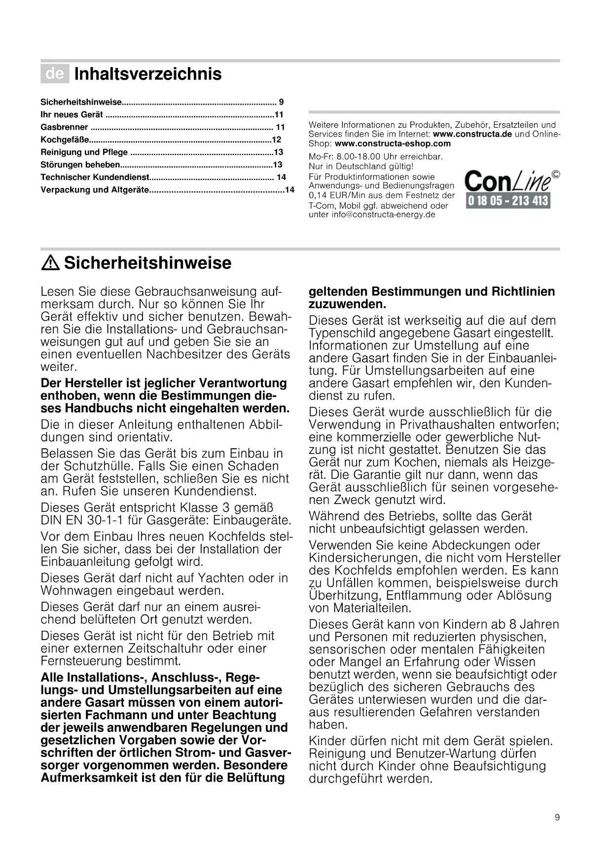 - Used appliances and packaging Produktinfo Additional information on products, accessories, replacement parts and services can be found at www.constructa.de and in the online shop www.constructa-eshop.com : Safety precautions Read these instructions carefully. You will only be able to use your appliance safely and effectively when you have read them. These operating and installation instructions should be retained, and passed onto the buyer if the appliance is sold. The manufacturer is exempt from all responsibility if the requirements of this manual are not complied with. The images shown in these instructions are for guidance only. Do not remove the appliance from its protective packaging until it is installed in the unit. Do not switch on the appliance if it is damaged in any way. Contact our Technical Assistance Service. This appliance is class 3 type, according to the EN 30-1-1 regulation for gas appliances: built-in appliance. Before installing your new hob, ensure that it is being installed according to the assembly instructions. This appliance cannot be installed on yachts or in caravans. This appliance must only be used in well ventilated places. This appliance is not intended for operation with an external clock timer or a remote control. All operations relating to installation, connection, regulation and conversion to other gas types must be performed by an authorised technician, respecting all applicable regulations, standards and the specifications of the local gas and electricity suppliers. Special attention shall be paid to ventilation regulations. This appliance leaves the factory set to the gas type that is indicated on the specifications plate. If this needs to be changed, please consult the assembly instructions. It is recommended you contact the Technical Assistance Service to change to another gas type. This appliance has been designed for home use only, not for commercial or professional use. This appliance is only intended for cooking purposes, not as a heating system. The warranty will only be valid if the appliance is used for the purpose for which it was designed. Never leave the appliance unattended during operation. Do not use lids or protective barriers for children which are not recommended by the hob manufacturer. They may cause accidents such as those due to the overheating, ignition or detachment of fragments of materials. This appliance may be used by children 8 years old and older and by persons with reduced physical, sensory or mental capacity or a lack of experience or knowledge if they are supervised or they have been instructed about the safe use of the appliance and have understood the associated dangers. Never let children play with the appliance. Cleaning and user maintenance must not be carried out by unsupervised children. Risk of deflagration! Accumulation of unburned gas in an enclosed area carries a risk of deflagration. Do not subject the appliance to draughts. These might blow out the burners. Carefully read the instructions and warnings on the operation of gas burners. Risk of poisoning! The kitchen will become hot and humid and combustion products produced when this gas appliance is used. Make sure the kitchen is well ventilated, particularly when16 the hob is in operation: either keep the natural ventilation apertures open, or install a ventilation system (extractor hood). Intense prolonged use of the appliance may require additional or more effective ventilation: open a window or increase the power of the ventilation system. Risk of burns! The hotplates and their immediate vicinity get very hot. Never touch the hot surfaces. Keep children under 8 years old well away from this appliance. Risk of fire! p. 20