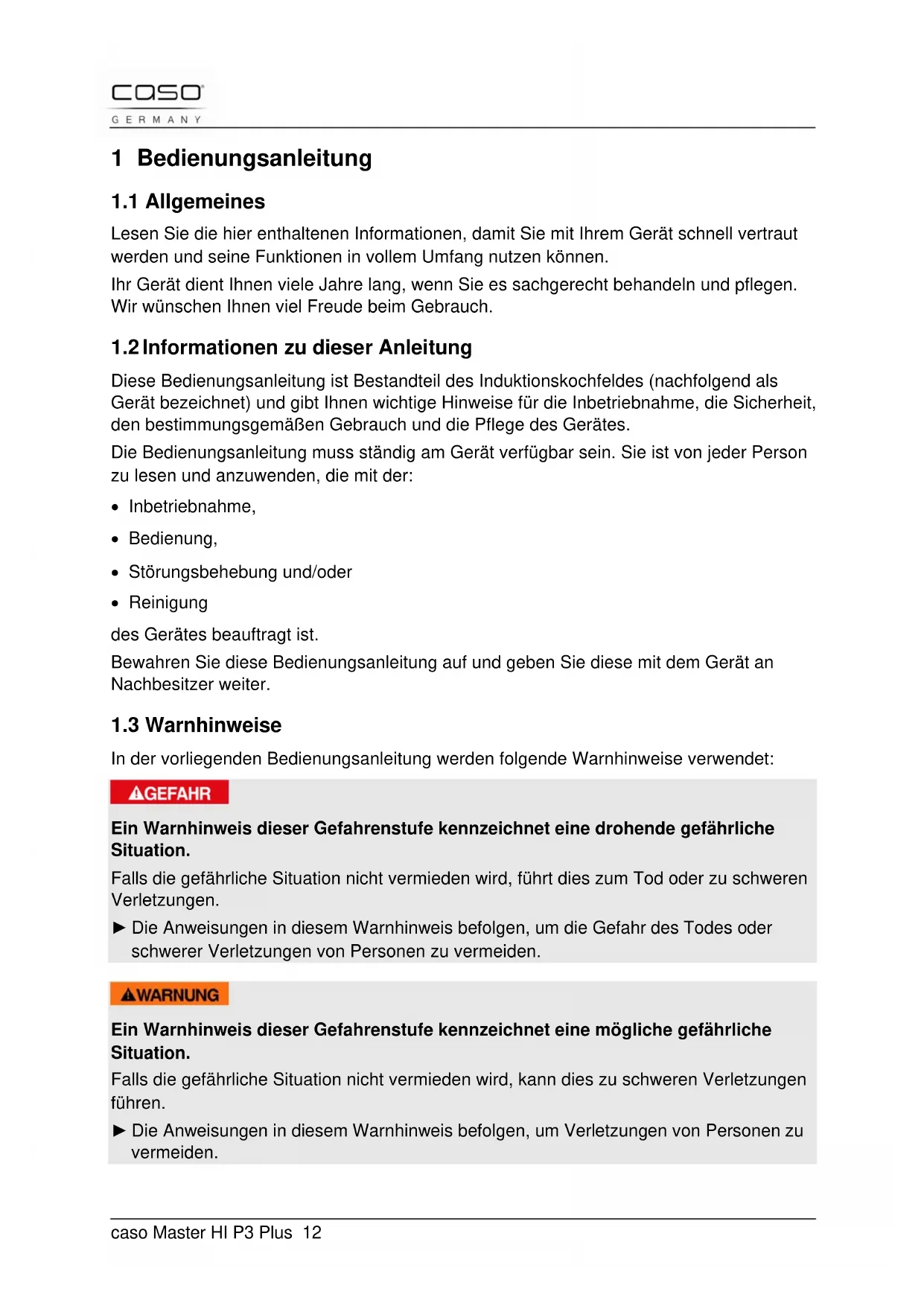 Beachten Sie für einen sicheren Umgang mit dem Gerät die folgenden allgemeinen Sicherheitshinweise: ► Kontrollieren Sie das Gerät vor der Verwendung auf äußere sichtbare Schäden. Nehmen Sie ein beschädigtes Gerät nicht in Betrieb. ► Bei Beschädigung der Anschlussleitung muss eine spezielle Anschlussleitung durch eine vom Hersteller autorisierte Fachkraft installiert werden. ► Dieses Gerät kann von Kindern, die älter als 8 Jahre sind, sowie von Personen mit einer geistigen, sensorischen oder körperlichen Behinderung benutzt werden, wenn sie über den sicheren Betrieb unterrichtet worden sind und die möglichen Gefahren verstehen. ► Kinder dürfen mit dem Gerät nicht spielen. ► Reinigungs- und Wartungsarbeiten dürfen nicht von Kindern ohne Beaufsichtigung durchgeführt werden. ► Das Gerät und das dazugehörige Anschlusskabel müssen für Kinder unter 8 Jahren unerreichbar sein. ► Das Gerät während des Betriebes nicht unbeaufsichtigt lassen. ► Reparaturen dürfen nur von qualifiziertem Fachpersonal durchgeführt werden, die vom Hersteller geschult sind. Durch unsachgemäße Reparaturen können erhebliche Gefahren für den Benutzer entstehen.caso Master HI P3 Plus 15 ► Eine Reparatur des Gerätes während der Garantiezeit darf nur von einem vom Hersteller autorisierten Kundendienst vorgenommen werden, sonst besteht bei nachfolgenden Schäden kein Garantieanspruch mehr. ► Defekte Bauteile dürfen nur gegen Original-Ersatzteile ausgetauscht werden. Nur bei diesen Teilen ist gewährleistet, dass sie die Sicherheitsanforderungen erfüllen werden. ► Metallische Gegenstände wie Messer, Gabeln, Löffel und Deckel sollten nicht auf der Heizplatte platziert werden, da sie heiß werden können. ► Das Gerät ist nicht dazu bestimmt mit einer externen Zeitschaltuhr oder einer separaten Fernsteuerung benutzt zu werden.