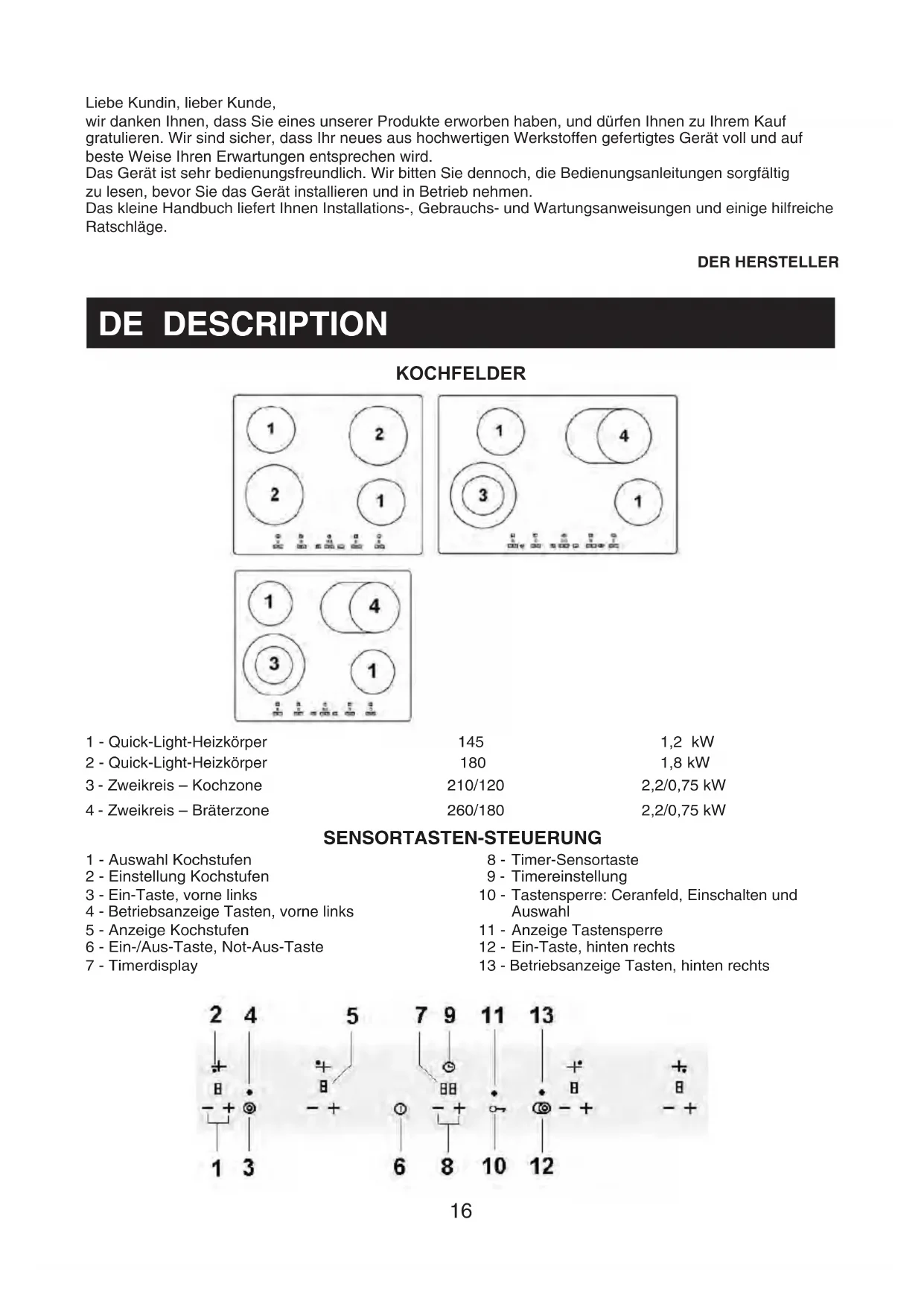 Betriebsanzeige Tasten, hinten rechts Liebe Kundin, lieber Kunde, wir danken Ihnen, dass Sie eines unserer Produkte erworben haben, und dürfen Ihnen zu Ihrem Kauf gratulieren. Wir sind sicher, dass Ihr neues aus hochwertigen Werkstoffen gefertigtes Gerät voll und auf beste Weise Ihren Erwartungen entsprechen wird. Das Gerät ist sehr bedienungsfreundlich. Wir bitten Sie dennoch, die Bedienungsanleitungen sorgfältig zu lesen, bevor Sie das Gerät installieren und in Betrieb nehmen. Das kleine Handbuch liefert Ihnen Installations-, Gebrauchs- und Wartungsanweisungen und einige hilfreiche Ratschläge. DER HERSTELLER16