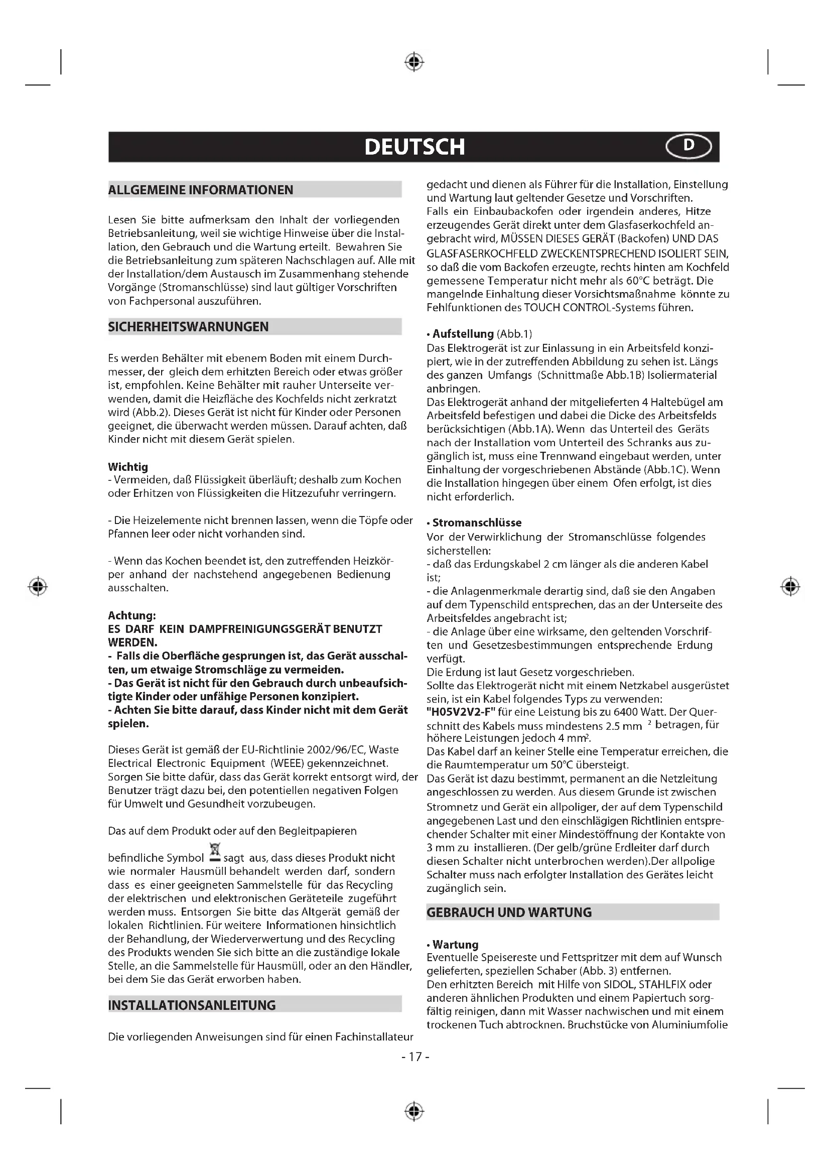 DAÑOS PROVOCADOS POR LA INOBSERVANCIA DE LAS ANTERIORES ADVERTENCIAS. - 16 -DEUTSCH ALLGEMEINE INFORMATIONEN Lesen Sie bitte aufmerksam den Inhalt der vorliegenden Betriebsanleitung, weil sie wichtige Hinweise über die Instal- lation, den Gebrauch und die Wartung erteilt. Bewahren Sie die Betriebsanleitung zum späteren Nachschlagen auf. Alle mit der Installation/dem Austausch im Zusammenhang stehende Vorgänge (Stromanschlüsse) sind laut gültiger Vorschriften von Fachpersonal auszuführen. SICHERHEITSWARNUNGEN Es werden Behälter mit ebenem Boden mit einem Durch- messer, der gleich dem erhitzten Bereich oder etwas größer ist, empfohlen. Keine Behälter mit rauher Unterseite ver- wenden, damit die Heizfläche des Kochfelds nicht zerkratzt wird (Abb.2). Dieses Gerät ist nicht für Kinder oder Personen geeignet, die überwacht werden müssen. Darauf achten, daß Kinder nicht mit diesem Gerät spielen. Wichtig - Vermeiden, daß Flüssigkeit überläuft; deshalb zum Kochen oder Erhitzen von Flüssigkeiten die Hitzezufuhr verringern. - Die Heizelemente nicht brennen lassen, wenn die Töpfe oder Pfannen leer oder nicht vorhanden sind. - Wenn das Kochen beendet ist, den zutreffenden Heizkör- per anhand der nachstehend angegebenen Bedienung ausschalten. Achtung: