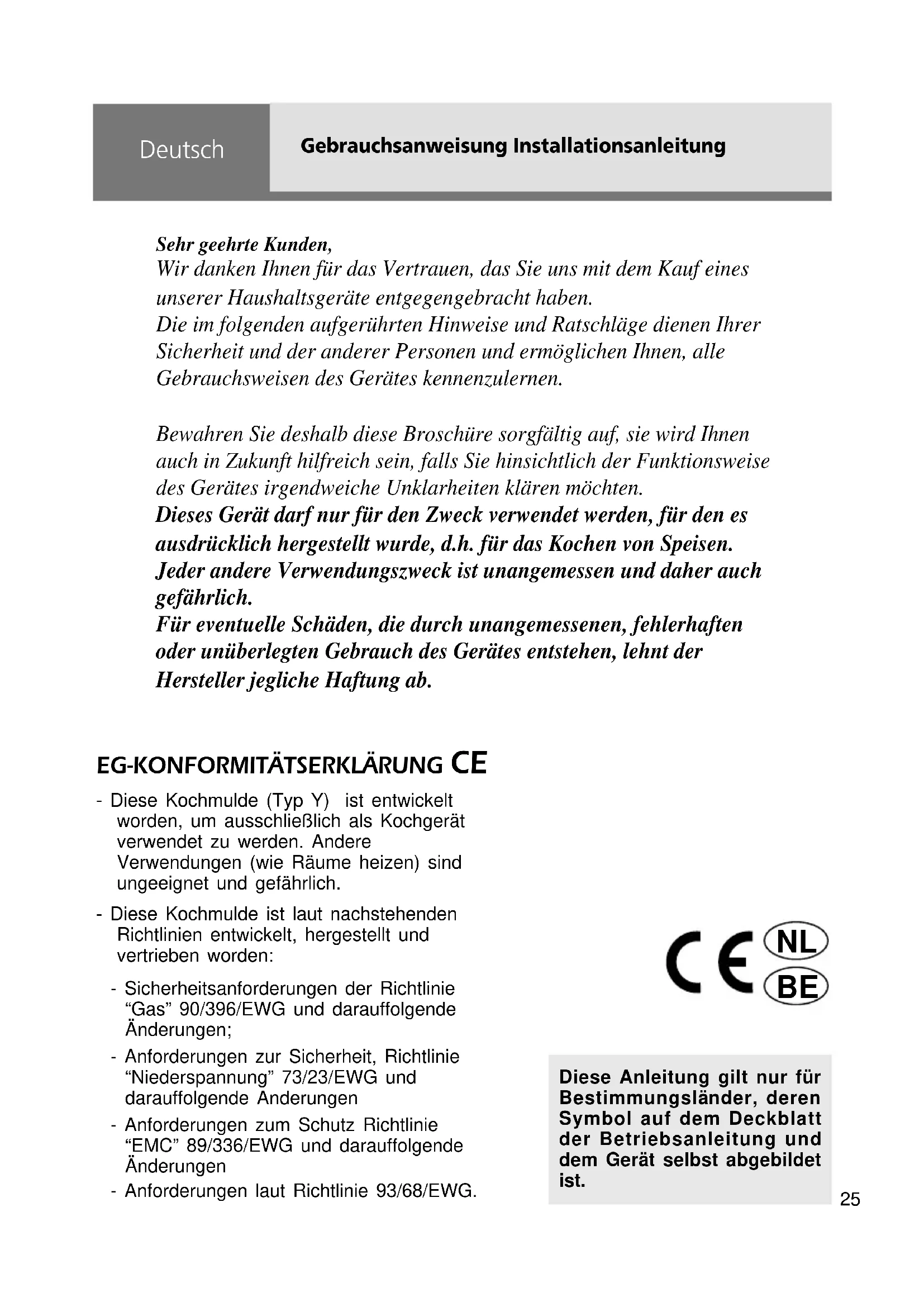 - Diese Kochmulde (Typ Y) ist entwickeltworden, um ausschließlich als Kochgerätverwendet zu werden. AndereVerwendungen (wie Räume heizen) sindungeeignet und gefährlich. - Diese Kochmulde ist laut nachstehendenRichtlinien entwickelt, hergestellt undvertrieben worden: - Sicherheitsanforderungen der Richtlinie“Gas” 90/396/EWG und darauffolgendeÄnderungen;- Anforderungen zur Sicherheit, Richtlinie“Niederspannung” 73/23/EWG unddarauffolgende Anderungen- Anforderungen zum Schutz Richtlinie“EMC” 89/336/EWG und darauffolgendeÄnderungen- Anforderungen laut Richtlinie 93/68/EWG. Diese Anleitung gilt nur fürBestimmungsländer, derenSymbol auf dem Deckblattder Betriebsanleitung unddem Gerät selbst abgebildet ist. Sehr geehrte Kunden, Wir danken Ihnen für das Vertrauen, das Sie uns mit dem Kauf eines unserer Haushaltsgeräte entgegengebracht haben. Die im folgenden aufgerührten Hinweise und Ratschläge dienen Ihrer Sicherheit und der anderer Personen und ermöglichen Ihnen, alle Gebrauchsweisen des Gerätes kennenzulernen. Bewahren Sie deshalb diese Broschüre sorgfältig auf, sie wird Ihnen auch in Zukunft hilfreich sein, falls Sie hinsichtlich der Funktionsweise des Gerätes irgendweiche Unklarheiten klären möchten. Dieses Gerät darf nur für den Zweck verwendet werden, für den es ausdrücklich hergestellt wurde, d.h. für das Kochen von Speisen. Jeder andere Verwendungszweck ist unangemessen und daher auch gefährlich. Für eventuelle Schäden, die durch unangemessenen, fehlerhaften oder unüberlegten Gebrauch des Gerätes entstehen, lehnt der Hersteller jegliche Haftung ab. Gebrauchsanweisung Installationsanleitung Deutsch