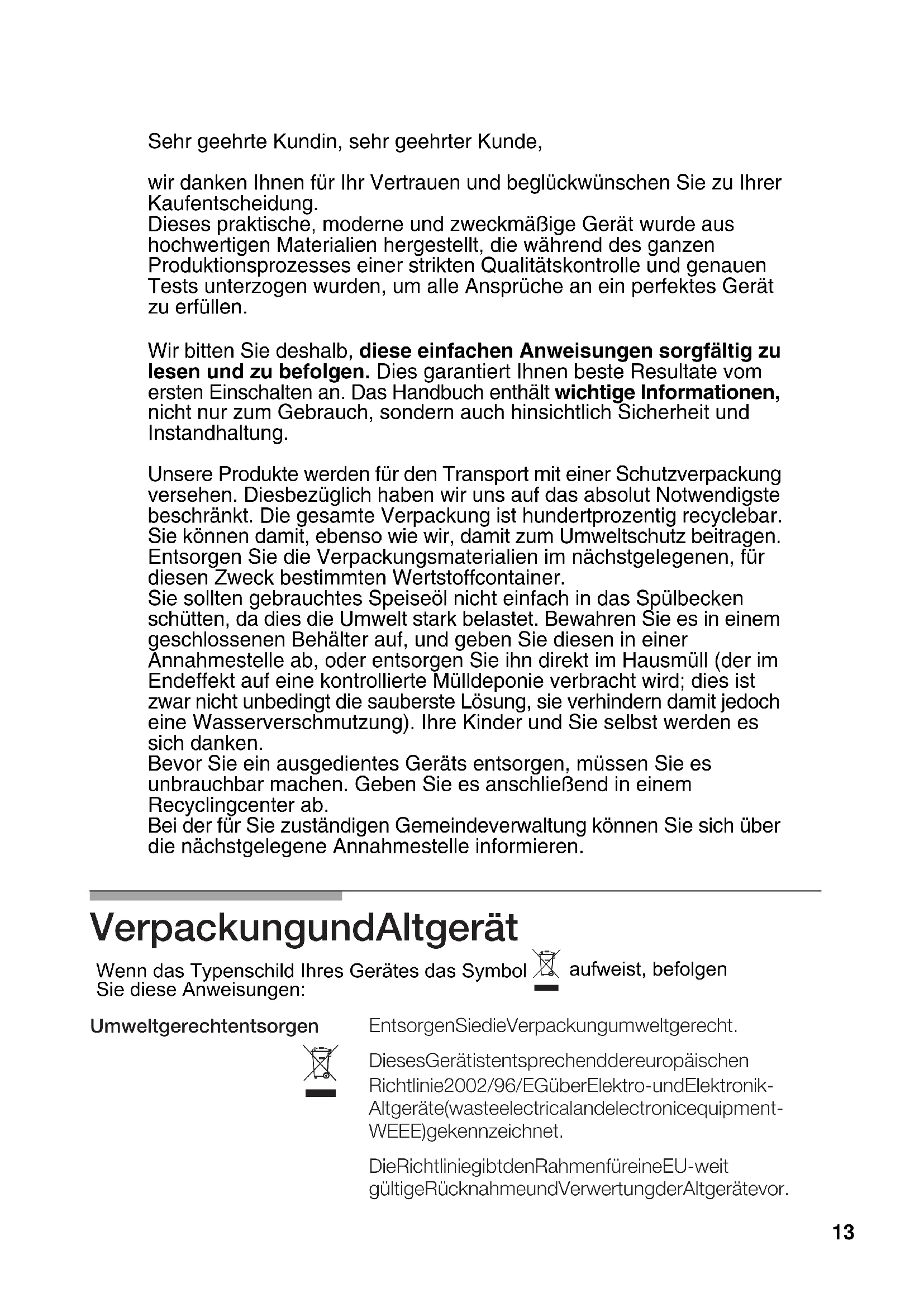 Open any intermediate stopcocks. one. ...if the kitchen smells of gas? -One of the valves has been gas bottle is in order. left open. -Check that the coupling on the ...if all the burners switch off and an acoustic signal is emitted? -Detection of a general fault. If it does not, call the -After a minute, a beep will sound. Technical Service.Conditions of warranty The conditions of warranty are those set out by our company's representatives in the country where you purchased your appliance. The salesperson that sold you the appliance will be only too pleased to inform you as to the details of these conditions. Proof of purchase must be produced when making any kind of claim against the warranty. The manufacturer reserves the right to modify these conditions. Should you need to contact our Service Centre, please quote the following information: E - NR FD These indications appear on your appliance's characteristics plate on the bottom of your appliance. 12Sehr geehrte Kundin, sehr geehrter Kunde, wir danken Ihnen für Ihr Vertrauen und beglückwünschen Sie zu Ihrer Kaufentscheidung. Dieses praktische, moderne und zweckmäßige Gerät wurde aus hochwertigen Materialien hergestellt, die während des ganzen Produktionsprozesses einer strikten Qualitätskontrolle und genauen Tests unterzogen wurden, um alle Ansprüche an ein perfektes Gerät Wir bitten Sie deshalb, diese einfachen Anweisungen sorgfältig zu lesen und zu befolgen. Dies garantiert Ihnen beste Resultate vom ersten Einschalten an. Das Handbuch enthält wichtige Informationen, nicht nur zum Gebrauch, sondern auch hinsichtlich Sicherheit und Instandhaltung. Unsere Produkte werden für den Transport mit einer Schutzverpackung versehen. Diesbezüglich haben wir uns auf das absolut Notwendigste beschränkt. Die gesamte Verpackung ist hundertprozentig recyclebar. Sie können damit, ebenso wie wir, damit zum Umweltschutz beitragen. Entsorgen Sie die Verpackungsmaterialien im nächstgelegenen, für diesen Zweck bestimmten Wertstoffcontainer. Sie sollten gebrauchtes Speiseöl nicht einfach in das Spülbecken schütten, da dies die Umwelt stark belastet. Bewahren Sie es in einem geschlossenen Behälter auf, und geben Sie diesen in einer Annahmestelle ab, oder entsorgen Sie ihn direkt im Hausmüll (der im Endeffekt auf eine kontrollierte Mülldeponie verbracht wird; dies ist zwar nicht unbedingt die sauberste Lösung, sie verhindern damit jedoch eine Wasserverschmutzung). Ihre Kinder und Sie selbst werden es sich danken. Bevor Sie ein ausgedientes Geräts entsorgen, müssen Sie es unbrauchbar machen. Geben Sie es anschließend in einem Recyclingcenter ab. Bei der für Sie zuständigen Gemeindeverwaltung können Sie sich über die nächstgelegene Annahmestelle informieren.
