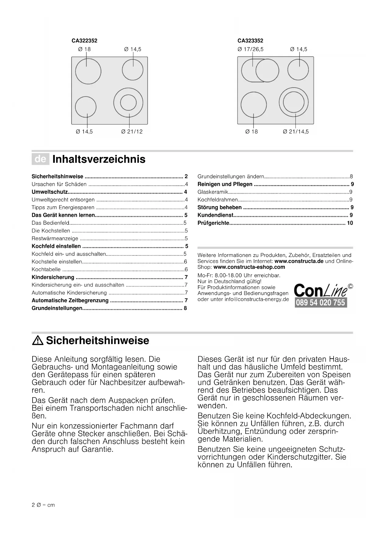- [de] Gebrauchsanleitung 2 [fr] Notice d’utilisation 12 [en] Instruction manual 22 [nl] Gebruiksaanwijzing 31 CA322352, CA323352 Kochfeld Table de cuisson Hob Kookplaat2 Ø = cm Ø Inhaltsverzeichnis [de]Gebrauchsanleitung Sicherheitshinweise p. 2