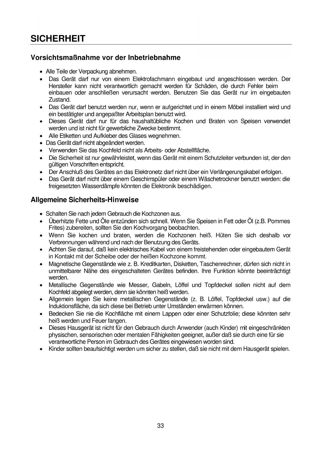 - ELEKTROANSCHLUSS SICHERHEIT Vorsichtsmaßnahme vor der Inbetriebnahme Alle Teile der Verpackung abnehmen. Das Gerät darf nur von einem Elektrofachmann eingebaut und angeschlossen werden. Der Hersteller kann nicht verantwortlich gemacht werden für Schäden, die durch Fehler beim einbauen oder anschließen verursacht werden. Benutzen Sie das Gerät nur im eingebauten Zustand. Das Gerät darf benutzt werden nur, wenn er aufgerichtet und in einem Möbel installiert wird und ein bestätigter und angepaßter Arbeitsplan benutzt wird. Dieses Gerät darf nur für das haushaltübliche Kochen und Braten von Speisen verwendet werden und ist nicht für gewerbliche Zwecke bestimmt. Alle Etiketten und Aufkleber des Glases wegnehmen. Das Gerät darf nicht abgeändert werden. Verwenden Sie das Kochfeld nicht als Arbeits- oder Abstellfläche. Die Sicherheit ist nur gewährleistet, wenn das Gerät mit einem Schutzleiter verbunden ist, der den gültigen Vorschriften entspricht. Der Anschluß des Gerätes an das Elektronetz darf nicht über ein Verlängerungskabel erfolgen. Das Gerät darf nicht über einem Geschirrspüler oder einem Wäschetrockner benutzt werden: die freigesetzten Wasserdämpfe könnten die Elektronik beschädigen. Allgemeine Sicherheits-Hinweise Schalten Sie nach jedem Gebrauch die Kochzonen aus. Überhitzte Fette und Öle entzünden sich schnell. Wenn Sie Speisen in Fett oder Öl (z.B. Pommes Frites) zubereiten, sollten Sie den Kochvorgang beobachten. Wenn Sie kochen und braten, werden die Kochzonen heiß. Hüten Sie sich deshalb vor Verbrennungen während und nach der Benutzung des Geräts. Achten Sie darauf, daß kein elektrisches Kabel von einem freistehenden oder eingebautem Gerät in Kontakt mit der Scheibe oder der heißen Kochzone kommt. Magnetische Gegenstände wie z. B. Kreditkarten, Disketten, Taschenrechner, dürfen sich nicht in unmittelbarer Nähe des eingeschalteten Gerätes befinden. Ihre Funktion könnte beeinträchtigt werden. Metallische Gegenstände wie Messer, Gabeln, Löffel und Topfdeckel sollen nicht auf dem Kochfeld abgelegt werden, denn sie könnten heiß werden. Allgemein legen Sie keine metallischen Gegenstände (z. B. Löffel, Topfdeckel usw.) auf die Induktionsfläche, da sich diese bei Betrieb unter Umständen erwärmen können. Bedecken Sie nie die Kochfläche mit einem Lappen oder einer Schutzfolie; diese könnten sehr heiß werden und Feuer fangen. Dieses Hausgerät ist nicht für den Gebrauch durch Anwender (auch Kinder) mit eingeschränkten physischen, sensorischen oder mentalen Fähigkeiten geeignet, außer daß sie durch eine für sie verantwortliche Person im Gebrauch des Gerätes eingewiesen worden sind. Kinder sollten beaufsichtigt werden um sicher zu stellen, daß sie nicht mit dem Hausgerät spielen.34 Schütz vor Beschädigung Verwenden Sie keine Töpfe oder Pfannen mit ungeschliffenem oder beschädigtem Boden (z.B. aus Guß). Diese können die Glaskeramikscheiben verkratzen. Beachten Sie, daß auch Sandkörner Kratzer verursachen können. Glaskeramik ist unempfindlich gegen Temperaturschocks und sehr widerstandsfähig, jedoch nicht unzerbrechlich. Besonders spitze und harte Gegenstände, die auf die Kochfläche fallen, können sie beschädigen. Töpfe und Ränder nicht an der Scheibe anstoßen. Die Kochzonen nicht mit leerem Kochgeschirr benützen. Vermeiden Sie Zucker, Kunstoff, oder Alufolie auf den heißen Kochzonen. Diese Stoffe schmelzen, kleben fest und können dadurch beim Abkühlen Risse, Brüche oder andere bleibende Veränderungen in der Scheibe verursachen. Falls Sie trotzdem auf die heißen Kochzonen gelangen, schalten Sie das Gerät bitte aus, und entfernen Sie diese Stoffe noch im heißen Zustand. Da die Kochzonen heiß sind, besteht Verbrennungsgefahr. Stellen Sie in keinem Fall heißes Kochgeschirr auf der Steuerung ab. Die Elektronik unter dem Glas könnte beschädigt werden. Befindet sich unter dem eingebauten Gerät eine Schublade, muß auf einen Mindestabstand von 2 cm zwischen der Unterseite des Gerätes und dem Schubladeninhalt geachtet werden, da sonst die Belüftung des Gerätes nicht gewährleistet ist. Es dürfen keine brennbaren Gegenstände (z.B. Spraydosen) in dieser Schublade aufbewahrt werden. Die möglichen Besteckkästen in der Schublade müssen aus hitzebeständigem Material sein. Erhitzen Sie keine geschlossenen Behälter (z.B. Konservendosen) auf den Kochzonen. Durch den entsprechenden Überdruck können die Behälter bzw. Dosen platzen, und es besteht Verletzungsgefahr! Vorsichtsmaßnahmen bei Geräteausfall Sollte ein Fehler festgestellt werden, muß das Gerät ausgeschaltet und vom Netz getrennt werden. Wenn Brüche, Sprünge oder Risse auf dem Glas auftreten: schalten Sie das Kochfeld sofort aus, schrauben Sie die Sicherung für das Kochfeld ab bzw. nehmen Sie diese heraus, und wenden Sie sich an unseren Kundendienst oder an Ihren Fachhändler. Reparaturen am Gerät dürfen nur von Fachkräften durchgeführt werden. WARNUNG: Wenn die Glasoberfläche gesprungen ist, ist das Gerät auszuschalten um die Gefahr eines elektrischen Schlages zu vermeiden. Schutz vor weiteren Gefahren Achten Sie darauf, daß das Kochgeschirr immer zentriert auf der Kochzone plaziert ist. Der Pfannenboden, muß möglichst viel von der Kochzone abdecken. Für Personen mit einem Herzschrittmacher: in der Nähe des eingeschalteten Gerätes entsteht ein elektromagnetisches Feld, das eventuell den Herzschrittmacher beeinträchtigen würde. Wenden Sie sich bitte im Zweifelsfall an den Hersteller des Herzschrittmachers oder an Ihren Arzt. Benutzen sie keinen syntetique oder aluminum Bereich: Sie könnten auf der kochzone verschmelzen. p. 4533