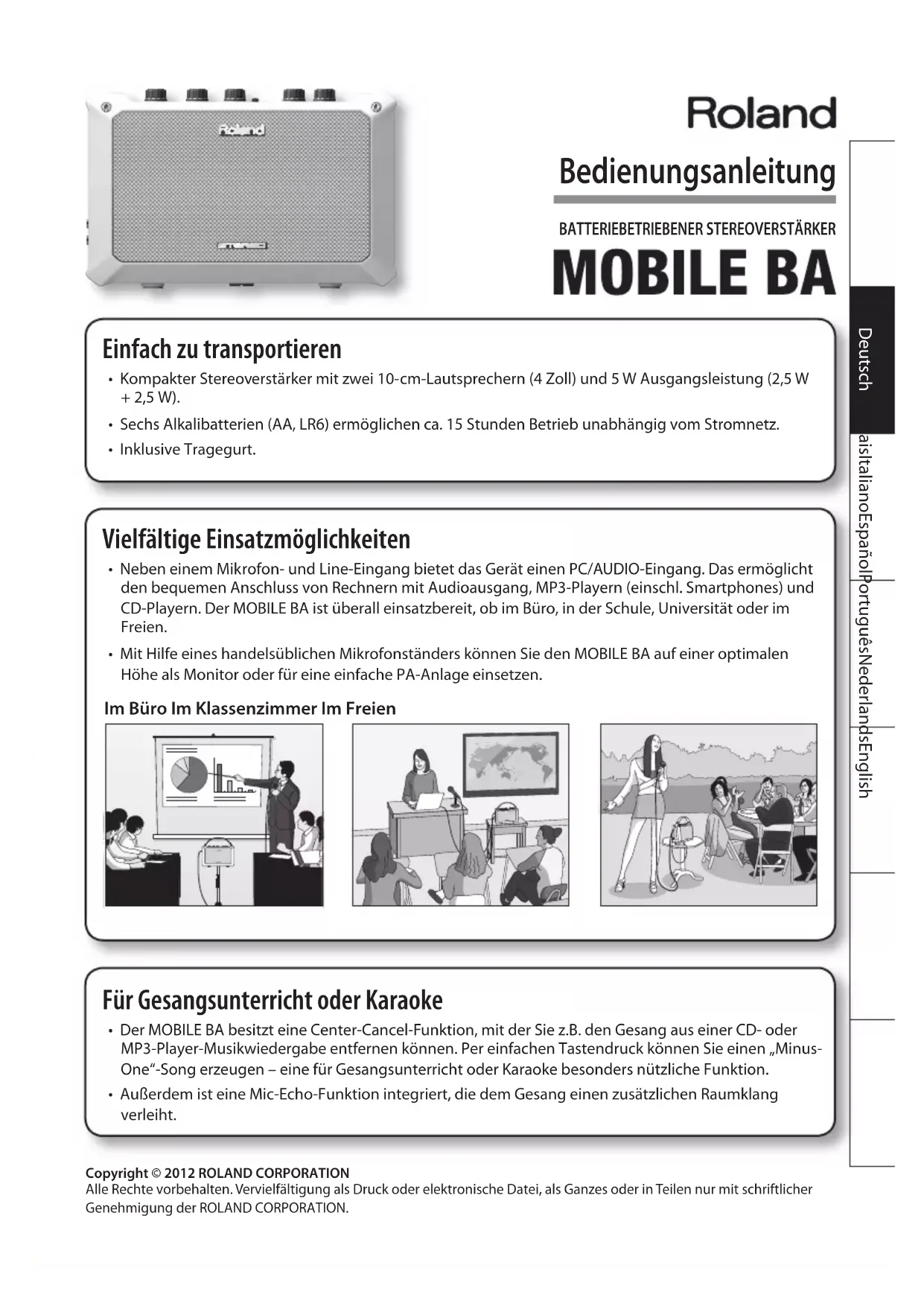 - Inklusive Tragegurt. Copyright © 2012 ROLAND CORPORATION Alle Rechte vorbehalten. Vervielfältigung als Druck oder elektronische Datei, als Ganzes oder in Teilen nur mit schriftlicher Genehmigung der ROLAND CORPORATION. Vielfältige Einsatzmöglichkeiten