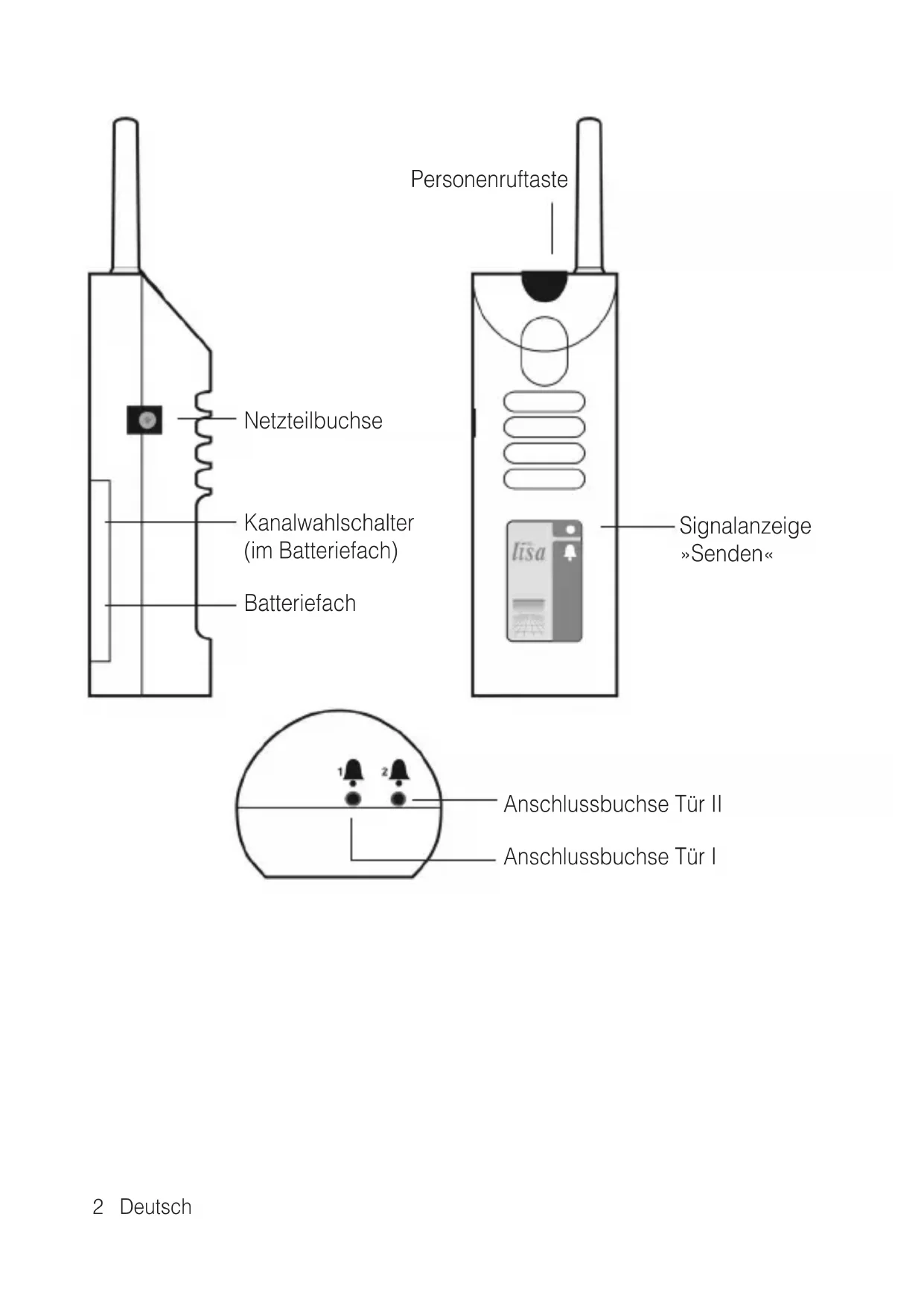 lisa Geräte bitte nicht über längere Zeit direkter Sonneneinstrahlung aus- setzen und darüber hinaus vor großer Hitze, Feuchtigkeit oder star- ker mechanischer Erschütterung schützen. Achtung: Das Gerät ist nicht gegen Spritzwasser geschützt. Stellen Sie keine mit Flüssigkeit gefüllten Gegen- stände, z.B. Vasen, auf das Gerät. Ebenfalls dürfen keine offenen Brand- quellen, wie z.B. brennende Kerzen, auf das Gerät gestellt werden. Bitte achten Sie darauf, dass die Bat- terien keiner übermäßigen Wärme- quelle wie Sonneneinstrahlung, Feuer oder dergleichen ausgesetzt werden. Garantie Der Funk-Türklingelsender galva- nisch weist eine hohe Betriebs - sicherheit auf. Sollten trotz sach - gerechter Bedienung Störungen auf- treten, setzen Sie sich bitte mit Ihrem Fachhändler in Verbindung oder wenden Sie sich direkt an den Her- steller. Die Garantieleistung umfasst die kostenlose Reparatur sowie den kostenlosen Rückversand. Vorausset- zung dafür ist das Einsenden in der Originalver packung, werfen Sie diese also nicht weg. Die Garantie verfällt bei Schäden, die durch unsachgemäße Behandlung oder Reparaturversuchen von nicht autorisierten Personen (Zerstörung des Gerätesiegels) herbeigeführt wurden. Garantiereparaturen werden nur bei Einsendung der ausgefüllten Garantie karte und einer Kopie der Rechnung/Kassenbeleg des Fach- händlers durchgeführt. Die Gerä tenummer muss in jedem Fall mit angegeben werden. Batterielebensdauer Die Batterielebensdauer des Sen ders beträgt unter normalen Bedingungen (7 Sendevorgänge pro Tag) ca. 1 Jahr. Um den Batteriezustand zu überprüfen, drücken Sie bitte die Personenruftaste des Senders. Leuchtet die Signal anzeige »Sen- den« des Senders nicht auf, muss die Batterie ausgetauscht werde n! Funk_TuerklGal_1108:BA_Funk_TuerklGal_0108 24.11.2008 13:29 SeDeutsch 7 Technische Daten Stromversorgung: 9 V-Blockbatterie oder über Steckernetzteil Batterielebensdauer: ca. 1 Jahr Frequenz: 868,35 MHz Arbeitsbereich: 0° C – 40° C Höhe (mit Antenne): 147 mm (201 mm) Breite: 50 mm Tiefe: 41 mm Gewicht (inkl. Batteri): 145 g Dieses Produkt entspricht den Normen der europäischen Union. EG Konformitätserklärungen können Sie bei Ihrem Fachhändler oder direkt beim Hersteller dieses Produkts erhalten. Technische Änderungen vorbehalten. Entsorgung von gebrauch ten elektrischen und elektronischen Gerä ten (anzuwenden in den Ländern der Europäischen Union und anderen euro päischen Ländern mit einem se paraten Sammel system für diese Ge räte). Das Symbol auf dem Pro dukt oder seiner Verpa ckung weist darauf hin, dass dieses Produkt nicht als normaler Haushalts abfall zu behandeln ist, sondern an einer Annahme stelle für das Recycling von elektrischen und elektronischen Geräten abgegeben werden muss. Durch Ihren Beitrag zum korrekten Ent sor gen dieses Produkts schützen Sie die Umwelt und die Ge sundheit Ihrer Mitmenschen. Umwelt und Gesund heit werden durch falsches Ent sor gen gefährdet. Materialrecyc- ling hilft den Verbrauch von Roh - stoffen zu verringern. Weitere Infor- mationen über das Re cycling dieses Produkts erhalten Sie von Ihrer Gemeinde, den kommunalen Entsor - gungs betrieben oder dem Geschäft, in welchem Sie das Produkt gekauft haben. Funk_TuerklGal_1108:BA_Funk_TuerklGal_0108 24.11.2008 13:29 Se8 English Channel selector Battery compartment Connection socket Person call button »Send« signal LED Connection socket for door II Connection socket for door I Funk_TuerklGal_1108:BA_Funk_TuerklGal_0108 24.11.2008 13:29 SeEnglish 9 Accessory: doorbell cable. Congratulations on purchasing your RF doorbell transmitter direct . We hope it will give you many years of reassuring operation. Please read through these operating instructions carefully. They tell you how to set up the system correctly and explain all the system’s features to you. Standard components Please check if all following compo- nents are included: