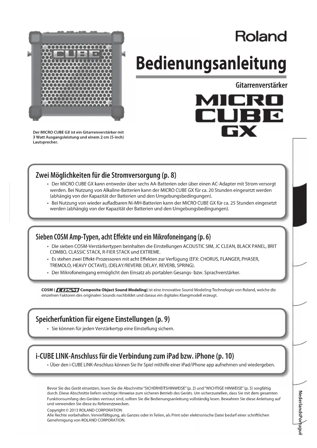 - In the interest of product improvement, the specications and/or appearance of this unit are subject to change without prior notice. Roland MICRO CUBE GX: Guitar AmplierNederlandsPortuguêsEspañolItalianoFrançaisDeutschEnglish Bedienungsanleitung Gitarrenverstärker Bevor Sie das Gerät einsetzen, lesen Sie die Abschnitte “SICHERHEITSHINWEISE” (p. 2) und “WICHTIGE HINWEISE” (p. 5) sorgfältig durch. Diese Abschnitte liefern wichtige Hinweise zum sicheren Betrieb des Geräts. Um sicherzustellen, dass Sie mit dem gesamten Funktionsumfang des Gerätes vertraut sind, sollten Sie die Bedienungsanleitung vollständig lesen. Bewahren Sie diese Anleitung auf und verwenden Sie diese zu Referenzzwecken. Copyright © 2013 ROLAND CORPORATION Alle Rechte vorbehalten. Vervielfältigung, als Ganzes oder in Teilen, als Print oder elektronische Datei bedarf einer schriftlichen Genehmigung von ROLAND CORPORATION. i-CUBE LINK-Anschluss für die Verbindung zum iPad bzw. iPhone (p. 10)