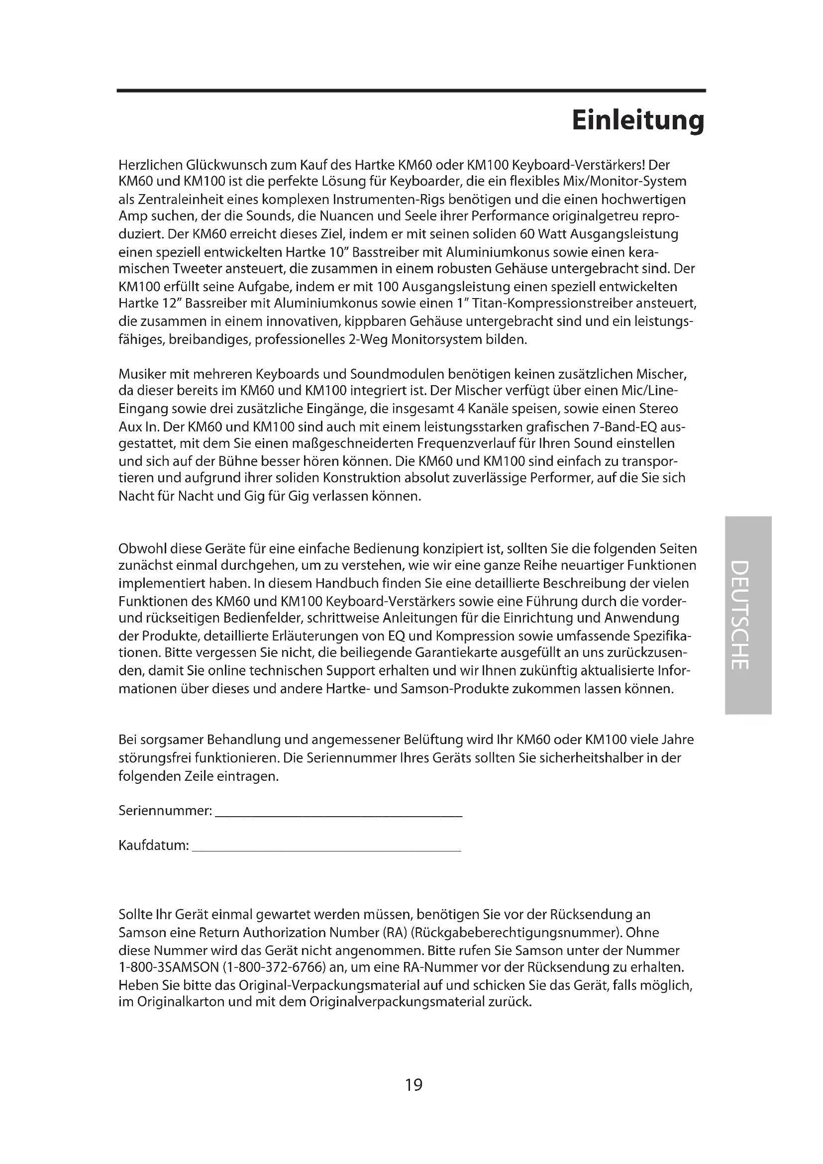 Obwohl diese Geräte für eine einfache Bedienung konzipiert ist, sollten Sie die folgenden Seiten zunächst einmal durchgehen, um zu verstehen, wie wir eine ganze Reihe neuartiger Funktionen implementiert haben. In diesem Handbuch finden Sie eine detaillierte Beschreibung der vielen Funktionen des KM60 und KM100 Keyboard-Verstärkers sowie eine Führung durch die vorder- und rückseitigen Bedienfelder, schrittweise Anleitungen für die Einrichtung und Anwendung der Produkte, detaillierte Erläuterungen von EQ und Kompression sowie umfassende Spezifikationen. Bitte vergessen Sie nicht, die beiliegende Garantiekarte ausgefüllt an uns zurückzusenden, damit Sie online technischen Support erhalten und wir Ihnen zukünftig aktualisierte Informationen über dieses und andere Hartke- und Samson-Produkte zukommen lassen können.