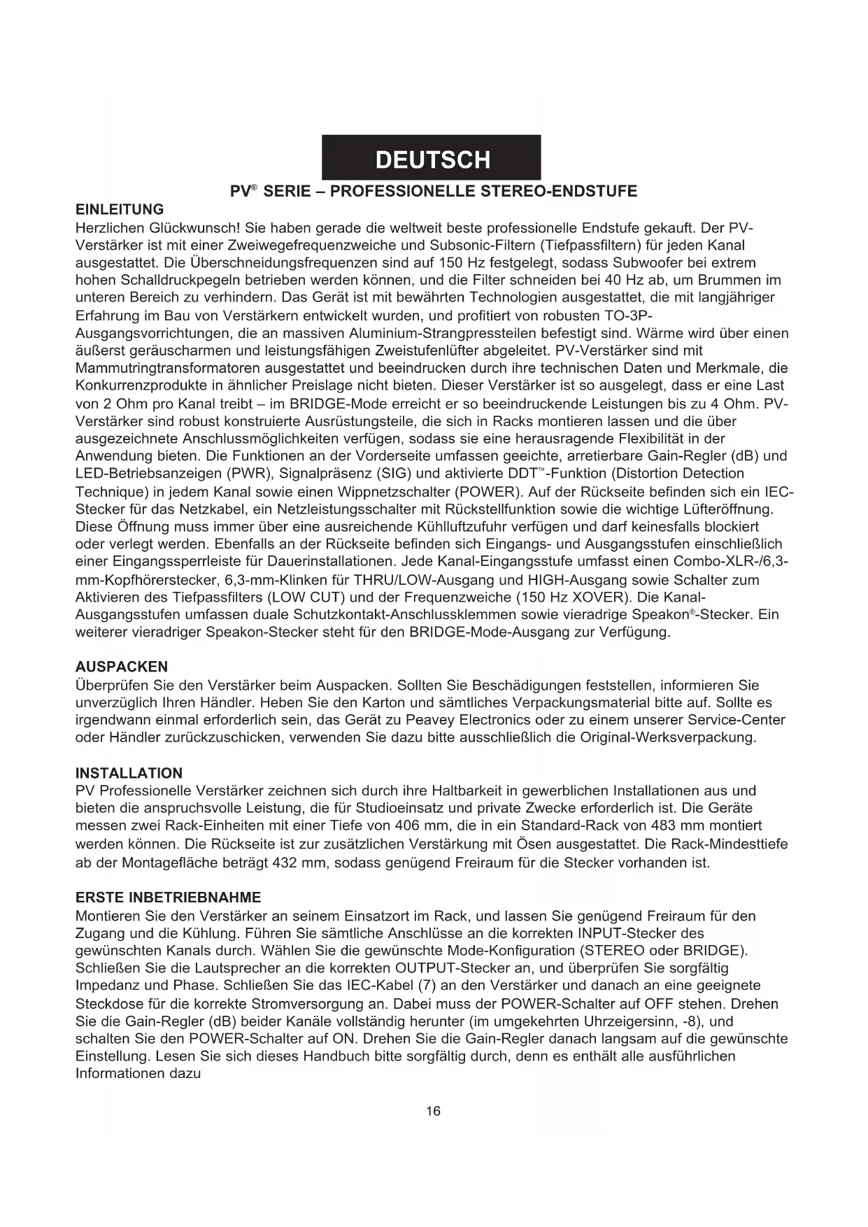 -Stecker. Ein weiterer vieradriger Speakon-Stecker steht für den BRIDGE-Mode-Ausgang zur Verfügung. AUSPACKEN Überprüfen Sie den Verstärker beim Auspacken. Sollten Sie Beschädigungen feststellen, informieren Sie unverzüglich Ihren Händler. Heben Sie den Karton und sämtliches Verpackungsmaterial bitte auf. Sollte es irgendwann einmal erforderlich sein, das Gerät zu Peavey Electronics oder zu einem unserer Service-Center oder Händler zurückzuschicken, verwenden Sie dazu bitte ausschließlich die Original-Werksverpackung. INSTALLATION PV Professionelle Verstärker zeichnen sich durch ihre Haltbarkeit in gewerblichen Installationen aus und bieten die anspruchsvolle Leistung, die für Studioeinsatz und private Zwecke erforderlich ist. Die Geräte messen zwei Rack-Einheiten mit einer Tiefe von 406 mm, die in ein Standard-Rack von 483 mm montiert werden können. Die Rückseite ist zur zusätzlichen Verstärkung mit Ösen ausgestattet. Die Rack-Mindesttiefe ab der Montagefläche beträgt 432 mm, sodass genügend Freiraum für die Stecker vorhanden ist. ERSTE INBETRIEBNAHME Montieren Sie den Verstärker an seinem Einsatzort im Rack, und lassen Sie genügend Freiraum für den Zugang und die Kühlung. Führen Sie sämtliche Anschlüsse an die korrekten INPUT-Stecker des gewünschten Kanals durch. Wählen Sie die gewünschte Mode-Konfiguration (STEREO oder BRIDGE). Schließen Sie die Lautsprecher an die korrekten OUTPUT-Stecker an, und überprüfen Sie sorgfältig Impedanz und Phase. Schließen Sie das IEC-Kabel (7) an den Verstärker und danach an eine geeignete Steckdose für die korrekte Stromversorgung an. Dabei muss der POWER-Schalter auf OFF stehen. Drehen Sie die Gain-Regler (dB) beider Kanäle vollständig herunter (im umgekehrten Uhrzeigersinn, -8), und schalten Sie den POWER-Schalter auf ON. Drehen Sie die Gain-Regler danach langsam auf die gewünschte Einstellung. Lesen Sie sich dieses Handbuch bitte sorgfältig durch, denn es enthält alle ausführlichen Informationen dazuFUNKTIONEN AN DER VORDERSEITE (1) EINGANGSVERSTÄRKUNG – GAIN (dB) Mit diesen Reglern wird die Eingangsverstärkung aller Kanäle eingestellt. Dadurch wird die „Lautstärke“ jedes Endstufenkanals bei einem bestimmten Eingangssignalpegel festgelegt. Eine maximale Eingangsverstärkung wird bei vollständig im Uhrzeigersinn aufgedrehtem Regler erzielt (+32 dB, 40 X), wodurch ein maximaler Mischpult- bzw. System-Headroom erreicht wird. Ist der Regler nicht vollständig im Uhrzeigersinn aufgedreht, wird zwar ein geringeres Systemrauschen, jedoch auch ein geringerer Mischpult- bzw. System-Headroom erzielt. Ist der Regler vollständig im entgegengesetzten Uhrzeigersinn gedreht, steht er auf der Einstellung OFF (-8). Es wird empfohlen, beim Einschalten einer neuen Installation diese Einstellung zu wählen, um die Systemlautsprecher zu schützen. (2) POWER LEDS (PWR) Diese Anzeigen leuchten, wenn der Verstärker über das Netz mit Wechselstrom versorgt wird und beide Kanäle betriebsbereit sind. Falls in einem der Kanäle eine Störung vorliegt, die Betriebstemperaturgrenzen überschritten werden oder der Netzleistungsschalter auslöst, sind die PWR-LEDs beider Kanäle unbeleuchtet, was zeigt, dass das Gerät „abgeschaltet“ ist. Wird der BRIDGE-Modus gewählt, leuchtet die PWR-Anzeige an Kanal B nicht auf; dies zeigt, dass der BRIDGE-Modus ausgewählt ist. (3) LEDs FÜR AKTIVES SIGNAL (SIG) Diese Anzeigen leuchten, wenn der zugehörige Kanal-Ausgangssignalpegel 1 V RMS überschreitet. (4) LEDs FÜR AKTIVIERTE DDT