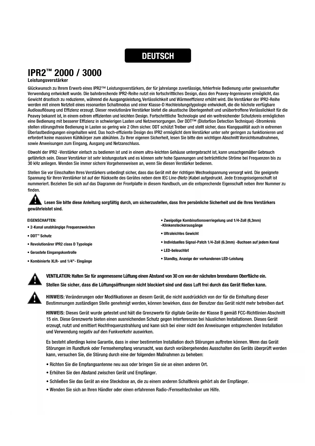2000 / 3000 Leistungsverstärker Glückwunsch zu Ihrem Erwerb eines IPR2™ Leistungsverstärkers, der für jahrelange zuverlässige, fehlerfreie Bedienung unter gewissenhafter Verwendung entwickelt wurde. Die bahnbrechende IPR2-Reihe nutzt ein fortschrittliches Design, dass den Peavey-Ingenieuren ermöglicht, das Gewicht drastisch zu reduzieren, während die Ausgangsleistung, Verlässlichkeit und Wärmeeffizienz erhöht wird. Die Verstärker der IPR2-Reihe werden mit einem Netzteil eines resonanten Schaltmodus und einer Klasse-D Hochleistungstypologie entwickelt, die die höchste verfügbare Audioauflösung und Effizienz erzeugt. Dieser revolutionäre Verstärker bietet die akustische Überlegenheit und unübertroffene Verlässlichkeit für die Peavey bekannt ist, in einem extrem effizienten und leichten Design. Fortschrittliche Technologie und ein weitreichender Schutzkreis ermöglichen eine Bedienung mit besserer Effizienz in schwierigen Lasten und Netzversorgungen. Der DDT™ (Distortion Detection Technique) -Stromkreis stellen störungsfreie Bedienung in Lasten so gering wie 2 Ohm sicher. DDT schützt Treiber und stellt sicher, dass Klangqualität auch in extremen Überlastbedingungen eingehalten wird. Das hoch-effiziente Design des IPR2 ermöglicht dem Verstärker unter sehr geringen zu funktionieren und erfordert keine massiven Kühlkörper zum abkühlen. Zu Ihrer eigenen Sicherheit, lesen Sie bitte den wichtigen Abschnitt Vorsichtsmaßnahmen, sowie Anweisungen zum Eingang, Ausgang und Netzanschluss. Obwohl der IPR2 -Verstärker einfach zu bedienen ist und in einem ultra-leichten Gehäuse untergebracht ist, kann unsachgemäßer Gebrauch gefährlich sein. Dieser Verstärker ist sehr leistungsstark und es können sehr hohe Spannungen und beträchtliche Ströme bei Frequenzen bis zu 30 kHz anliegen. Wenden Sie immer sichere Vorgehensweisen an, wenn Sie diesen Verstärker bedienen. Stellen Sie vor Einschalten Ihres Verstärkers unbedingt sicher, dass das Gerät mit der richtigen Wechselspannung versorgt wird. Die geeignete Spannung für Ihren Verstärker ist auf der Rückseite des Gerätes neben dem IEC Line-(Netz-)Kabel aufgedruckt. Jede Erzeugniseigenschaft ist nummeriert. Beziehen Sie sich auf das Diagramm der Frontplatte in diesem Handbuch, um die entsprechende Eigenschaft neben ihrer Nummer zu finden. Lesen Sie bitte diese Anleitung sorgfältig durch, um sicherzustellen, dass Ihre persönliche Sicherheit und die Ihres Verstärkers gewährleistet sind. DEUTSCH VENTILATION: Halten Sie für angemessene Lüftung einen Abstand von 30 cm von der nächsten brennbaren Oberfläche ein. Stellen Sie sicher, dass die Lüftungsöffnungen nicht blockiert sind und dass Luft frei durch das Gerät fließen kann. EIGENSCHAFTEN:• 2-Kanal unabhängige Frequenzweichen• DDT Schutz• Revolutionärer IPR2 class D Typologie• Gerastete Eingangskontrolle• Kombinierte XLR- und 1/4”- Eingänge• Zweipolige Kombinationsverriegelung und 1/4-Zoll (6,3mm) -Klinkensteckerausgänge• Ultraleichtes Gewicht• Individuelles Signal-Patch 1/4-Zoll (6.3mm) -Buchsen auf jedem Kanal• LED-beleuchtet• Standby, Anzeige der vorhandenen LED-Leistung HINWEIS: Veränderungen oder Modifikationen an diesem Gerät, die nicht ausdrücklich von der für die Einhaltung dieser Bestimmungen zuständigen Stelle genehmigt werden, können bewirken, dass der Benutzer das Gerät nicht mehr betreiben darf. HINWEIS: Dieses Gerät wurde getestet und hält die Grenzwerte für digitale Geräte der Klasse B gemäß FCC-Richtlinien Abschnitt 15 ein. Diese Grenzwerte bieten einen ausreichenden Schutz gegen Interferenzen bei häuslichen Installationen. Dieses Gerät erzeugt, nutzt und emittiert Hochfrequenzstrahlung und kann sich bei einer nicht den Anweisungen entsprechenden Installation und Verwendung negativ auf den Funkverkehr auswirken. Es besteht allerdings keine Garantie, dass in einer bestimmten Installation doch Störungen auftreten können. Wenn das Gerät Störungen im Rundfunk oder Fernsehempfang verursacht, was durch vorübergehendes Ausschalten des Geräts überprüft werden kann, versuchen Sie, die Störung durch eine der folgenden Maßnahmen zu beheben:
