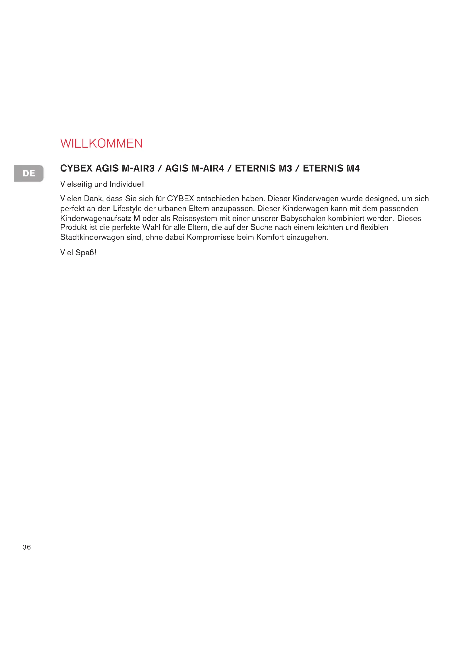 Willkommen CYBEX Agis M-Air3 / Agis M-Air4 / EtErnis M3 / EtErnis M4 Vielseitig und Individuell Vielen Dank, dass Sie sich für CYBEX entschieden haben. Dieser Kinderwagen wurde designed, um sich perfekt an den Lifestyle der urbanen Eltern anzupassen. Dieser Kinderwagen kann mit dem passenden Kinderwagenaufsatz M oder als Reisesystem mit einer unserer Babyschalen kombiniert werden. Dieses Produkt ist die perfekte Wahl für alle Eltern, die auf der Suche nach einem leichten und flexiblen Stadtkinderwagen sind, ohne dabei Kompromisse beim Komfort einzugehen. Viel Spaß!37