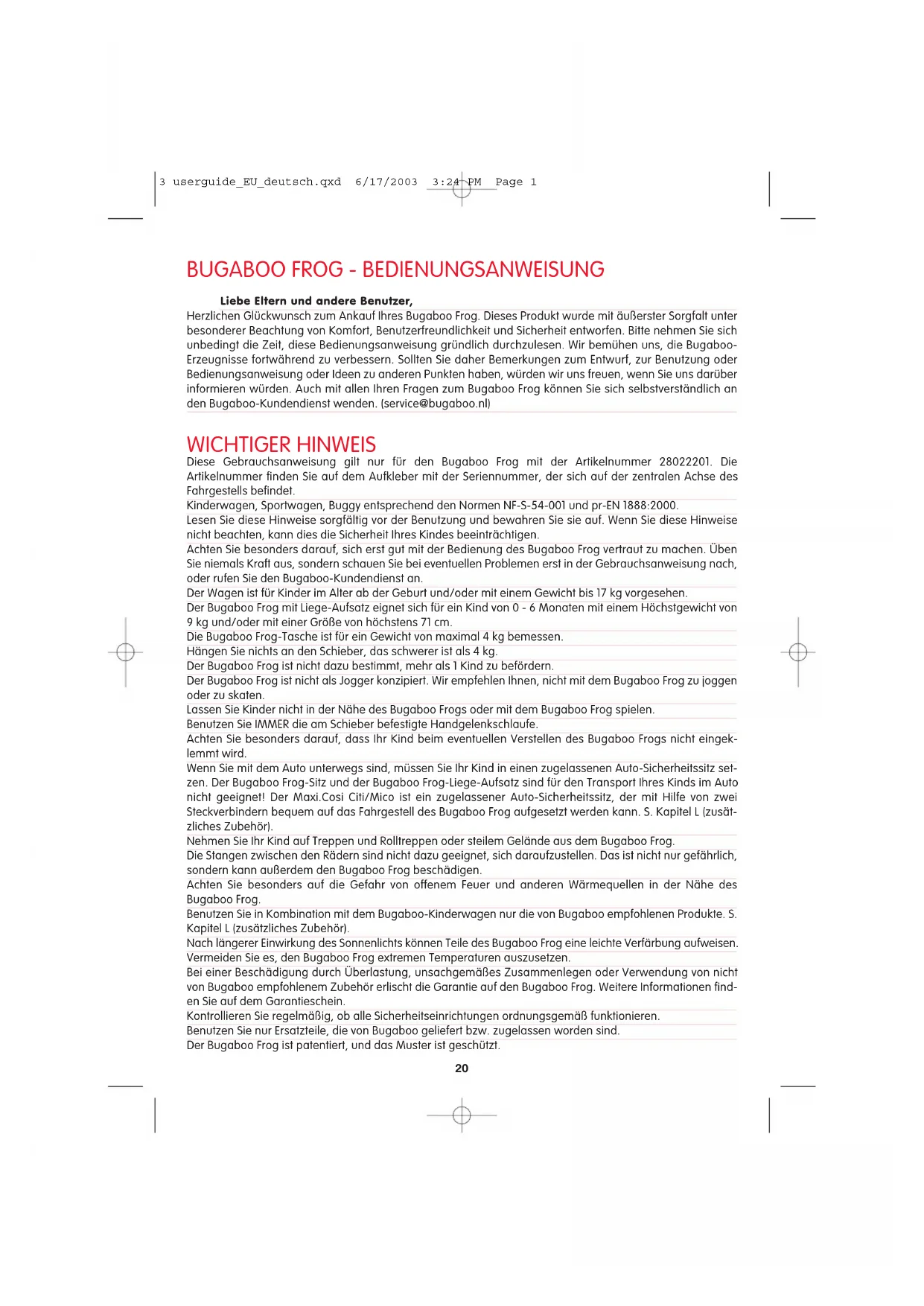2 userguide_EU_english.qxd 6/17/2003 3:17 PM Page 9BUGABOO FROG - BEDIENUNGSANWEISUNG Liebe Eltern und andere Benutzer, Herzlichen Glückwunsch zum Ankauf Ihres Bugaboo Frog. Dieses Produkt wurde mit äußerster Sorgfalt unter besonderer Beachtung von Komfort, Benutzerfreundlichkeit und Sicherheit entworfen. Bitte nehmen Sie sich unbedingt die Zeit, diese Bedienungsanweisung gründlich durchzulesen. Wir bemühen uns, die Bugaboo- Erzeugnisse fortwährend zu verbessern. Sollten Sie daher Bemerkungen zum Entwurf, zur Benutzung oder Bedienungsanweisung oder Ideen zu anderen Punkten haben, würden wir uns freuen, wenn Sie uns darüber informieren würden. Auch mit allen Ihren Fragen zum Bugaboo Frog können Sie sich selbstverständlich an den Bugaboo-Kundendienst wenden. (service@bugaboo.nl) WICHTIGER HINWEIS Diese Gebrauchsanweisung gilt nur für den Bugaboo Frog mit der Artikelnummer 28022201. Die Artikelnummer finden Sie auf dem Aufkleber mit der Seriennummer, der sich auf der zentralen Achse des Fahrgestells befindet. Kinderwagen, Sportwagen, Buggy entsprechend den Normen NF-S-54-001 und pr-EN 1888:2000. Lesen Sie diese Hinweise sorgfältig vor der Benutzung und bewahren Sie sie auf. Wenn Sie diese Hinweise nicht beachten, kann dies die Sicherheit Ihres Kindes beeinträchtigen. Achten Sie besonders darauf, sich erst gut mit der Bedienung des Bugaboo Frog vertraut zu machen. Üben Sie niemals Kraft aus, sondern schauen Sie bei eventuellen Problemen erst in der Gebrauchsanweisung nach, oder rufen Sie den Bugaboo-Kundendienst an. Der Wagen ist für Kinder im Alter ab der Geburt und/oder mit einem Gewicht bis 17 kg vorgesehen. Der Bugaboo Frog mit Liege-Aufsatz eignet sich für ein Kind von 0 - 6 Monaten mit einem Höchstgewicht von 9 kg und/oder mit einer Größe von höchstens 71 cm. Die Bugaboo Frog-Tasche ist für ein Gewicht von maximal 4 kg bemessen. Hängen Sie nichts an den Schieber, das schwerer ist als 4 kg. Der Bugaboo Frog ist nicht dazu bestimmt, mehr als 1 Kind zu befördern. Der Bugaboo Frog ist nicht als Jogger konzipiert. Wir empfehlen Ihnen, nicht mit dem Bugaboo Frog zu joggen oder zu skaten. Lassen Sie Kinder nicht in der Nähe des Bugaboo Frogs oder mit dem Bugaboo Frog spielen. Benutzen Sie IMMER die am Schieber befestigte Handgelenkschlaufe. Achten Sie besonders darauf, dass Ihr Kind beim eventuellen Verstellen des Bugaboo Frogs nicht eingek- lemmt wird. Wenn Sie mit dem Auto unterwegs sind, müssen Sie Ihr Kind in einen zugelassenen Auto-Sicherheitssitz set- zen. Der Bugaboo Frog-Sitz und der Bugaboo Frog-Liege-Aufsatz sind für den Transport Ihres Kinds im Auto nicht geeignet! Der Maxi.Cosi Citi/Mico ist ein zugelassener Auto-Sicherheitssitz, der mit Hilfe von zwei Steckverbindern bequem auf das Fahrgestell des Bugaboo Frog aufgesetzt werden kann. S. Kapitel L (zusät- zliches Zubehör). Nehmen Sie Ihr Kind auf Treppen und Rolltreppen oder steilem Gelände aus dem Bugaboo Frog. Die Stangen zwischen den Rädern sind nicht dazu geeignet, sich daraufzustellen. Das ist nicht nur gefährlich, sondern kann außerdem den Bugaboo Frog beschädigen. Achten Sie besonders auf die Gefahr von offenem Feuer und anderen Wärmequellen in der Nähe des Bugaboo Frog. Benutzen Sie in Kombination mit dem Bugaboo-Kinderwagen nur die von Bugaboo empfohlenen Produkte. S. Kapitel L (zusätzliches Zubehör). Nach längerer Einwirkung des Sonnenlichts können Teile des Bugaboo Frog eine leichte Verfärbung aufweisen. Vermeiden Sie es, den Bugaboo Frog extremen Temperaturen auszusetzen. Bei einer Beschädigung durch Überlastung, unsachgemäßes Zusammenlegen oder Verwendung von nicht von Bugaboo empfohlenem Zubehör erlischt die Garantie auf den Bugaboo Frog. Weitere Informationen find- en Sie auf dem Garantieschein. Kontrollieren Sie regelmäßig, ob alle Sicherheitseinrichtungen ordnungsgemäß funktionieren. Benutzen Sie nur Ersatzteile, die von Bugaboo geliefert bzw. zugelassen worden sind. Der Bugaboo Frog ist patentiert, und das Muster ist geschützt.