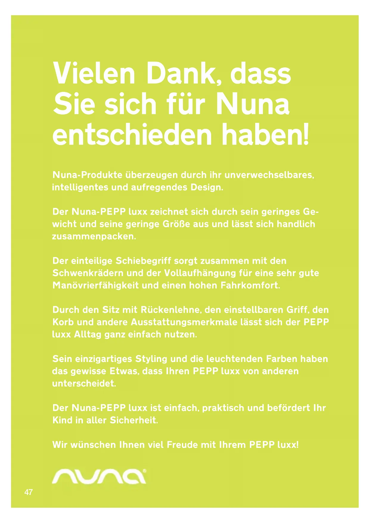 Où trouver les produits Nuna ? Pour trouver le revendeur Nuna le plus proche de chez vous, veuillez consulter notre site web : www.nuna.eu Nous contacter Nous cherchons toujours à améliorer nos produits et à développer de nouvelles idées ; n’hésitez donc pas à nous contacter pour nous faire part de vos commentaires ou questions concernant les produits Nuna. www.nuna.eu Nuna International BV De Beeke 8, 5469 DW, ERP The Netherlands Merci d’avoir choisi Nuna !46 FR47 Vielen Dank, dass Sie sich für Nuna entschieden haben! Nuna-Produkte überzeugen durch ihr unverwechselbares, intelligentes und aufregendes Design. Der Nuna-PEPP luxx zeichnet sich durch sein geringes Ge- wicht und seine geringe Größe aus und lässt sich handlich zusammenpacken. Der einteilige Schiebegriff sorgt zusammen mit den Schwenkrädern und der Vollaufhängung für eine sehr gute Manövrierfähigkeit und einen hohen Fahrkomfort. Durch den Sitz mit Rückenlehne, den einstellbaren Griff, den Korb und andere Ausstattungsmerkmale lässt sich der PEPP luxx Alltag ganz einfach nutzen. Sein einzigartiges Styling und die leuchtenden Farben haben das gewisse Etwas, dass Ihren PEPP luxx von anderen unterscheidet. Der Nuna-PEPP luxx ist einfach, praktisch und befördert Ihr Kind in aller Sicherheit. Wir wünschen Ihnen viel Freude mit Ihrem PEPP luxx!48