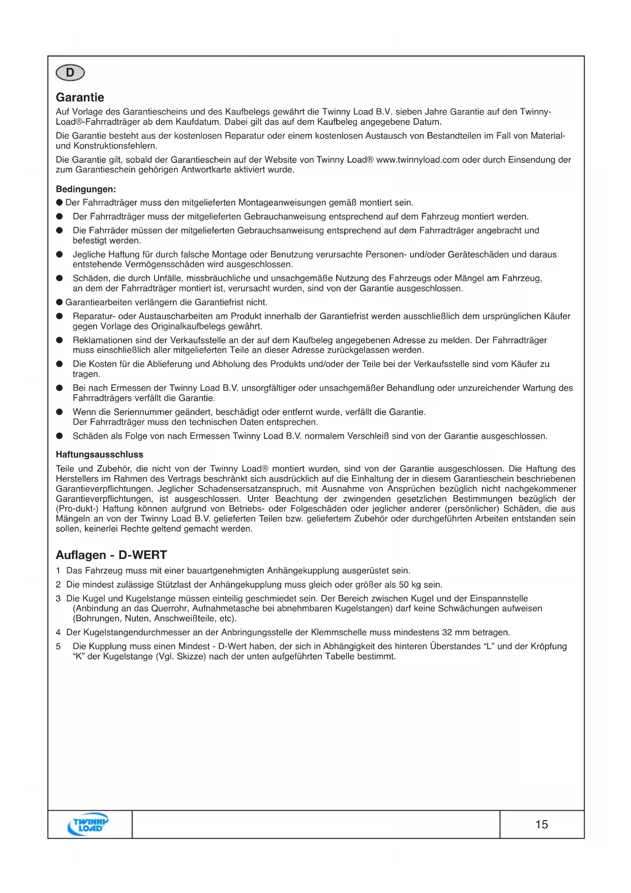 - Bei nach Ermessen der Twinny Load B.V. unsorgfältiger oder unsachgemäßer Behandlung oder unzureichender Wartung des Fahrradträgers verfällt die Garantie.