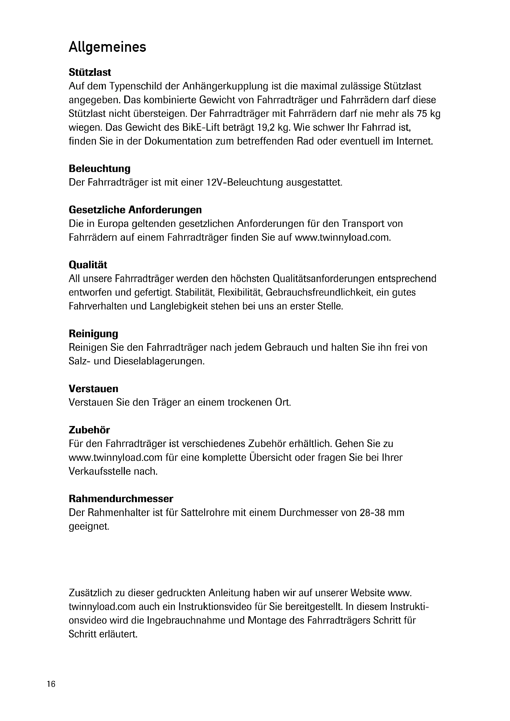 Zusätzlich zu dieser gedruckten Anleitung haben wir auf unserer Website www.twinnyload.com auch ein Instruktionsvideo für Sie bereitgestellt. In diesem Instruktionsvideo wird die Ingebrauchnahme und Montage des Fahrradträgers Schritt für Schritt erläutert.