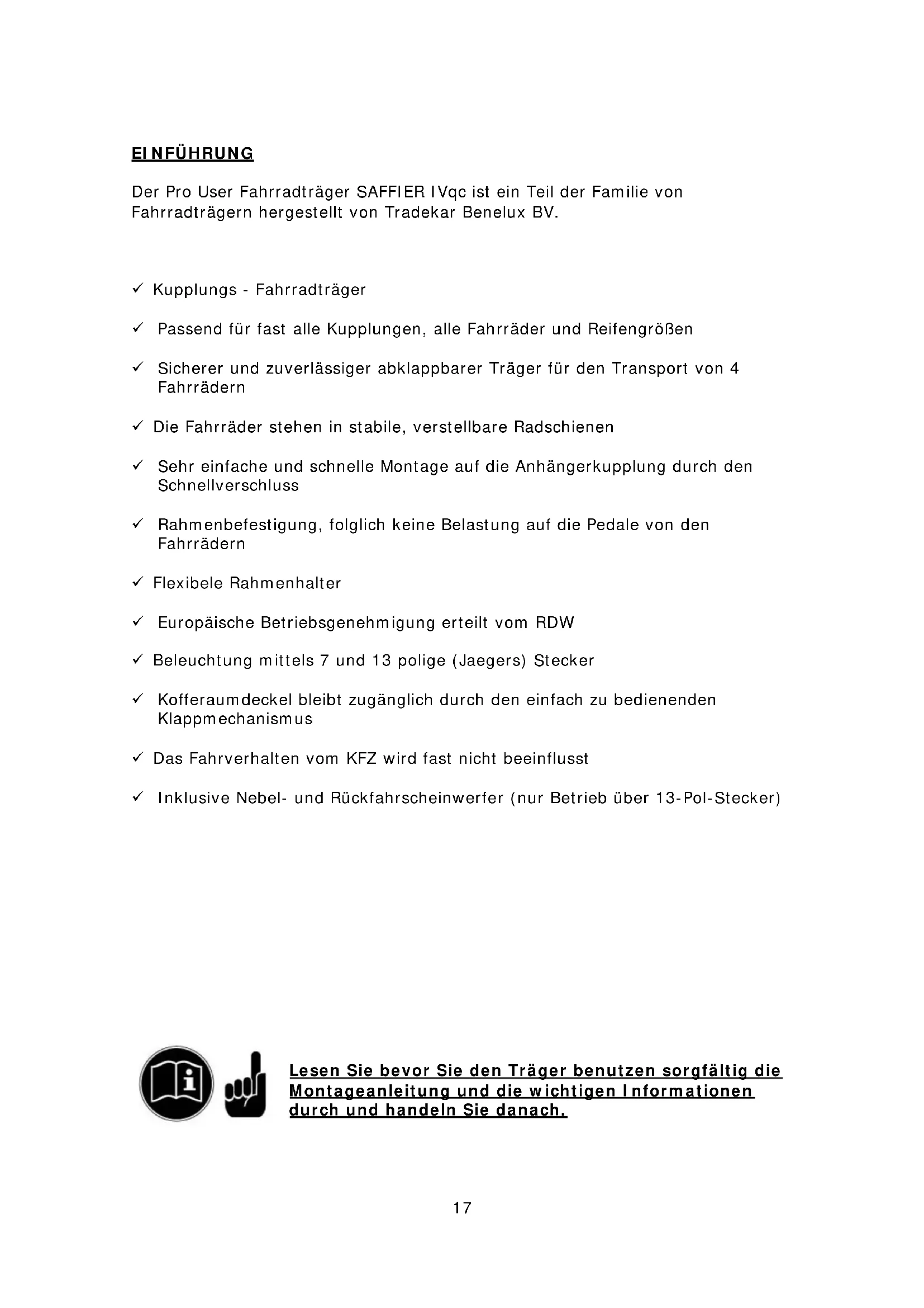 Saffier IVqc 91723 - Fahrradträger Pro-User - Kostenlose Bedienungsanleitung