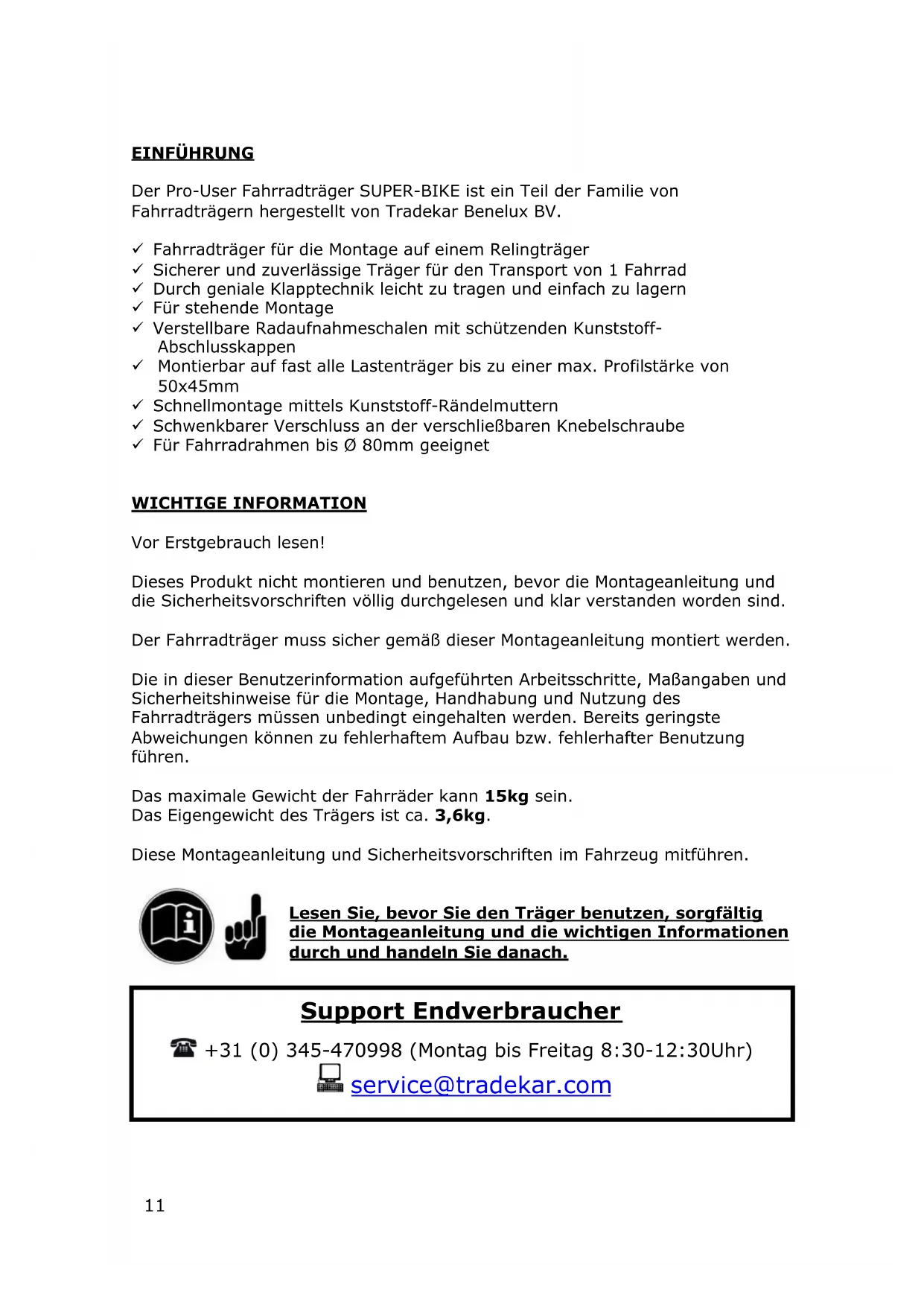 Die in dieser Benutzerinformation aufgeführten Arbeitsschritte, Maßangaben und Sicherheitshinweise für die Montage, Handhabung und Nutzung des Fahrradträgers müssen unbedingt eingehalten werden. Bereits gingste Abweichungen können zu fehlerhaftem Aufbau bzw. fehlerhafter Benutzung führen.