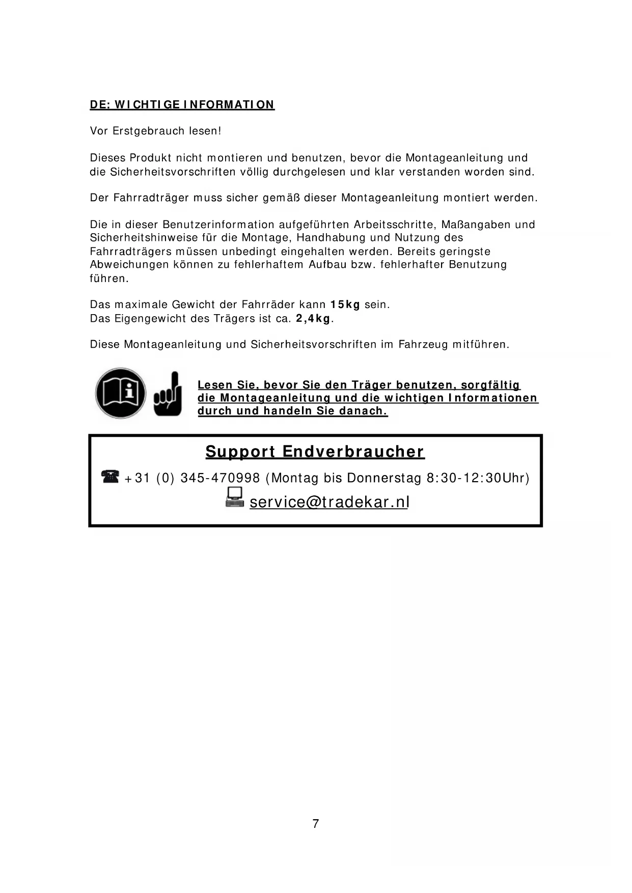 Lesen Sie, bevor Sie den Träger benutzen, sorgfältig die Montageanleitung und die wichtigen Informationen durch und handeln Sie danach.