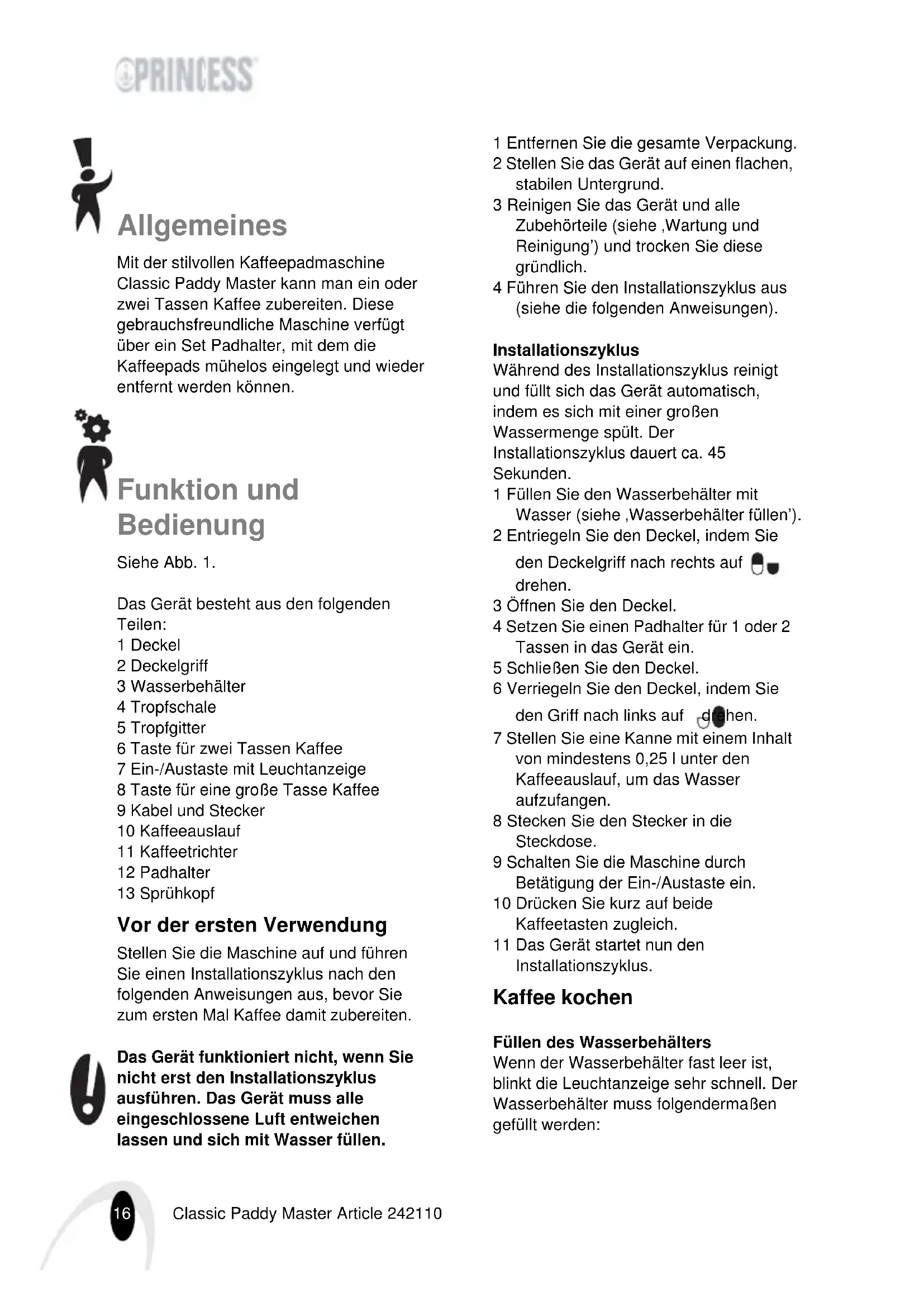 - 2002/96/EC Princess_Classic_Paddy_Master_242110.book Page 15 Thursday, November 1, 2007 2:19 PM16 Classic Paddy Master Article 242110 Allgemeines Mit der stilvollen Kaffeepadmaschine Classic Paddy Master kann man ein oder zwei Tassen Kaffee zubereiten. Diese gebrauchsfreundliche Maschine verfügt über ein Set Padhalter, mit dem die Kaffeepads mühelos eingelegt und wieder entfernt werden können. Funktion und Bedienung Siehe Abb. 1. Das Gerät besteht aus den folgenden Teilen: 1 Deckel 2 Deckelgriff 3 Wasserbehälter 4 Tropfschale 5 Tropfgitter 6 Taste für zwei Tassen Kaffee 7 Ein-/Austaste mit Leuchtanzeige 8 Taste für eine große Tasse Kaffee 9 Kabel und Stecker 10 Kaffeeauslauf 11 Kaffeetrichter 12 Padhalter 13 Sprühkopf Vor der ersten Verwendung Stellen Sie die Maschine auf und führen Sie einen Installationszyklus nach den folgenden Anweisungen aus, bevor Sie zum ersten Mal Kaffee damit zubereiten. Das Gerät funktioniert nicht, wenn Sie nicht erst den Installationszyklus ausführen. Das Gerät muss alle eingeschlossene Luft entweichen lassen und sich mit Wasser füllen. 1 Entfernen Sie die gesamte Verpackung. 2 Stellen Sie das Gerät auf einen flachen, stabilen Untergrund. 3 Reinigen Sie das Gerät und alle Zubehörteile (siehe ‚Wartung und Reinigung’) und trocken Sie diese gründlich. 4 Führen Sie den Installationszyklus aus (siehe die folgenden Anweisungen). Installationszyklus Während des Installationszyklus reinigt und füllt sich das Gerät automatisch, indem es sich mit einer großen Wassermenge spült. Der Installationszyklus dauert ca. 45 Sekunden. 1 Füllen Sie den Wasserbehälter mit Wasser (siehe ‚Wasserbehälter füllen’). 2 Entriegeln Sie den Deckel, indem Sie den Deckelgriff nach rechts auf drehen. 3 Öffnen Sie den Deckel. 4 Setzen Sie einen Padhalter für 1 oder 2 Tassen in das Gerät ein. 5 Schließen Sie den Deckel. 6 Verriegeln Sie den Deckel, indem Sie den Griff nach links auf drehen. 7 Stellen Sie eine Kanne mit einem Inhalt von mindestens 0,25 l unter den Kaffeeauslauf, um das Wasser aufzufangen. 8 Stecken Sie den Stecker in die Steckdose. 9 Schalten Sie die Maschine durch Betätigung der Ein-/Austaste ein. 10 Drücken Sie kurz auf beide Kaffeetasten zugleich. 11 Das Gerät startet nun den Installationszyklus. Kaffee kochen Füllen des Wasserbehälters Wenn der Wasserbehälter fast leer ist, blinkt die Leuchtanzeige sehr schnell. Der Wasserbehälter muss folgendermaßen gefüllt werden: Princess_Classic_Paddy_Master_242110.book Page 16 Thursday, November 1, 2007 2:19 PM17 Classic Paddy Master Article 242110 1 Nehmen Sie den Behälter von der Maschine ab. 2 Füllen Sie den Behälter bis zur MAX- Markierung mit kaltem Wasser. 3 Setzen Sie den Wasserbehälter wieder zurück in die Maschine. Kaffee kochen