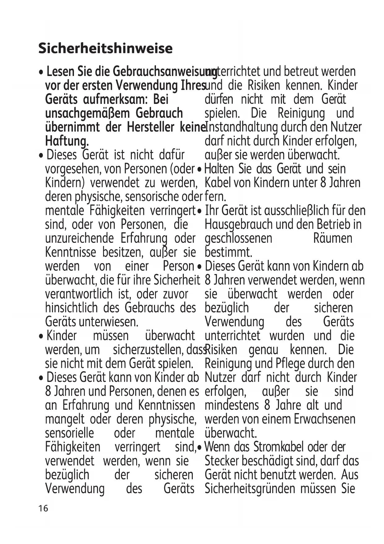 - Dieses Gerät kann von Kindern ab 8 Jahren verwendet werden, wenn sie überwacht werden oder bezüglich der sicheren Verwendung des Geräts unterrichtet wurden und die Risiken genau kennen. Die Reinigung und Pflege durch den Nutzer darf nicht durch Kinder erfolgen, außer sie sind mindestens 8 Jahre alt und werden von einem Erwachsenen überwacht.