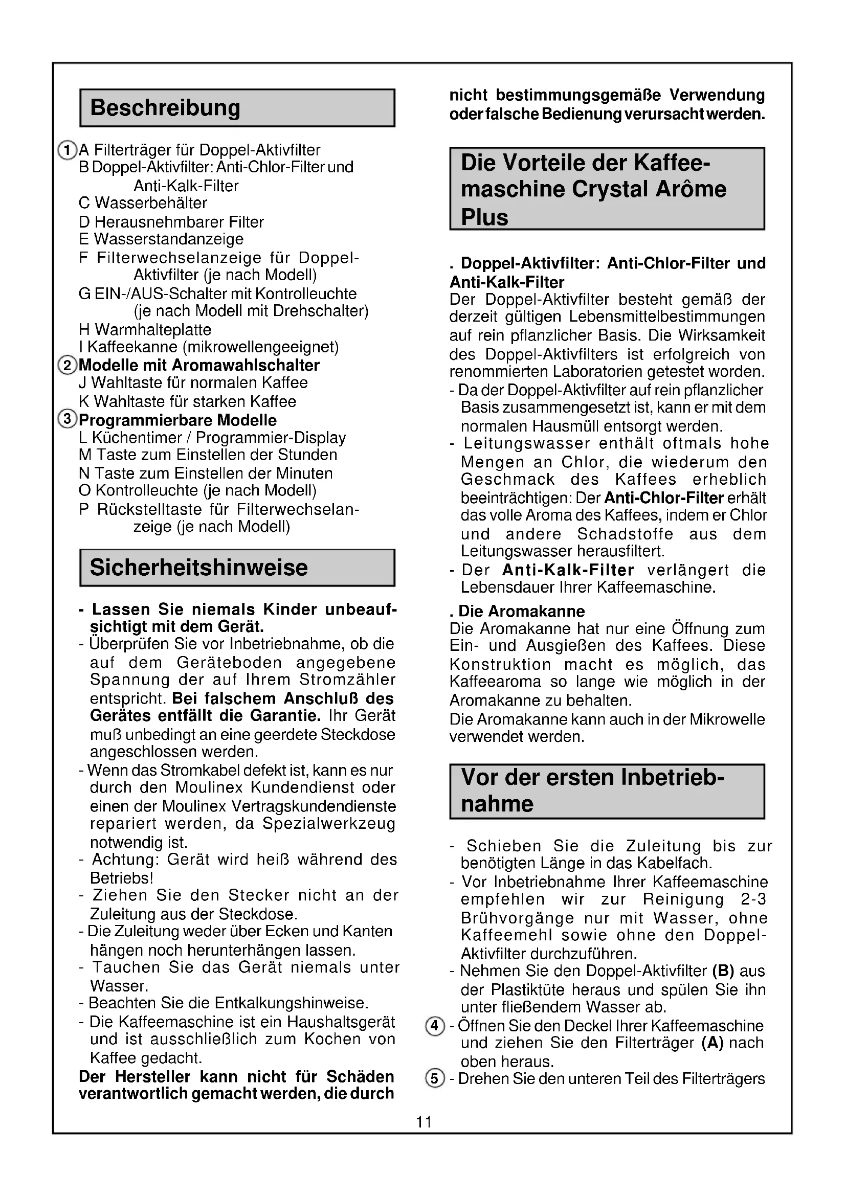 - Plug the appliance in; the display screen will flash. . Setting the time - Turn the button to position - Press button H (M) to set the hour - Press button min (N) to set the minutes . Using in manual mode - Turn the button to ON (G) position - The indicator light (O) will come on - To stop, turn button to OFF (G) position . Using in programme mode To set the time at which you would like your coffee: - Turn the button to PROG position: the symbol will flash on the display - Press button H (M) to set the hour - Press button min (N) to set the minutes - Turn the button to AUTO position: the symbol remains fixed: the appliance is now programmed. At the chosen time, the indicator light (O) will come on and the coffee-machine will start automatically. Attention: If the button stays in AUTO posi- tion, the appliance will start again at the same time every day. . Automatic stop and ‘keep warm’ pro- gramme. When switched on, the automatic stop is programmed for 1 hour. You can prolong the keep warm function for between 1 and 5 hours, in one-hour steps. Programming takes place in OFF position in the following way: - keep min button (N) depressed at the same time press H button (M) to select number of hours to keep warm. Each press of the button (M) increases ‘keep warm’ time by one hour. Maintenance . Changing the ‘Duo Filter’ - Change the filter when indicator light (F) goes red. This indicator light will remain red for 5 uses to let you know it is time to change the filter. It will then go white once more, even if the filter has not been changed. For the programmable model, the indicator light (F) will flash. Stop this by using a pointed utensil to press the button (P) - To change the filter, pivot the lower part of the filter-holder (A), remove the ‘Duo Filter’ from its housing and replace it after rinsing. Important - The ‘Duo Filter’ should only be used with drinking water. - The ‘Duo Filter’ is only suitable for Crystal Aroma Plus coffee-machines. - The absence of a filter will not prevent use of the appliance. - If you foresee not using the appliance for a period of time (holidays etc.) it is recommended that you rinse the ‘Duo Filter’ with running water and clean the coffee-ma- chine carefully. - It is recommended not to leave the filter in place for more than 3 months . Descaling The ‘Duo Filter’, with its anti-scale action, means that you only need to descale the appliance every after every 160 uses ( around 4 months) for fairly hard water, and every 80 uses (around 2 months) for very hard water. - Before descaling, remove the filter holder (A). You can use: . a sachet of anti-scale solution, diluted in 2 large cups of water . 2 large cups of white alcohol vinegar - Pour the mixture into the water tank (C) and start the coffee-machine (without coffee- grounds) - Let the equivalent of a cupful flow into the coffee-pot. - Leave the mixture in the coffee-machine for an hour to take effect - Start the machine again to allow the flow to finish. - Rinse the coffee-machine through, by using 2 or 3 times with clear water (full tank) Attention : Do not leave anti-scale solution within reach of children. Cleaning - Unplug the machine - Never immerse the machine in water or under running water - To remove used coffee grounds, remove the filter holder (D) from the machine - The coffee pot (I) and the removable filter- holder (D) can be cleaned in the dishwasher Accessories - Coffee-pot: code V35 - 2 ‘Duo Filters’: code CW1 - Permanent filter: code A4911 Beschreibung A Filterträger für Doppel-Aktivfilter B Doppel-Aktivfilter: Anti-Chlor-Filter und Anti-Kalk-Filter C Wasserbehälter D Herausnehmbarer Filter E Wasserstandanzeige F Filterwechselanzeige für Doppel- Aktivfilter (je nach Modell) G EIN-/AUS-Schalter mit Kontrolleuchte (je nach Modell mit Drehschalter) H Warmhalteplatte I Kaffeekanne (mikrowellengeeignet) Modelle mit Aromawahlschalter J Wahltaste für normalen Kaffee K Wahltaste für starken Kaffee Programmierbare Modelle L Küchentimer / Programmier-Display M Taste zum Einstellen der Stunden N Taste zum Einstellen der Minuten O Kontrolleuchte (je nach Modell) P Rückstelltaste für Filterwechselan- zeige (je nach Modell) Sicherheitshinweise - Lassen Sie niemals Kinder unbeauf- sichtigt mit dem Gerät. - Überprüfen Sie vor Inbetriebnahme, ob die auf dem Geräteboden angegebene Spannung der auf Ihrem Stromzähler entspricht. Bei falschem Anschluß des Gerätes entfällt die Garantie. Ihr Gerät muß unbedingt an eine geerdete Steckdose angeschlossen werden. - Wenn das Stromkabel defekt ist, kann es nur durch den Moulinex Kundendienst oder einen der Moulinex Vertragskundendienste repariert werden, da Spezialwerkzeug notwendig ist. - Achtung: Gerät wird heiß während des Betriebs! - Ziehen Sie den Stecker nicht an der Zuleitung aus der Steckdose. - Die Zuleitung weder über Ecken und Kanten hängen noch herunterhängen lassen. - Tauchen Sie das Gerät niemals unter Wasser. - Beachten Sie die Entkalkungshinweise. - Die Kaffeemaschine ist ein Haushaltsgerät und ist ausschließlich zum Kochen von Kaffee gedacht. Der Hersteller kann nicht für Schäden verantwortlich gemacht werden, die durch nicht bestimmungsgemäße Verwendung oder falsche Bedienung verursacht werden. Die Vorteile der Kaffee- maschine Crystal Arôme Plus . Doppel-Aktivfilter: Anti-Chlor-Filter und Anti-Kalk-Filter Der Doppel-Aktivfilter besteht gemäß der derzeit gültigen Lebensmittelbestimmungen auf rein pflanzlicher Basis. Die Wirksamkeit des Doppel-Aktivfilters ist erfolgreich von renommierten Laboratorien getestet worden. - Da der Doppel-Aktivfilter auf rein pflanzlicher Basis zusammengesetzt ist, kann er mit dem normalen Hausmüll entsorgt werden. - Leitungswasser enthält oftmals hohe Mengen an Chlor, die wiederum den Geschmack des Kaffees erheblich beeinträchtigen: Der Anti-Chlor-Filter erhält das volle Aroma des Kaffees, indem er Chlor und andere Schadstoffe aus dem Leitun