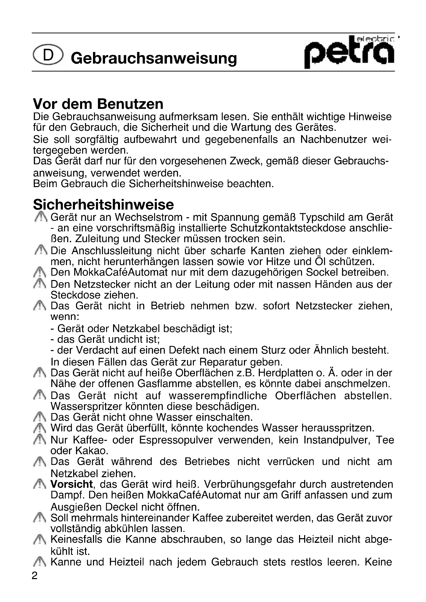 - Aus dem Sicherheitsventil entweicht Dampf Der Kaffee ist zu fein gemahlen. Sollte die Störung nicht behoben werden können, das Gerät zur Reparatur geben. Garantie-Information Für unsere Geräte übernehmen wir gegenüber dem Endkunden eine 24- monatige Haltbarkeitsgarantie. Sie beginnt mit dem Kauf des Gerätes durch den Endkunden und gilt im Gebiet der Bundesrepublik Deutschland. Ansprüche aus dieser Garantie sind unter Vorlage des Kaufbelegs direkt gegenüber unserem zentralen Kundendienst geltend zu machen. Von der Garantie ausgeschlossen sind Schäden durch normalen Verschleiß, unsachgemäßen Gebrauch, Nichteinhaltung der Entkalkungsanweisung sowie unterbliebene Pflege. Der Endkunde besitzt zusätzlich zu den Ansprüchen aus dieser Garantie gesetzliche Ansprüche wegen Mängeln des Gerätes gegenüber seinem direkten Verkäufer/Händler, die durch diese Garantie nicht eingeschränkt werden. petra-electric Kundendienst Greisbacherstr.6 89331 Burgau www.petra-electric.de Das Gerät entspricht den Europäischen Richtlinien 73/23/EWG und 89/336/EWG. Dieses Produkt darf am Ende seiner Lebensdauer nicht über den normalen Haushaltsabfall entsorgt werden, sondern muss an einem Sammelpunkt für das Recycling von elektrischen und elektroni- schen Geräten abgegeben werden. 6Die Werkstoffe sind gemäß ihrer Kennzeichnung wiederverwertbar. Mit der Wiederverwendung, der stofflichen Verwertung oder anderen Formen der Verwertung von Altgeräten leisten Sie einen wichtigen Beitrag zum Schutze unserer Umwelt. Bitte erfragen Sie bei der Gemeindeverwaltung die zuständige Entsorgungs- stelle. Änderungen vorbehalten 7Before Using Read these instructions carefully. They contain important notes for the use, safety and maintenance of the appliance. Keep them in a safe place and transfer them to a possible succeeding user. Only use the appliance for the purpose mentioned in these instructions. When using pay particular attention to the following safety advice. Safety Advice Connect the appliance to alternating current only - with a rated voltage according to the rating plate - to a correctly installed earthed socket. Cord and plug must be completely dry. Do not pull the connection cord over sharp edges or jam it, do not allow it to hang down and protect it from heat and oil. Only use the Mocha Coffee Maker with the corresponding base. Do not pull out the plug by the cord or touch it with wet hands. If the following happens do not use the kettle and unplug it immediately: - the kettle or cord is damaged - the appliance leaks - any defect after a plunge or something similar is suspected. In these cases have the appliance repaired. Do not place the appliance onto hot surfaces, e.g. hot plate, etc. or near gas flames, it may melt. Do not place the appliance onto surfaces sensitive to water. Water splas- hes could damage it. Do not use the appliance without water. If the coffee-maker is overfilled, boiling water may be ejected. Only use coffee and espresso powder, never use instant powder, tea or cacao. Do not move the appliance and do not pull at the cord during use. Caution: The appliance will become hot during use. Scalding danger due to escaping steam! Only touch the hot Mocha Coffee Maker by the handle and do not open the lid when pouring out. In case coffee should be prepared several times in succession, cool down the appliance completely in advance. You must not unscrew the jug as long as the heating element has not cooled down. After every use, always empty the jug and the container completely. Do not leave remaining liquids in the appliance for longer time. Children are not aware of the dangers that can be caused by electrical appliances. Therefore never leave the appliance unattended during use. Use and store the device out of reach of children.