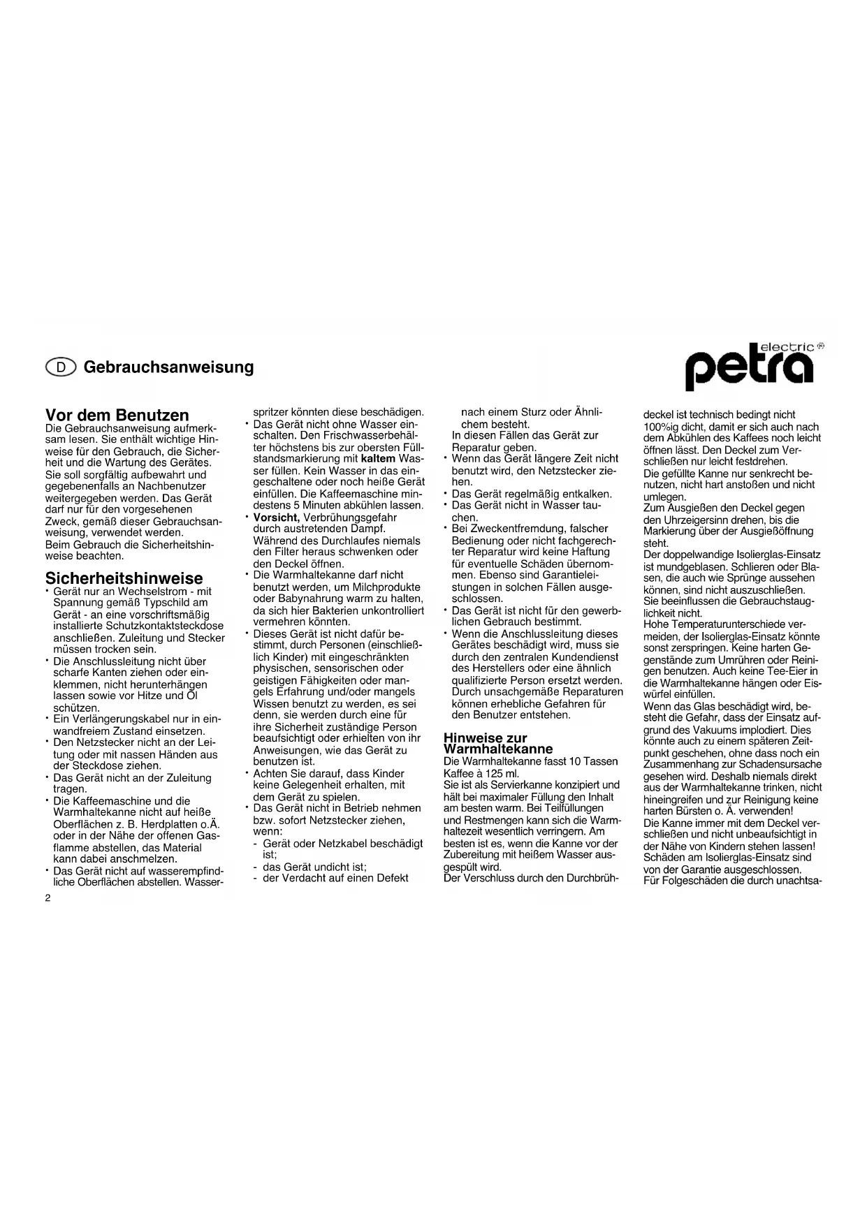 Gebrauchsanweisung3 men Umgang entstehen, wird keine Haftung übernommen. Isolierglas-Einsatz austauschen Einen Ersatz-Isolierglas-Einsatz be- kommen Sie dort, wo das Gerät gekauft wurde, oder Sie bestellen direkt bei petra-electric. Geben Sie dazu die genaue Typbezeichnung an. Sie fin- den Sie am Boden des Gerätes. Beim Auswechseln des Isolierglas- Einsatzes Schutzbrille und Schutz- handschuhe tragen und darauf achten, dass sich keine Personen in der Nähe befinden. Den Boden der Warmhaltekanne linksdrehend abschrauben und den Glaseinsatz herausnehmen. Die Gum- midichtung auf den Rand des neuen Isolierglas-Einsatzes auflegen, dann den Einsatz in das Gehäuse einschie- ben und mit dem Boden rechtsdrehend festschrauben. Der Angusszapfen des Glaskolbens ist extrem empfindlich, er darf nicht beschädigt werden. Inbetriebnahme Vor der Erstbenutzung und nachdem das Gerät längere Zeit außer Betrieb war, 2 Kochvorgänge mit maximaler Wasserfüllung ohne Kaffeemehl durchführen und anschließend Filter und Kanne heiß ausspülen. Kaffeezubereitung Kaltes Wasser in den Frischwasser- behälter einfüllen. Die Anzahl der zu brühenden Tassen kann an der Wasserstandsanzeige abgelesen werden. Die sich ergebende Kaffee- menge beträgt ca. 125 ml pro Tasse. Filterrahmen nach vorn schwenken und Papierfilter der Größe 1 x 4 in den Filter setzen, zuvor jedoch den Prägerand falten. Die Filtertüte darf nicht über den Rand stehen, deshalb mit der Hand leicht andrücken. Erfor- derliche Menge Kaffeemehl einfül- len. Pro Tasse je nach persönlichem Geschmack ca. 5 - 7 Gramm mittel- fein gemahlener Kaffee. Die Warmhaltekanne mit verschlos- senem Durchbrühdeckel unter den Filter schieben. Netzstecker an eine Schutzkontakt- steckdose anschließen und Schalter betätigen. Die Kontrollleuchte signali- siert den Beginn des Brühvorganges. Nach Beendigung des Durchlaufes das Gerät ausschalten und die Kanne entnehmen. Der TropfStopp verhindert, dass Kaffee nachtropft. Der TropfStopp verhindert, dass Kaf- fee nachtropft. Bevor erneut Kaffee zubereitet wer- den kann, muß das Gerät einige Minuten abkühlen. Löslicher Kaffee wird ohne Papier direkt in den Filter gegeben. Tee wird zubereitet, indem die Beu- tel in die Kanne gehängt werden. Dabei ist der leere Filter in den Fil- terrahmen zu setzen. Reinigung und Pflege Netzstecker ziehen und das Gerät abkühlen lassen. Das Gerät und die Warmhaltekanne nicht in Wasser tauchen, sondern mit einem feuchten Tuch, dem etwas Spülmittel beigegeben wird, abwischen und anschließend trockenreiben. Der Filter wird unter fließendem Was- ser oder in der Spülmaschine gereinigt. Die Kanne innen nach jeder Benut- zung nur mit warmem Wasser aus- spülen. Sie darf keinesfalls in die Spülmaschine gegeben werden. Sollte sich nach längerer Zeit ein Belag in der Kanne angesetzt haben, kann dieser mit einer Zahn- ersatz-Reinigungstablette schonend entfernt werden: Wasser einfüllen, Tablette dazuge- ben und mehrere Stunden wirken lassen. Danach mehrmals ausspülen. Keine scharfen und scheuernden Reinigungsmittel verwenden. Entkalken Das Gerät muss, wie alle Heißwas- sergeräte, regelmäßig entkalkt wer- den, spätestens bei wesentlich ver- längerter Brühzeit oder vermehrter Geräuschbildung. Die folgenden Angaben sind Richt- werte, die sich auf einen täglichen Gebrauch im Haushalt beziehen: Härte- Härte Entkalkungs-bereich abstände1 weich 0 - 7° dH alle 6 Monate2 mittel >7 - 14° dH alle 3 Monate3 hart >14 - 21° dH alle 6 Wochen4 sehr hart >21° dH monatlich 1° dH entspricht ca. 0,18 mmol/l Ca- und Mg-Ionen Den Härtebereich in Ihrer Wohnge- gend können Sie beim zuständigen Wasserwerk oder der kommunalen Verwaltung erfragen. Ein handelsübliches Entkalkungsmit- tel nach der Anwendungsvorschrift des Herstellers verwenden. Papierfilter einlegen und Kanne in die Maschine stellen. Das nach Her- stellerangabe verdünnte oder aufge- löste Entkalkungsmittel höchstens bis zur maximal möglichen Tassen- anzahl in den Frischwasserbehälter füllen. Wenn das Gerät während des Durchlaufes mehrmals für einige Minuten ausgeschaltet wird, kann der Entkalker optimal wirken. Den Vorgang mit jeweils frischem Entkalker so oft wiederholen, bis die störende Geräuschbildung beseitigt ist. Niemals heiße Entkalkerlösung in das Gerät einfüllen. Achtung, nach dem Entkalken unbedingt 2 - 3 mal eine maximale Frischwasserfüllung durchkochen. Für Schäden, die durch Nichtbeach- tung der Entkalkungsvorschrift entste- hen, besteht kein Garantieanspruch. Garantie-Information Für unsere Geräte übernehmen wir gegenüber dem Endkunden eine 24-monatige Haltbarkeitsgarantie. Sie beginnt mit dem Kauf des Gerä- tes durch den Endkunden und gilt im Gebiet der Bundesrepublik Deutsch- land. Ansprüche aus dieser Garantie sind4 unter Vorlage des Kaufbelegs direkt gegenüber unserem zentralen Kun- dendienst geltend zu machen. Von der Garantie ausgeschlossen sind Schäden durch normalen Ver- schleiß, unsachgemäßen Gebrauch, Nichteinhaltung der Entkalkungsan- weisung, unterbliebene Pflege, sowie Glasbruch. Der Endkunde besitzt zusätzlich zu den Ansprüchen aus dieser Garantie gesetzliche Ansprüche wegen Män- geln des Gerätes gegenüber seinem direkten Verkäufer/Händler, die durch diese Garantie nicht einge- schränkt werden. petra - electric Kundendienst Greisbacherstraße 6 D-89331 Burgau www. petra-electric.de Das Gerät entspricht den Europäischen Richtlinien 2006/95/EG und 89/336/EWG. Dieses Produkt darf am Ende seiner Lebensdauer nicht über den normalen Haus- haltsabfall entsorgt werden, sondern muss an einem Sammelpunkt für das Recycling von elektrischen und elektronischen Geräten abgegeben werden. Die Werkstoffe sind gemäß ihrer Kennzeichnung wiederverwertbar. Mit der Wiederverwendung, der stofflichen Verwertung oder anderen Formen der Verwertung von Altgerä- ten leisten Sie einen wichtigen Bei- trag zum Schutze unserer Umwelt. Bitte erfragen Sie bei der Gemeinde- v