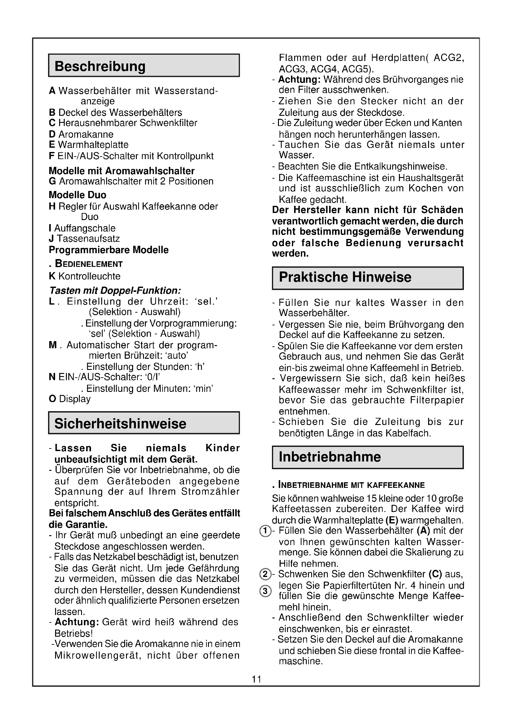 Beschreibung A Wasserbehälter mit Wasserstand- anzeige B Deckel des Wasserbehälters C Herausnehmbarer Schwenkfilter D Aromakanne E Warmhalteplatte F EIN-/AUS-Schalter mit Kontrollpunkt Modelle mit Aromawahlschalter G Aromawahlschalter mit 2 Positionen Modelle Duo H Regler für Auswahl Kaffeekanne oder Duo I Auffangschale J Tassenaufsatz Programmierbare Modelle . BEDIENELEMENT K Kontrolleuchte Tasten mit Doppel-Funktion: L . Einstellung der Uhrzeit: ‘sel.’ (Selektion - Auswahl) . Einstellung der Vorprogrammierung: ‘sel’ (Selektion - Auswahl) M . Automatischer Start der program- mierten Brühzeit: ‘auto’ . Einstellung der Stunden: ‘h’ N EIN-/AUS-Schalter: ‘0/I’ . Einstellung der Minuten: ‘min’ O Display Sicherheitshinweise - Lassen Sie niemals Kinder unbeaufsichtigt mit dem Gerät. - Überprüfen Sie vor Inbetriebnahme, ob die auf dem Geräteboden angegebene Spannung der auf Ihrem Stromzähler entspricht. Bei falschem Anschluß des Gerätes entfällt die Garantie. - Ihr Gerät muß unbedingt an eine geerdete Steckdose angeschlossen werden. - Falls das Netzkabel beschädigt ist, benutzen Sie das Gerät nicht. Um jede Gefährdung zu vermeiden, müssen die das Netzkabel durch den Hersteller, dessen Kundendienst oder ähnlich qualifizierte Personen ersetzen lassen. - Achtung: Gerät wird heiß während des Betriebs! -Verwenden Sie die Aromakanne nie in einem Mikrowellengerät, nicht über offenen Flammen oder auf Herdplatten( ACG2, ACG3, ACG4, ACG5). - Achtung: Während des Brühvorganges nie den Filter ausschwenken. - Ziehen Sie den Stecker nicht an der Zuleitung aus der Steckdose. - Die Zuleitung weder über Ecken und Kanten hängen noch herunterhängen lassen. - Tauchen Sie das Gerät niemals unter Wasser. - Beachten Sie die Entkalkungshinweise. - Die Kaffeemaschine ist ein Haushaltsgerät und ist ausschließlich zum Kochen von Kaffee gedacht. Der Hersteller kann nicht für Schäden verantwortlich gemacht werden, die durch nicht bestimmungsgemäße Verwendung oder falsche Bedienung verursacht werden. Praktische Hinweise - Füllen Sie nur kaltes Wasser in den Wasserbehälter. - Vergessen Sie nie, beim Brühvorgang den Deckel auf die Kaffeekanne zu setzen. - Spülen Sie die Kaffeekanne vor dem ersten Gebrauch aus, und nehmen Sie das Gerät ein-bis zweimal ohne Kaffeemehl in Betrieb. - Vergewissern Sie sich, daß kein heißes Kaffeewasser mehr im Schwenkfilter ist, bevor Sie das gebrauchte Filterpapier entnehmen. - Schieben Sie die Zuleitung bis zur benötigten Länge in das Kabelfach. Inbetriebnahme
