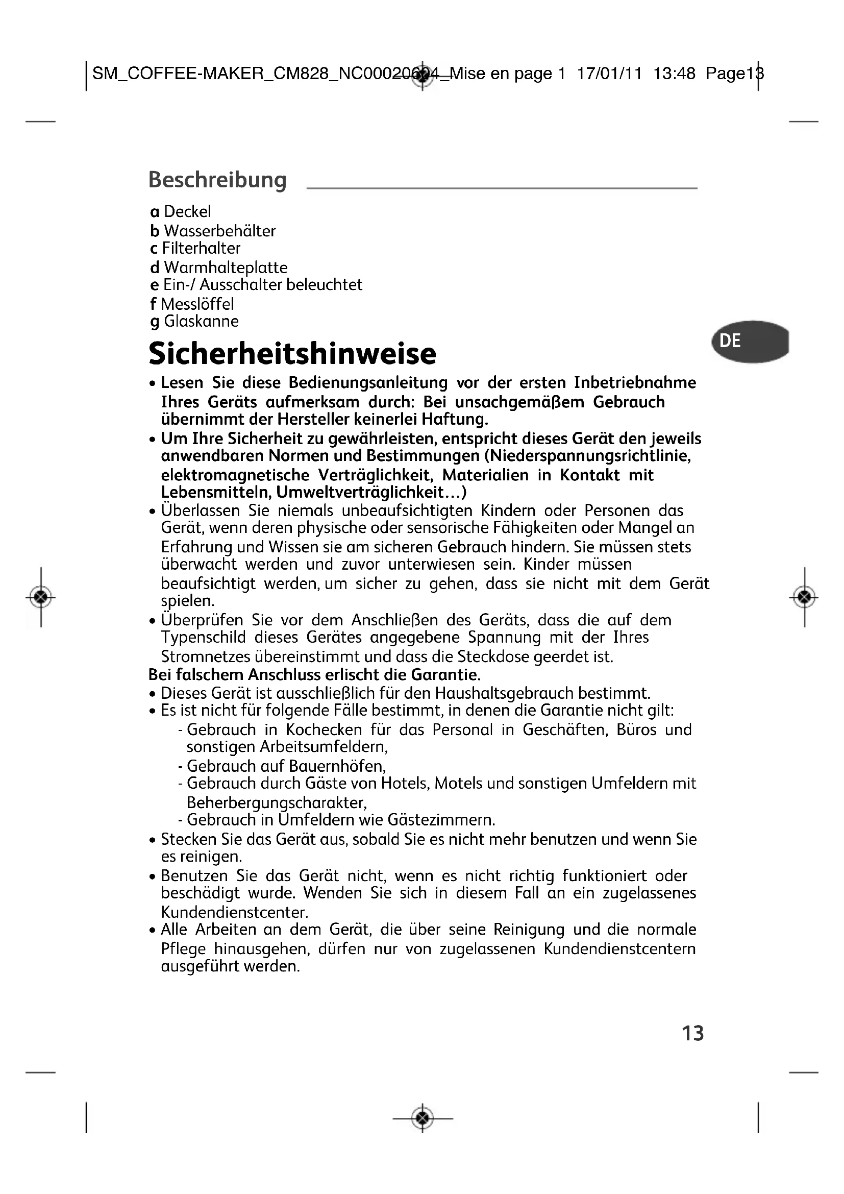 - Alle Arbeiten an dem Gerät, die über seine Reinigung und die normale Pflege hinausgehen, dürfen nur von zugelassenen Kundendienstcentern ausgeführt werden. SM_COFFEE-MAKER_CM828_NC00020604_Mise en page 1 17/01/11 13:48 Page1314