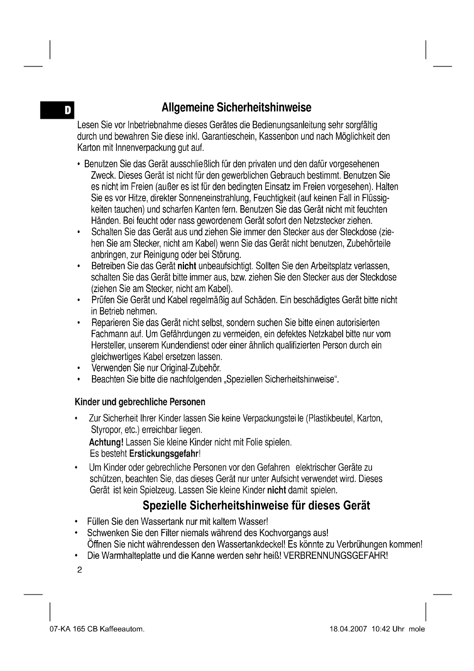 - Beachten Sie bitte die nachfolgenden „Speziellen Sicherheitshinweise“. 07-KA 165 CB Kaffeeautom. 18.04.2007 10:42 Uhr mole Kinder und gebrechliche Personen