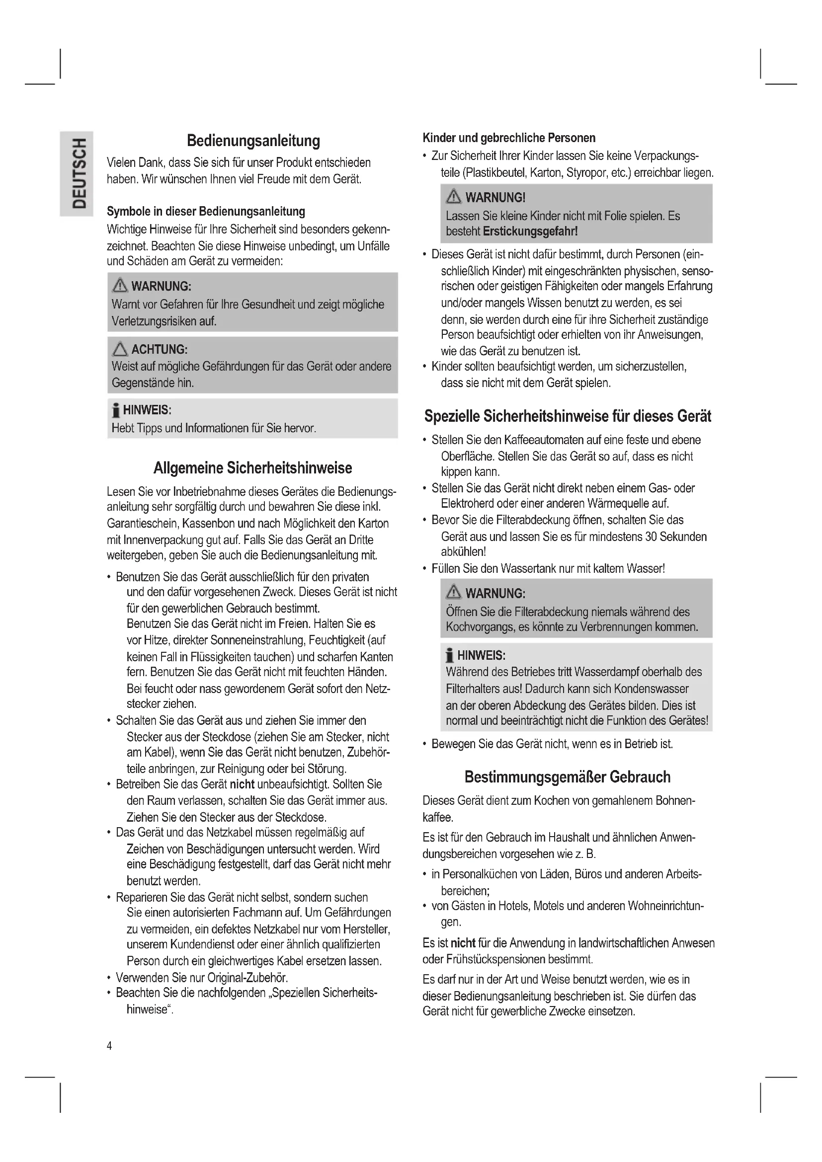 - Bewegen Sie das Gerät nicht, wenn es in Betrieb ist. Bestimmungsgemäßer Gebrauch Dieses Gerät dient zum Kochen von gemahlenem Bohnen- kaffee. Es ist für den Gebrauch im Haushalt und ähnlichen Anwen- dungsbereichen vorgesehen wie z. B.