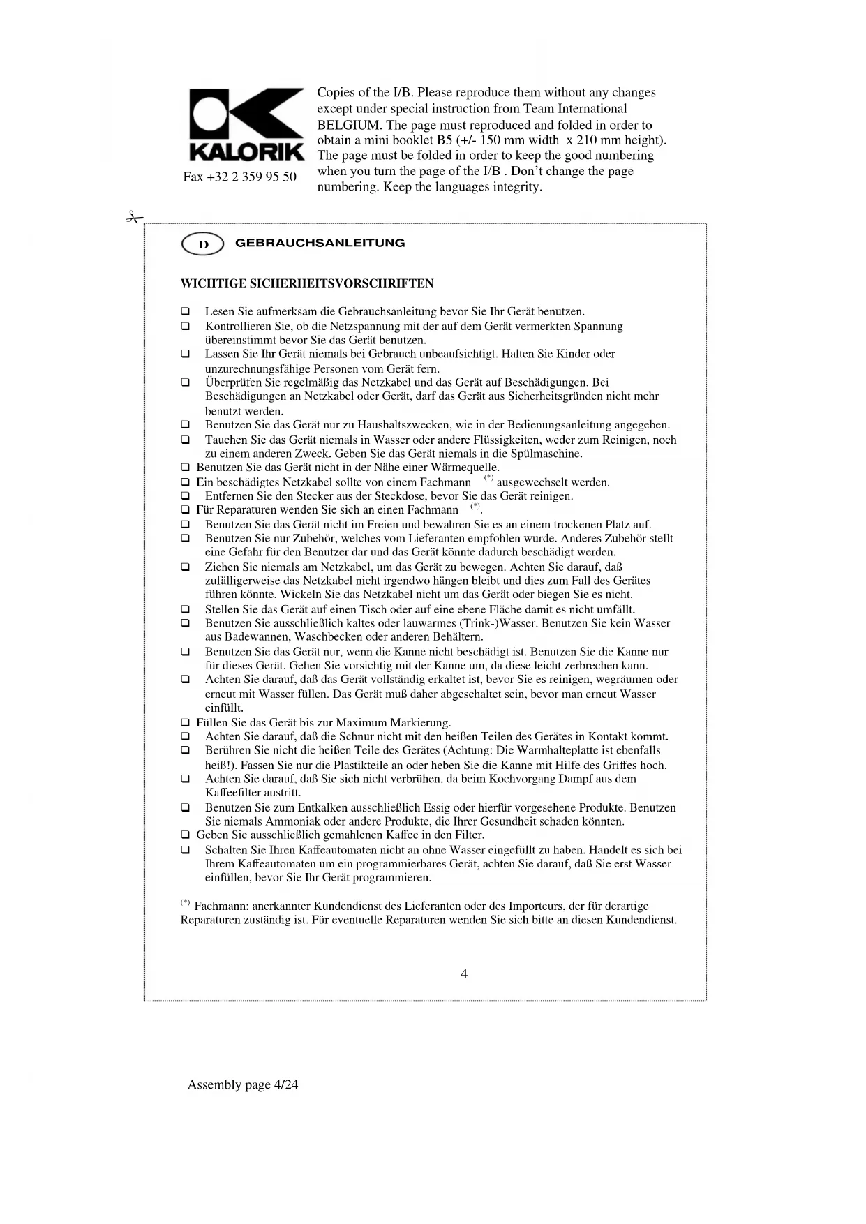 Die Kanne kann auf der Kochplatte bleiben (es sei denn sie ist leer). Die Kochplatte wärmt bis Sie die Kaffeemaschine ausschalten oder die Kaffeemaschine sich automatisch ausschaltet. ENTKALKUNG Wir empfehlen Ihnen, zur Verlängerung der Lebensdauer, regelmäßig das Gerät zu entkalken. Verwenden Sie hierzu nur handelsübliche Entkalkungsmittel und beachten Sie die entsprechenden Gebrauchsanweisungen. Niemals Gerät und Zubehör in die Spülmaschine stellen. REINIGUNG Achten Sie darauf, daß die Kaffeemaschine vom Stromnetz getrennt ist und die Warmhalteplatte abgekühlt ist, ehe Sie die Kaffeemaschine reinigen. Spülen Sie den Filterhalter und die Kanne in Spülwasser. Reinigen Sie das Gerät selbst mit einem feuchten Tuch. Benutzen Sie niemals einen Topfkratzer oder Scheuermittel, um das Gerät zu reinigen.Copies of the I/B. Please reproduce them without any changes except under special instruction from Team International BELGIUM. The page must reproduced and folded in order to obtain a mini booklet B5 (+/- 150 mm width x 210 mm height). The page must be folded in order to keep the good numbering when you turn the page of the I/B . Don’t change the page numbering. Keep the languages integrity.